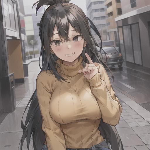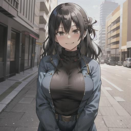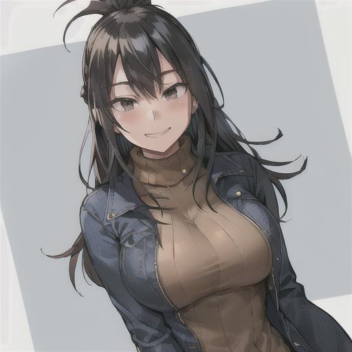 nana shimura, 1girl, solo, long hair, breasts, looking at viewer, blush, smile, bangs, black hair, jacket, upper body, braid, medium hair, mole, grin, black eyes, sweater, v, turtleneck, denim, blue jacket, mole under mouth, red nails, ribbed sweater, brown background, turtleneck sweater, yellow sweater