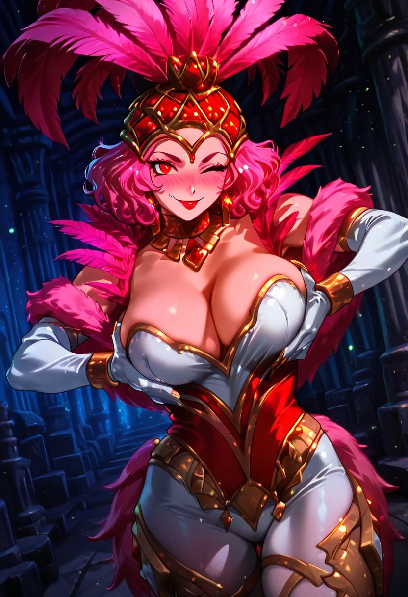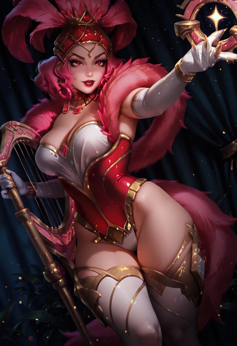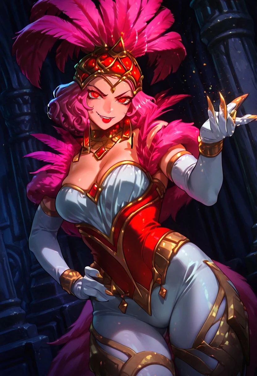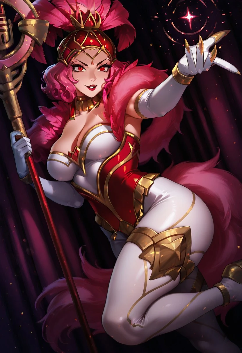 ShowstopperWhitemaneHoTS, 1girl, solo, curvy body, hair ornament, hat with pink feathers, pink hair, curly hair, red eyes, full lips, makeup, red lipstick, large breasts, white cleavage, pink fur trim, pink corset, large butt, thick thighs, white pantyhose, white elbow gloves, jewelry, shoes, magic staff, necklace, earrings, golden claws, shine dress,