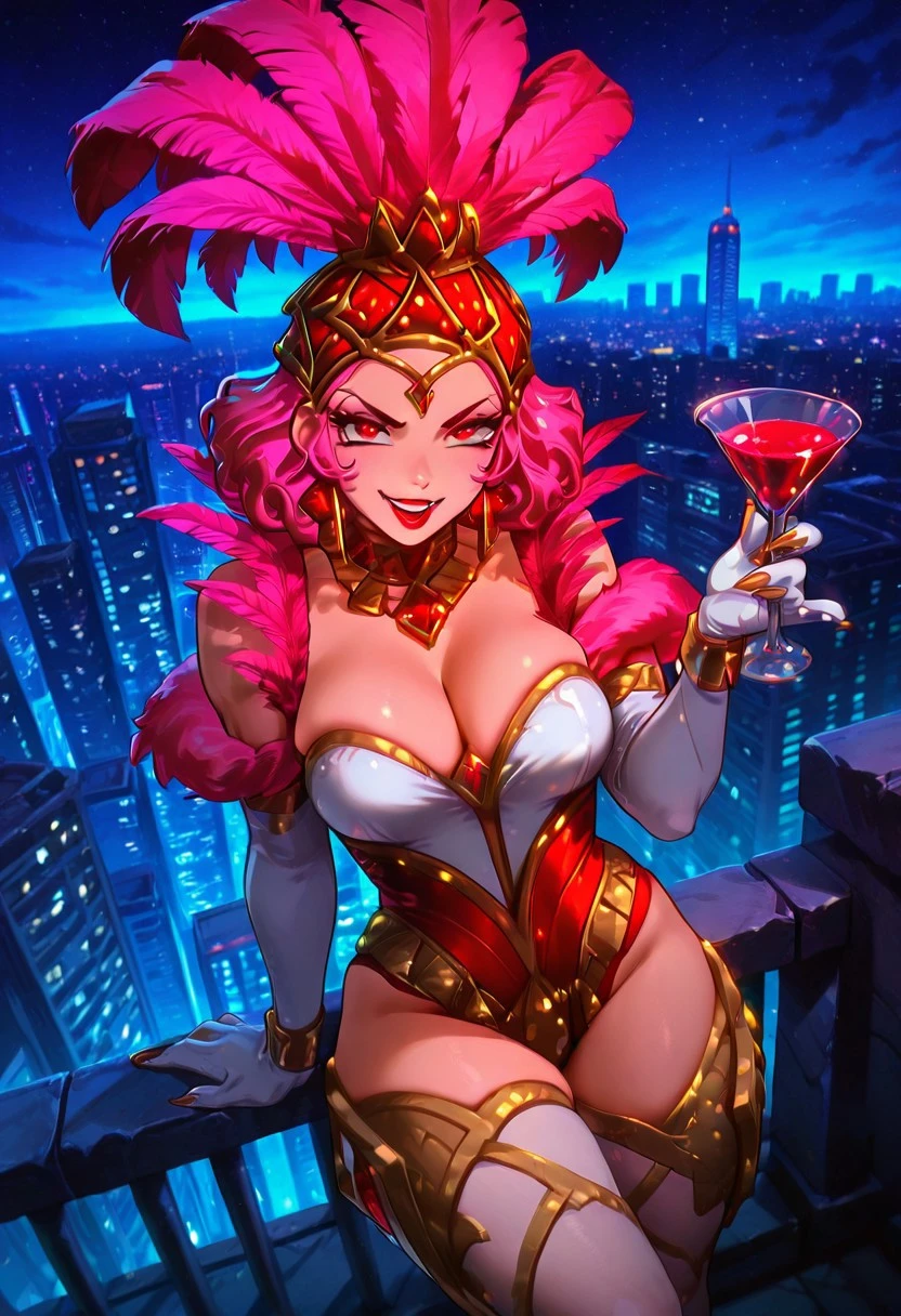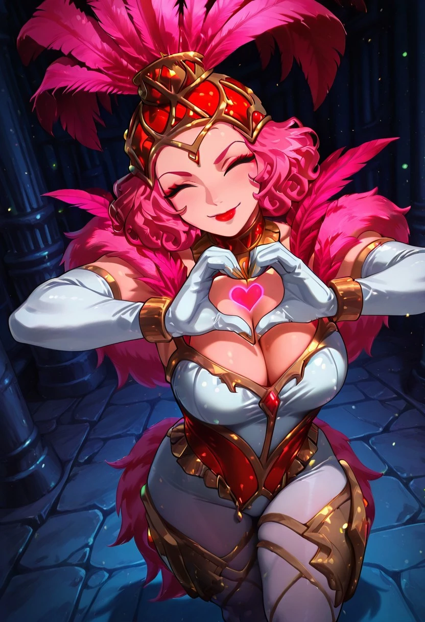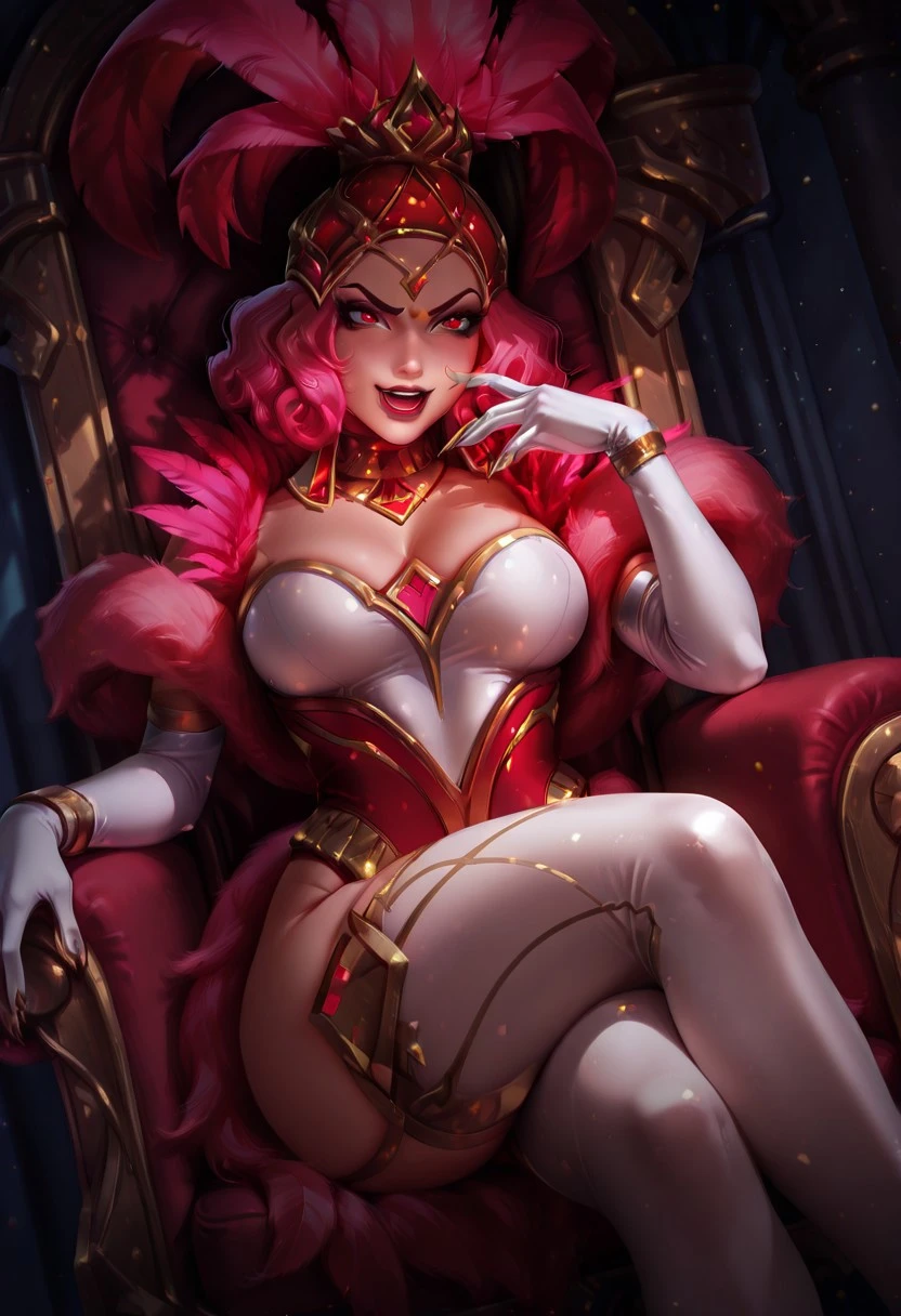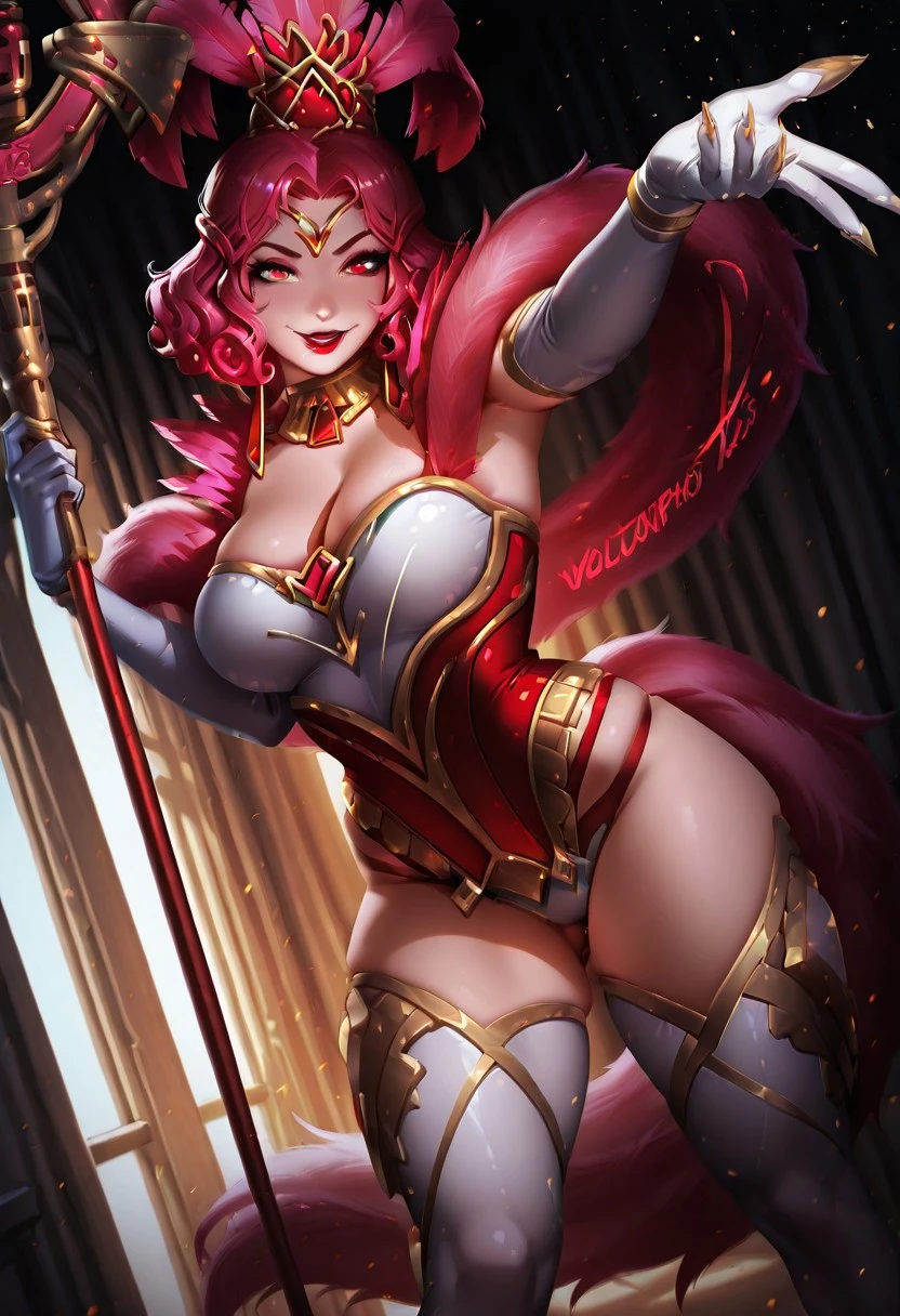 ShowstopperWhitemaneHoTS, 1girl, solo, curvy body, hair ornament, hat with pink feathers, pink hair, curly hair, red eyes, full lips, makeup, red lipstick, large breasts, white cleavage, pink fur trim, pink corset, large butt, thick thighs, white pantyhose, white elbow gloves, jewelry, shoes, magic staff, necklace, earrings, golden claws, shine dress,