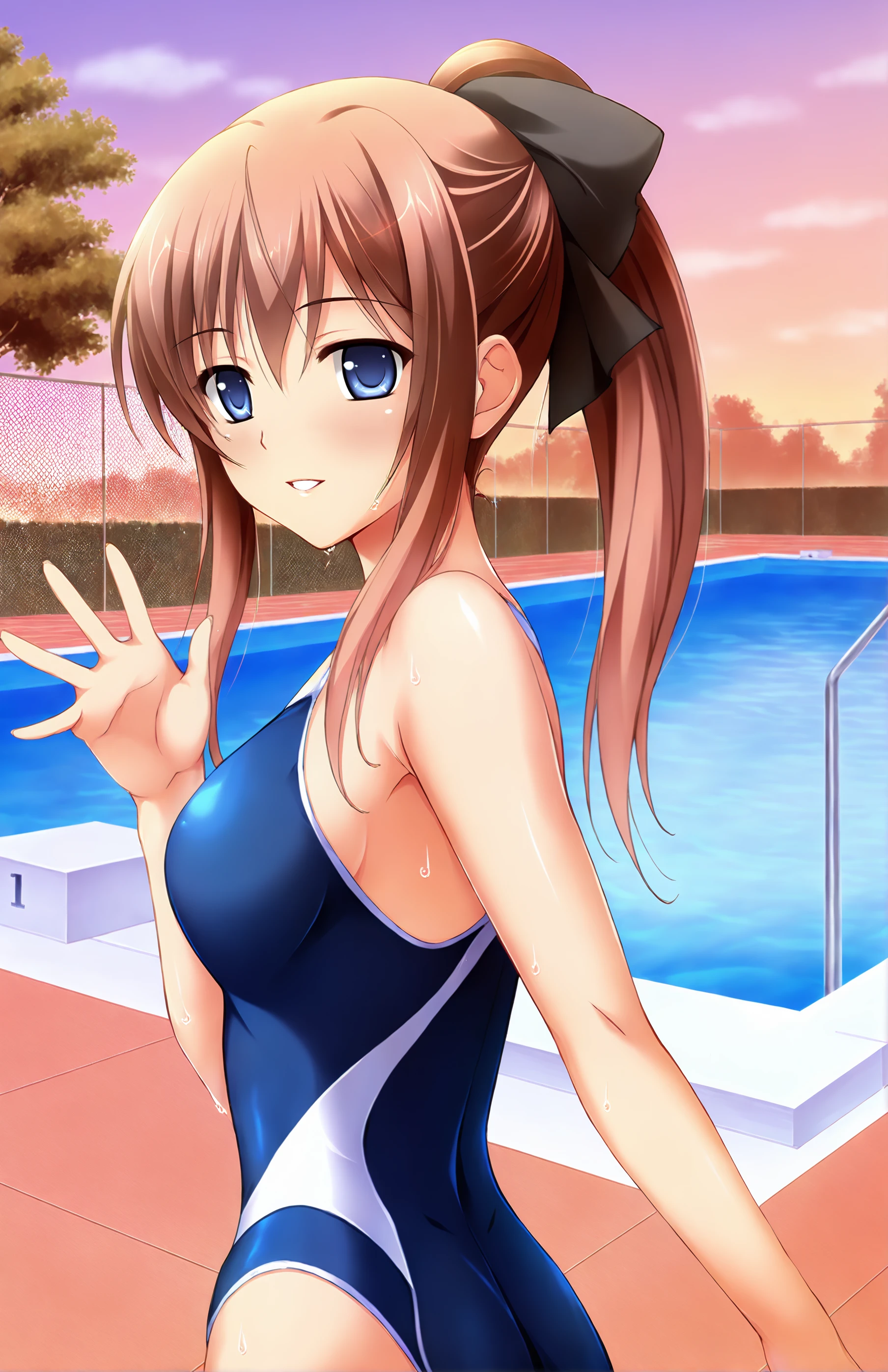 TokuyamaMomoka, long hair, blue eyes, brown hair, blue swimsuit, ponytail, hair bow, black bow, one-piece swimsuit, competition swimsuit