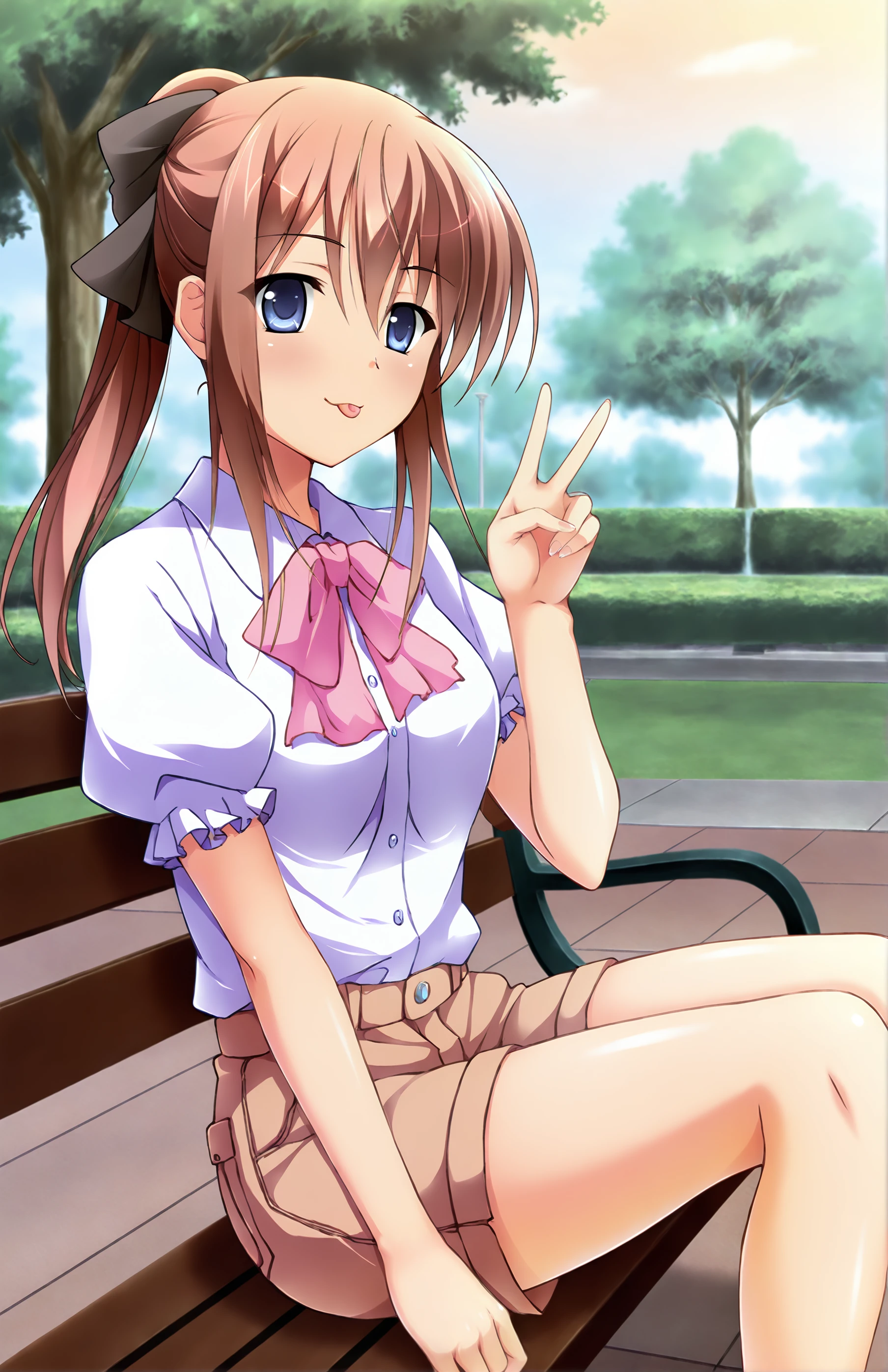 TokuyamaMomoka, long hair, blue eyes, skirt, brown hair, blue bow, school uniform, white shirt, ponytail, hair bow, black bow, pleated skirt, plaid, plaid skirt