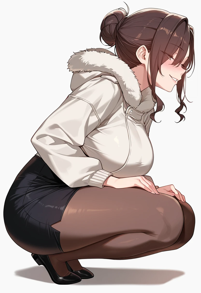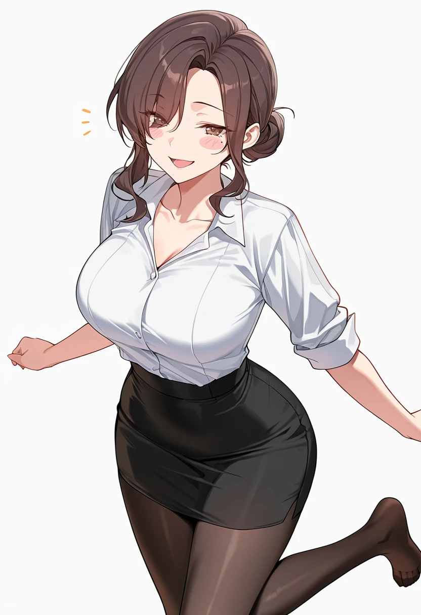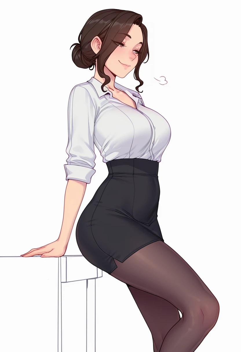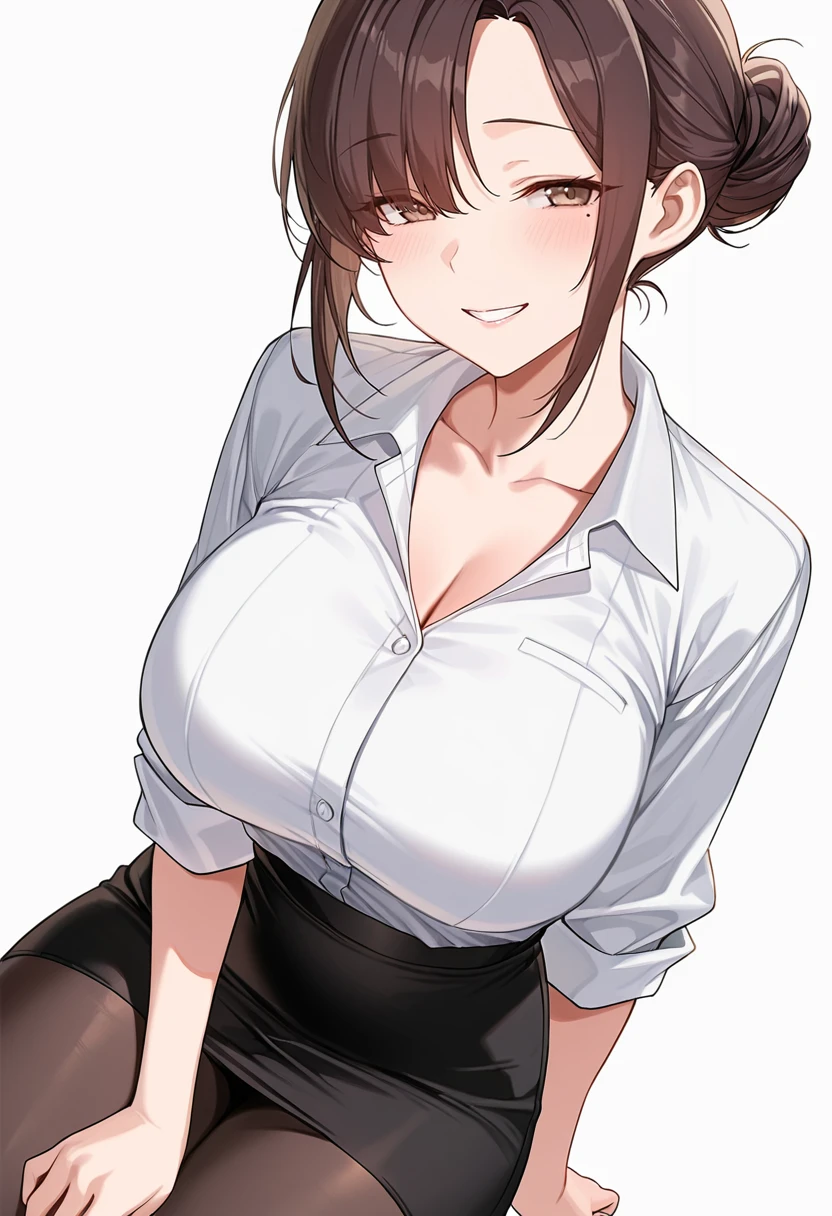 collarbone, white collared shirt,sleeves rolled up, shirt tucked in,black pencil skirt, high-waist skirt,black pantyhose, office lady,high heels,Explanation and notes below👇
