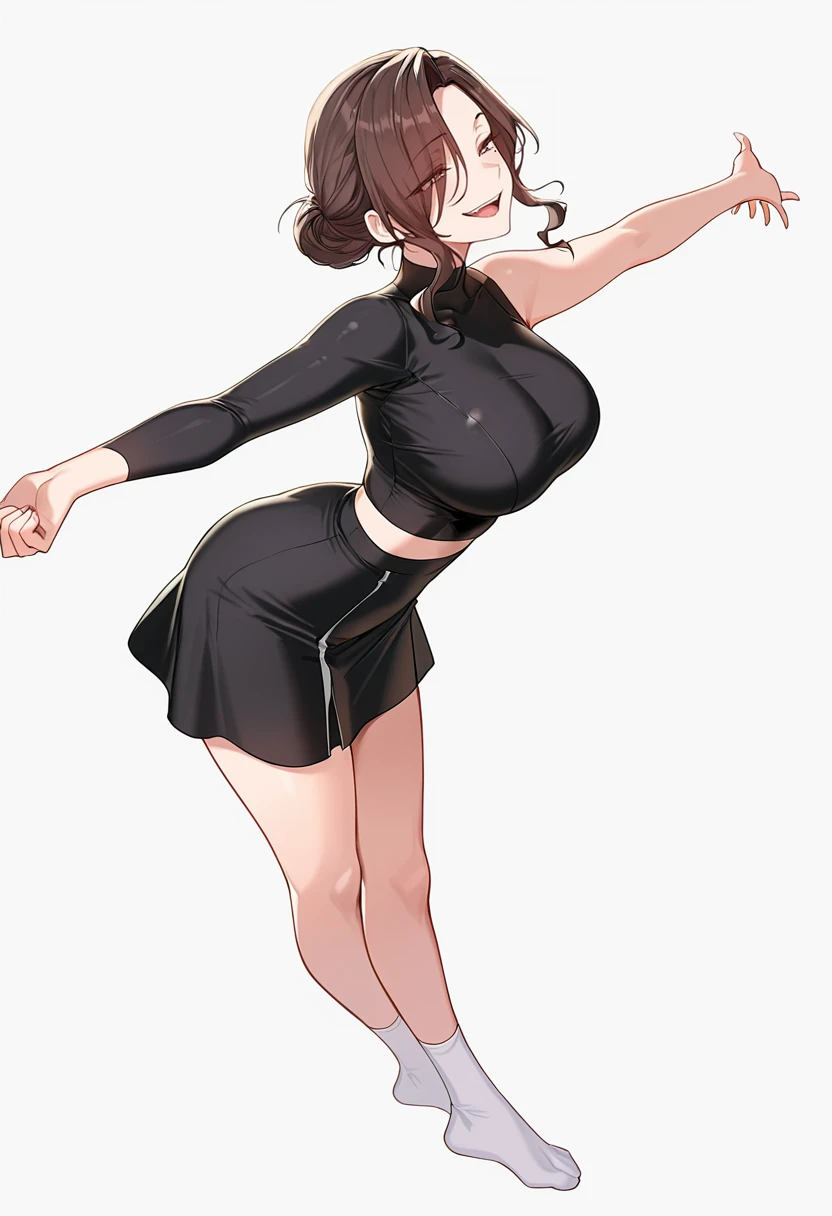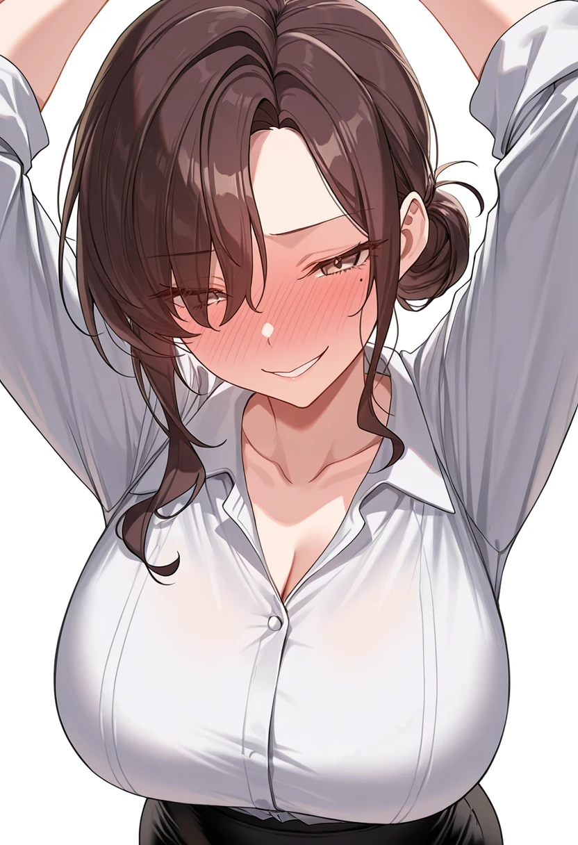 hyun-mi_cnr, 1girl,brown hair,single hair bun,sidelocks,mole under eye, large breasts,mature female, eyes visible through hair,wavy hair, 👗Default Outfit