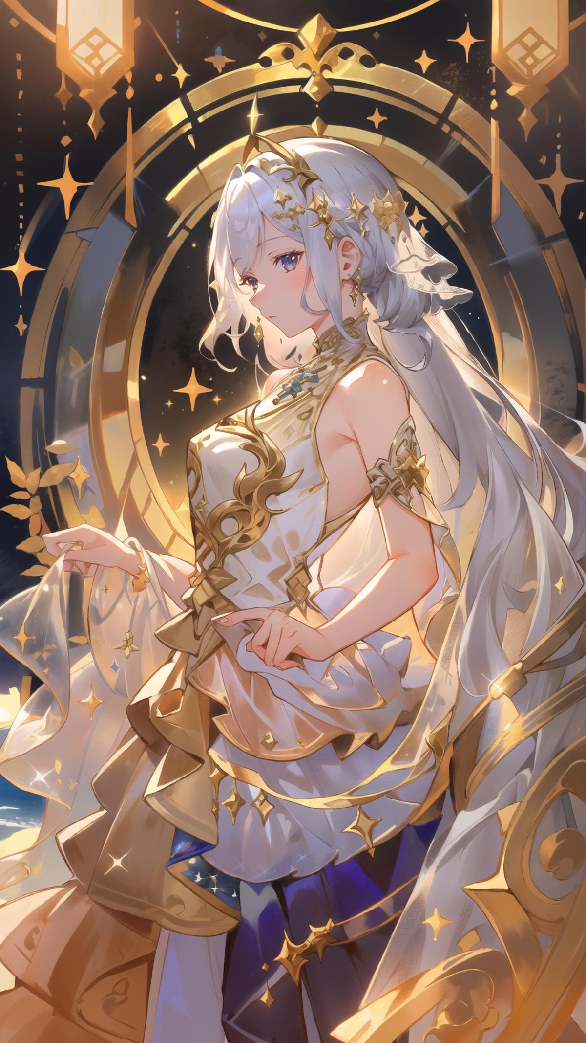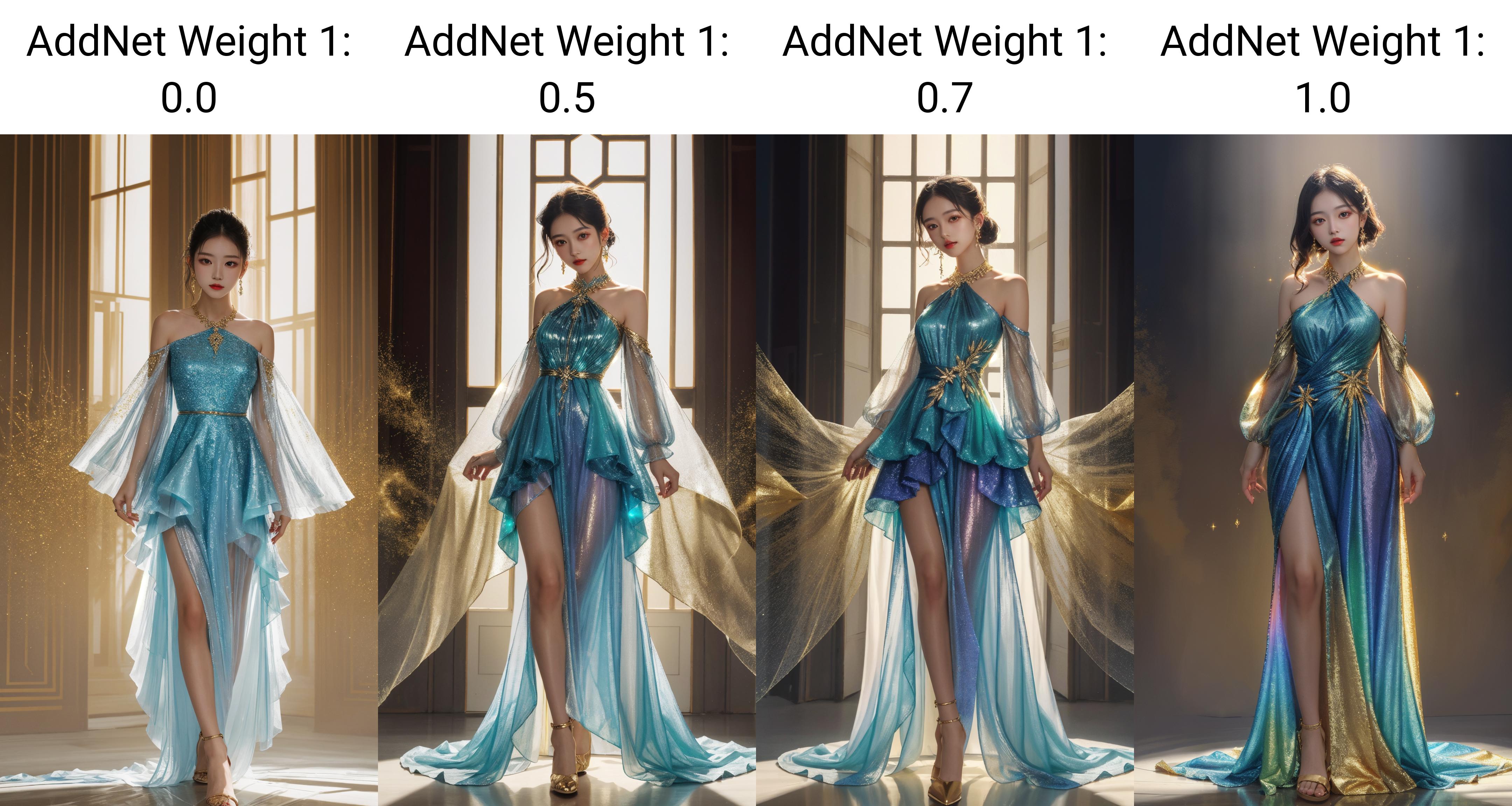 这个lora主要影响服装的板型和材质,穿戴装饰品。次要影响背景,出现一些宫廷的元素;还会影响光感,会使轮廓光更明显;基本不影响脸部和动作。