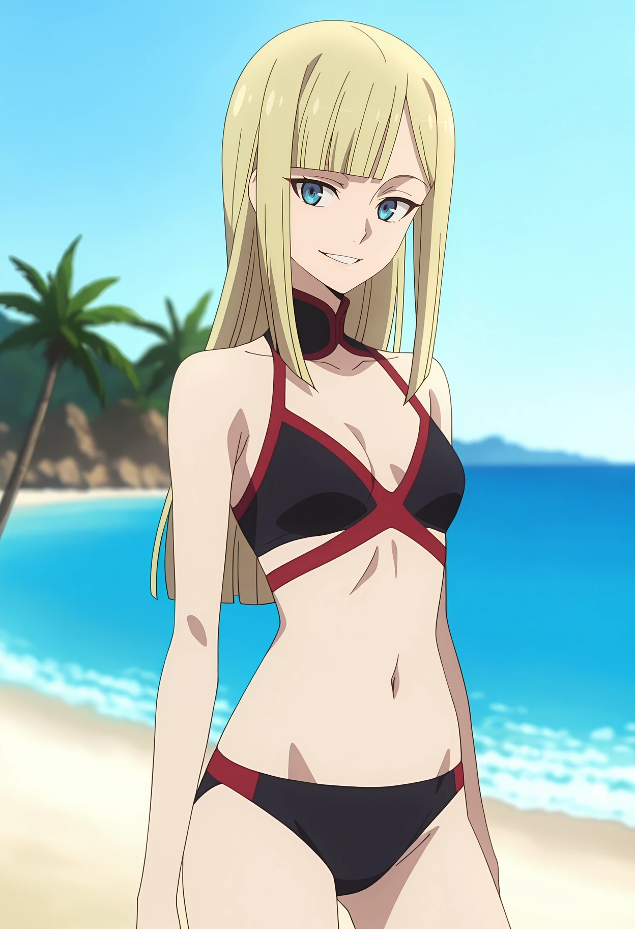 asymmetrical hair, braided bun, short hair, blonde hair, blue eyes, pink lips, stud earrings, criss-cross halter, sleeveless dress, red dress