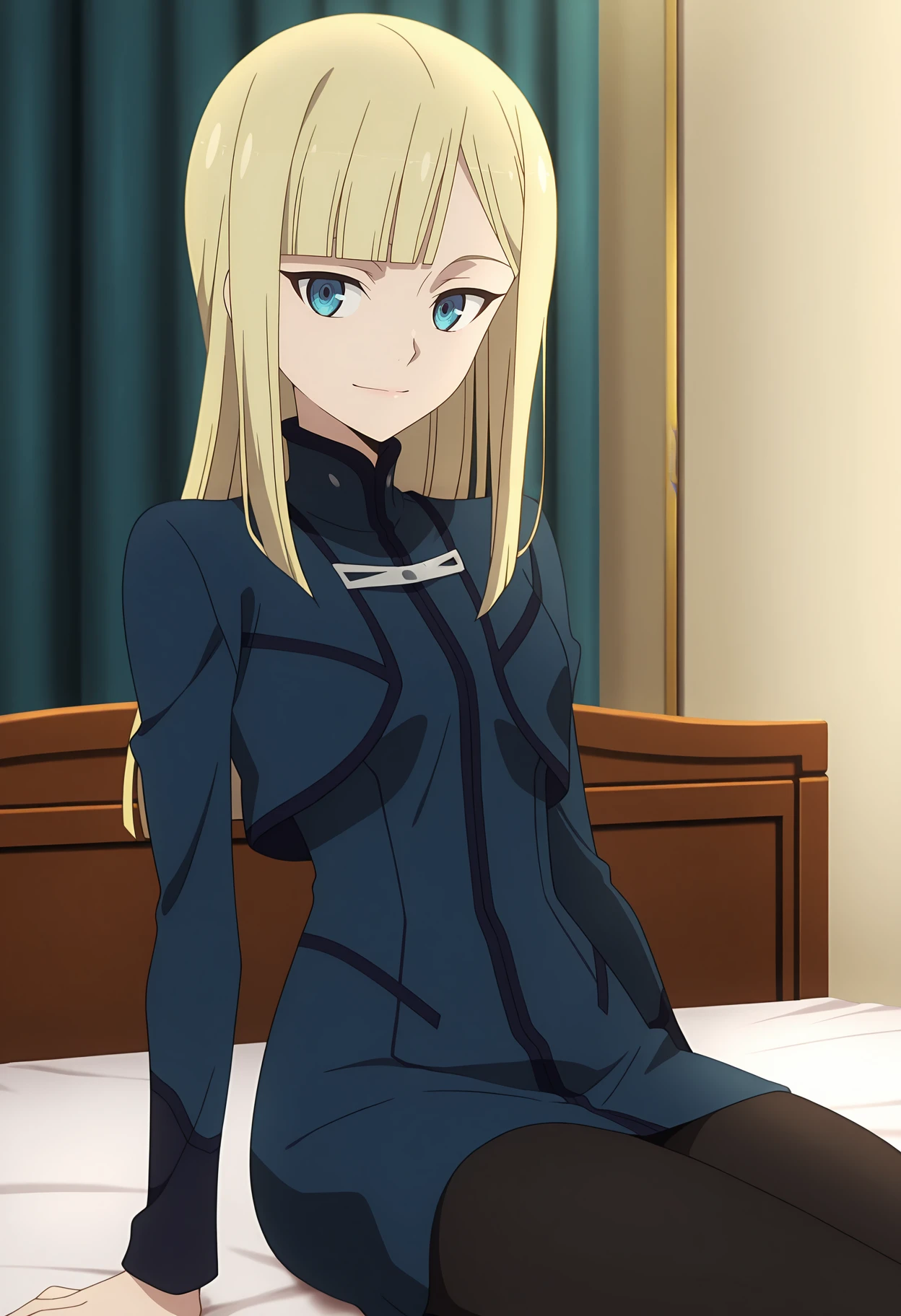 swept bangs, blunt bangs, long hair, blonde hair, blue eyes, black beret, hari flower, hair ribbon, fur collar, blue scarf, blue capelet, blue dress, long sleeves, black arm warmers, black pantyhose