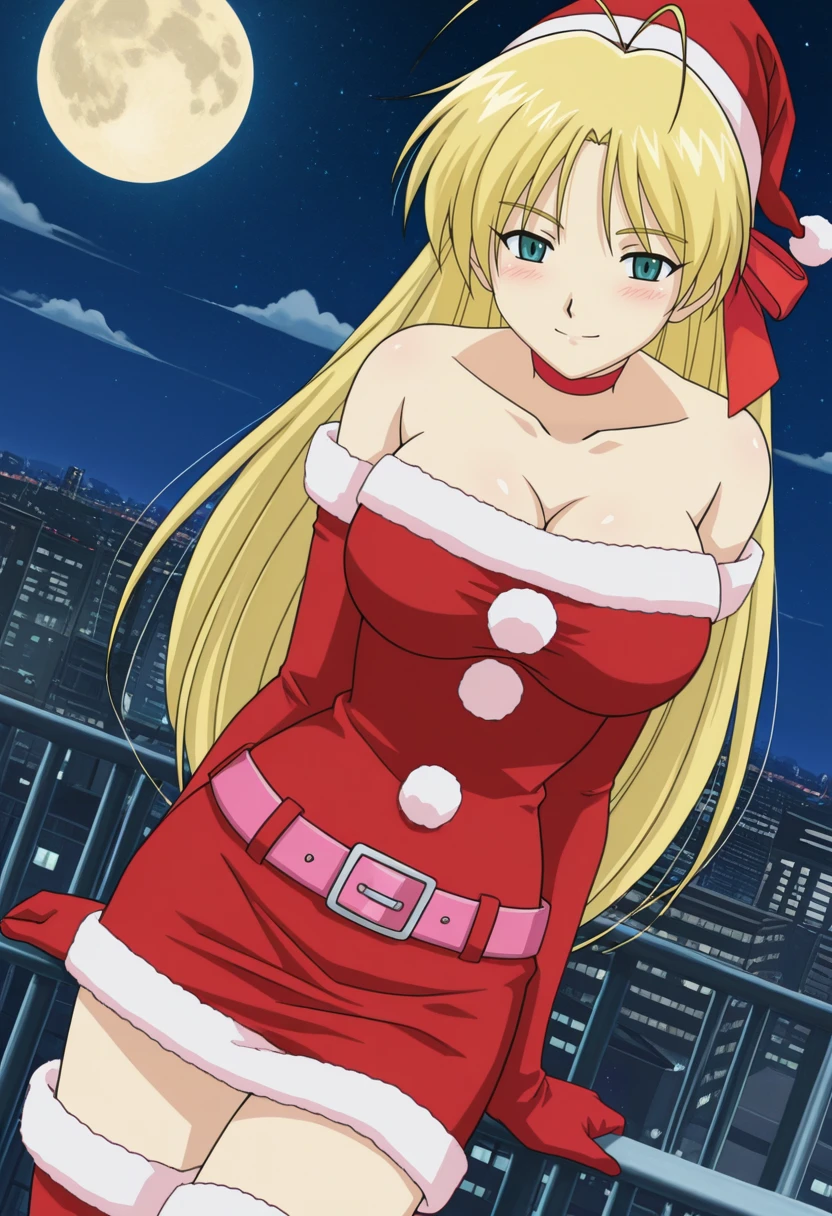 MaiSanta, 1girl, solo, blonde hair, long hair, antenna hair, blue eyes, large ??????, wide ????, curvy, collarbone, red hairband, red hair ribbon, santa costume, christmas, santa hat, red choker, red gloves, elbow gloves, pink belt, ???? shoulders, fur-trimmed red dress, fitted red dress, thigh-length dress, mini skirt, zettai ryouiki, fur-trimmed red boots,Mai Swimsuit