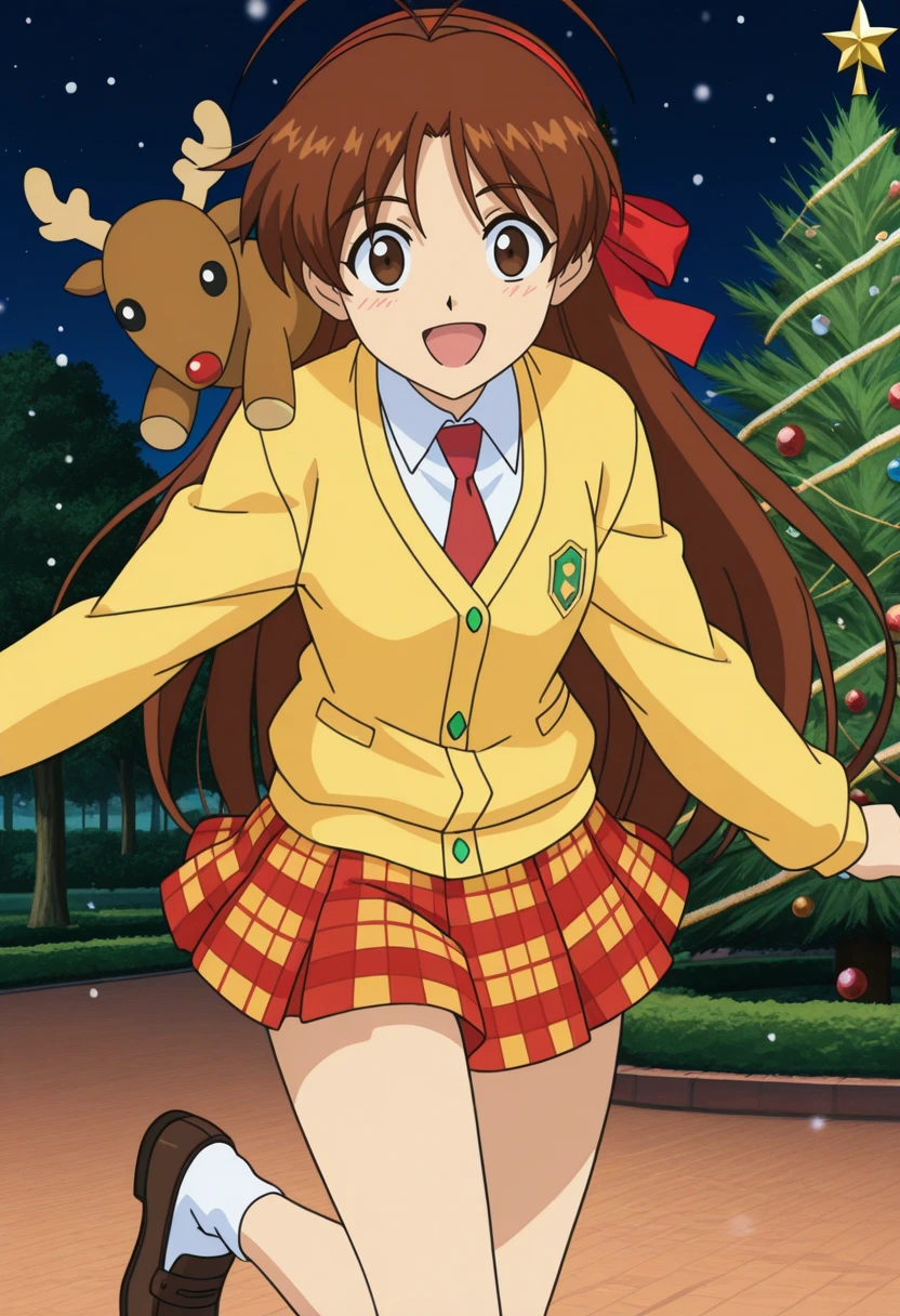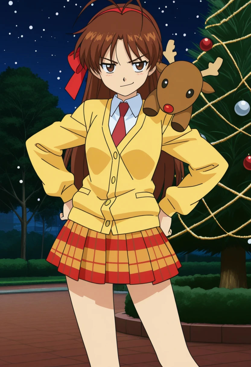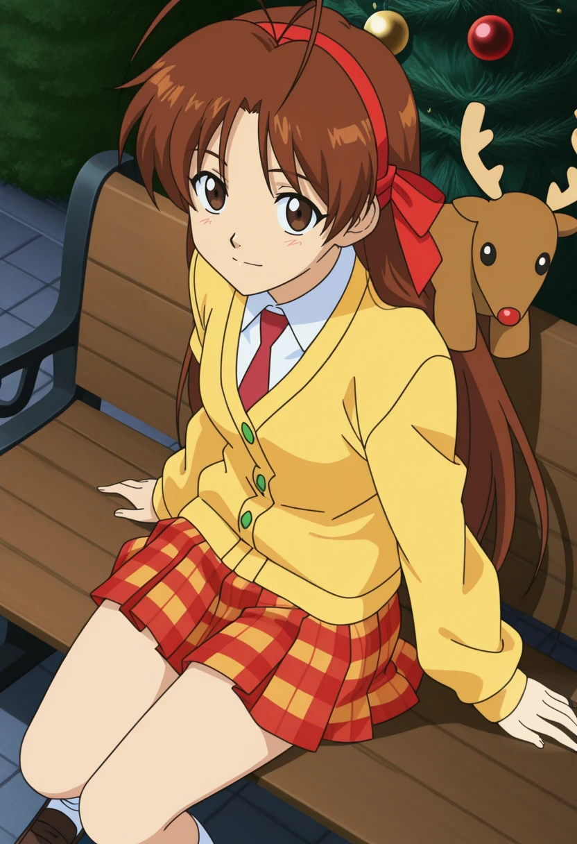 MaiCasual, 1girl, solo, long hair, brown hair, antenna hair, red hairband, red hair ribbon, brown eyes, medium ??????, medium ????, red necktie, white shirt, yellow cardigan, school uniform, long sleeves, deer stuffed toy, plaid skirt, white socks, loafers, Mai White Shirt