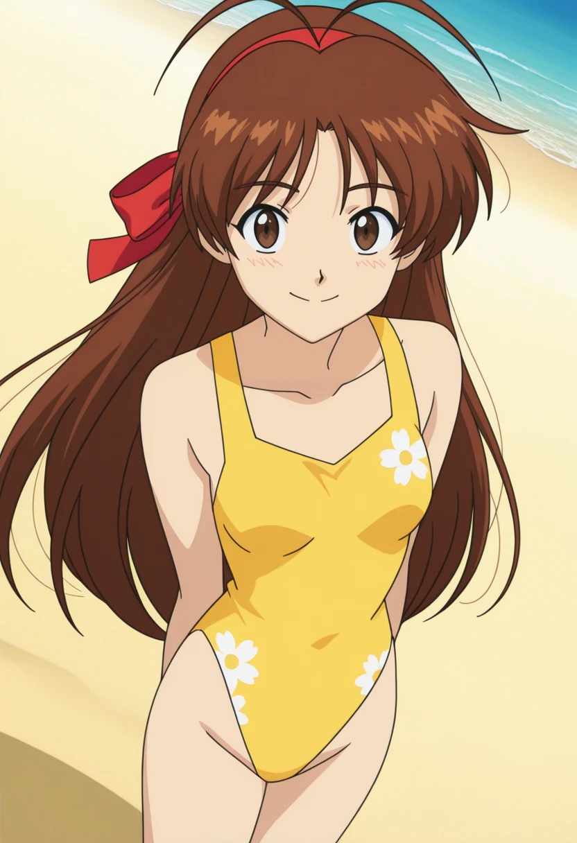 MaiSwim, 1girl, solo, long hair, brown hair, antenna hair, red hairband, red hair ribbon, brown eyes, medium ??????, medium ????, yellow one-piece swimsuit, floral print, highleg, barefoot,Artistic Disclaimer: