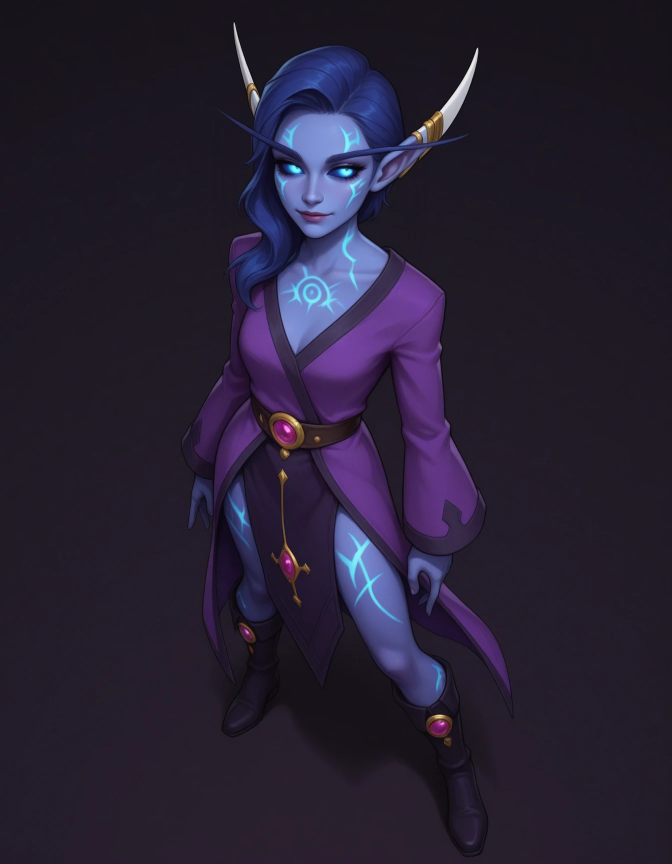 xnightbornex, nightborne, long eyebrows, long pointy ears, blue skin, glowing tattoo, glowing eyes, blue sclera, blue eyes