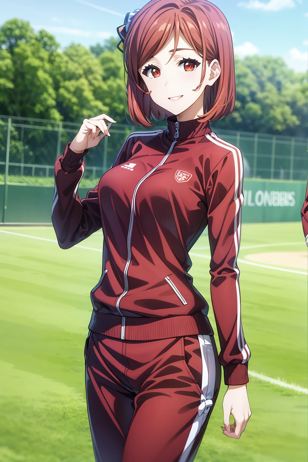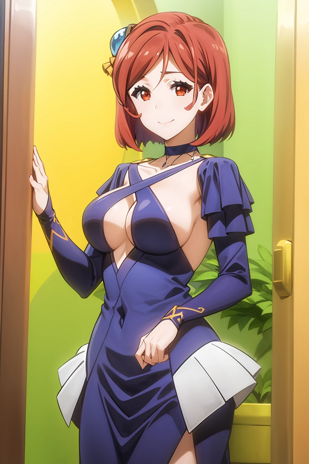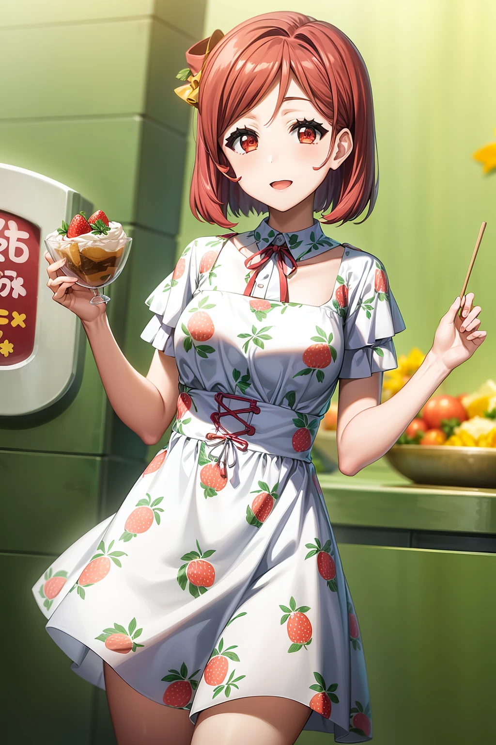 short hair, bangs, brown eyes, red hair, hair ornament