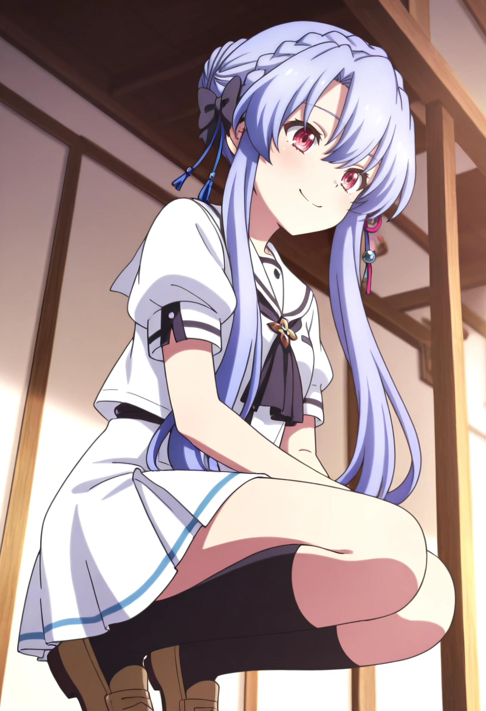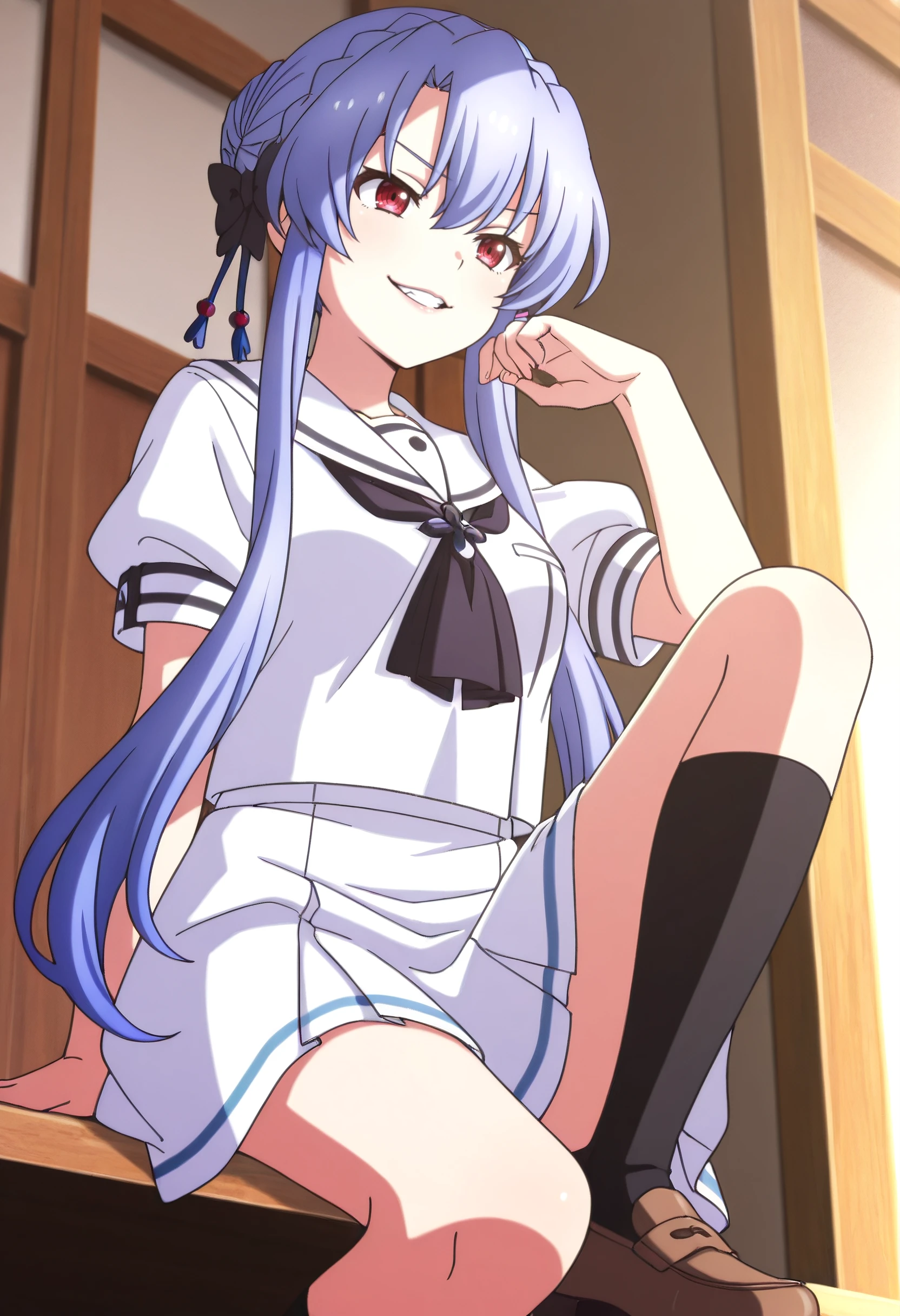 AoSchool, school uniform, short sleeves, white sailor collar, sailor collar, white shirt, shirt, skirt, white skirt, puffy short sleeves, white serafuku, miniskirt, puffy sleeves, black ascot, black socks, socks, shoes, bow, kneehighs, brown footwear, tassel hair ornament, ribbon, loafers, serafuku, ascot, neckerchief, black bow, sailor shirt, white ribbon, pleated skirt, black neckerchief, hair ornament,