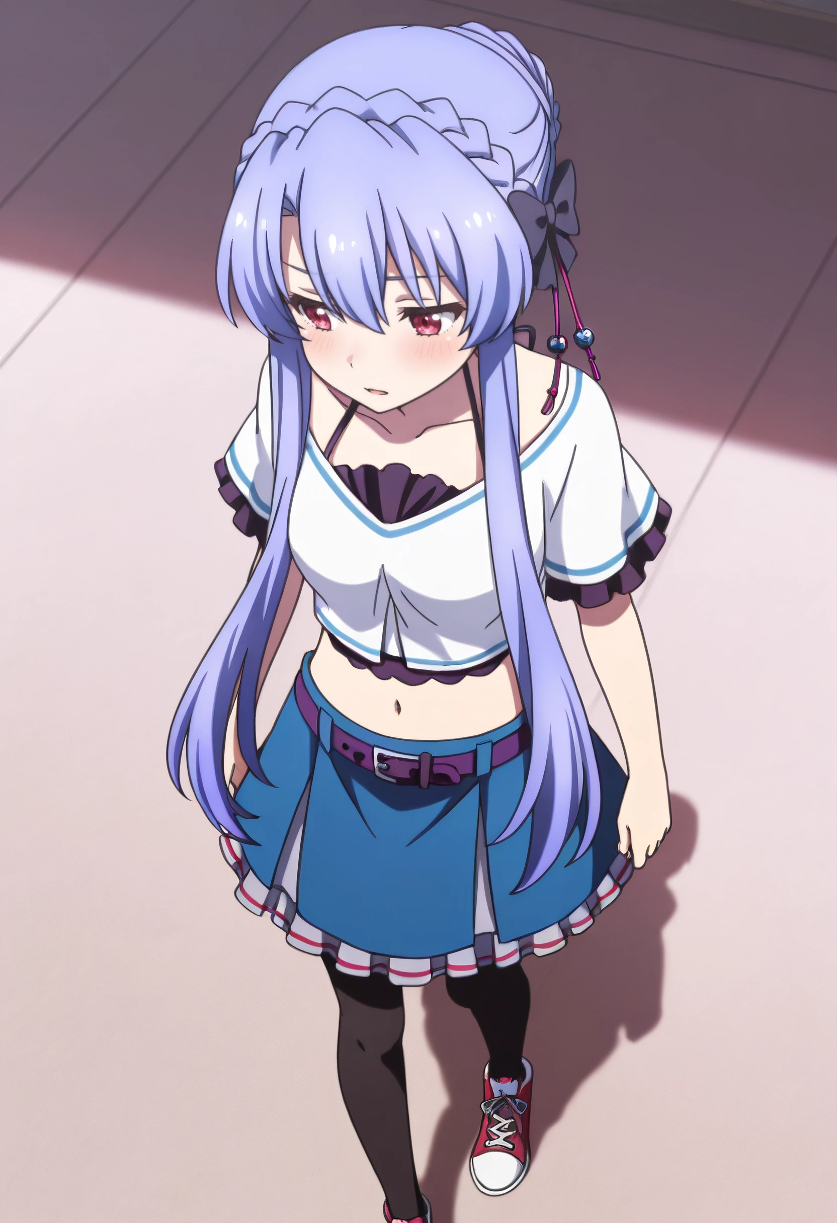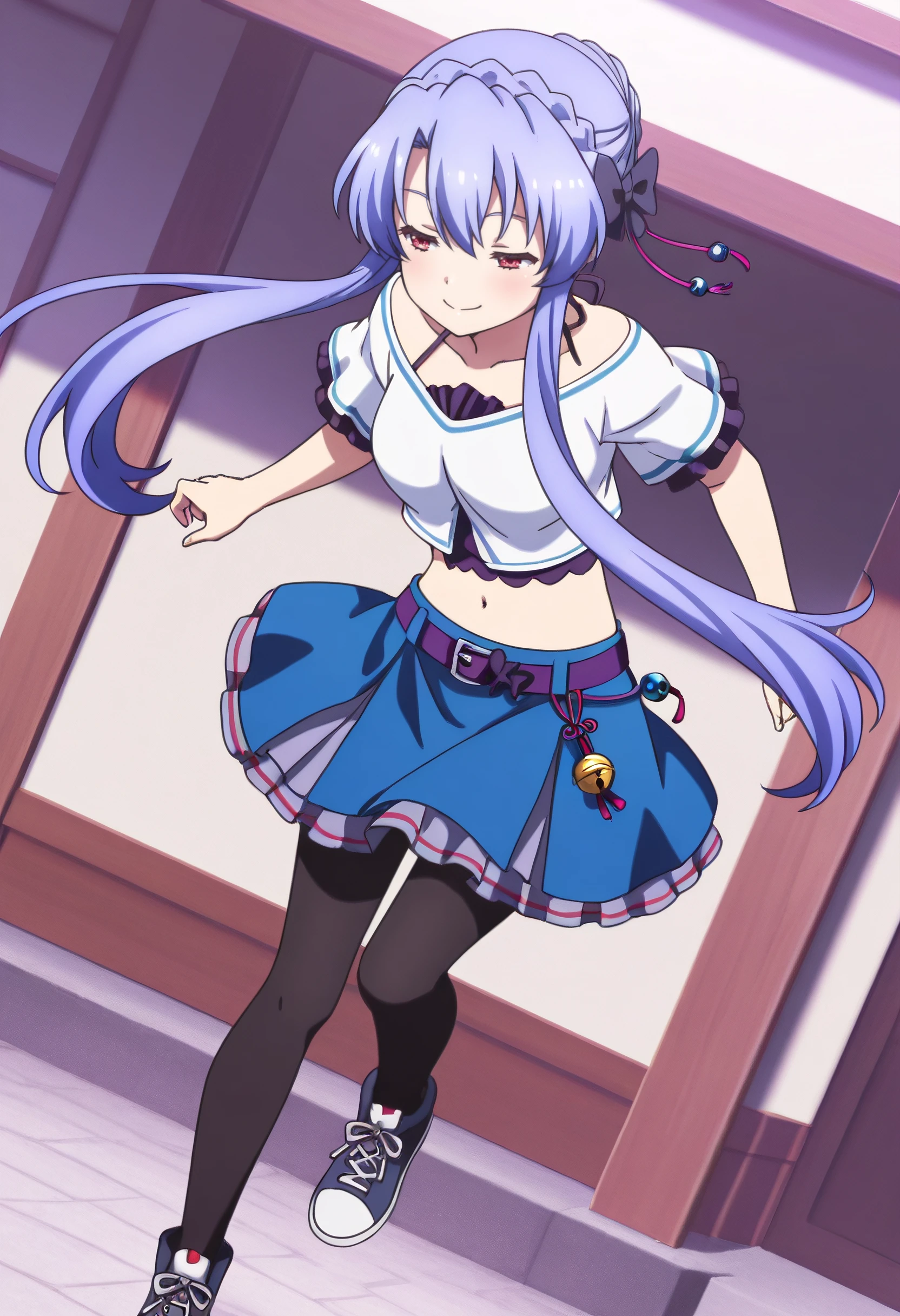 AoSkirt, short sleeves, shirt, midriff, white shirt, skirt, blue skirt, crop top, bow, navel, belt, ribbon, pantyhose, black pantyhose, frills, hair ornament, black bow, purple belt, tassel hair ornament, shoes, frilled skirt, frilled sleeves, miniskirt, sneakers, halterneck, cropped shirt, hair bell,