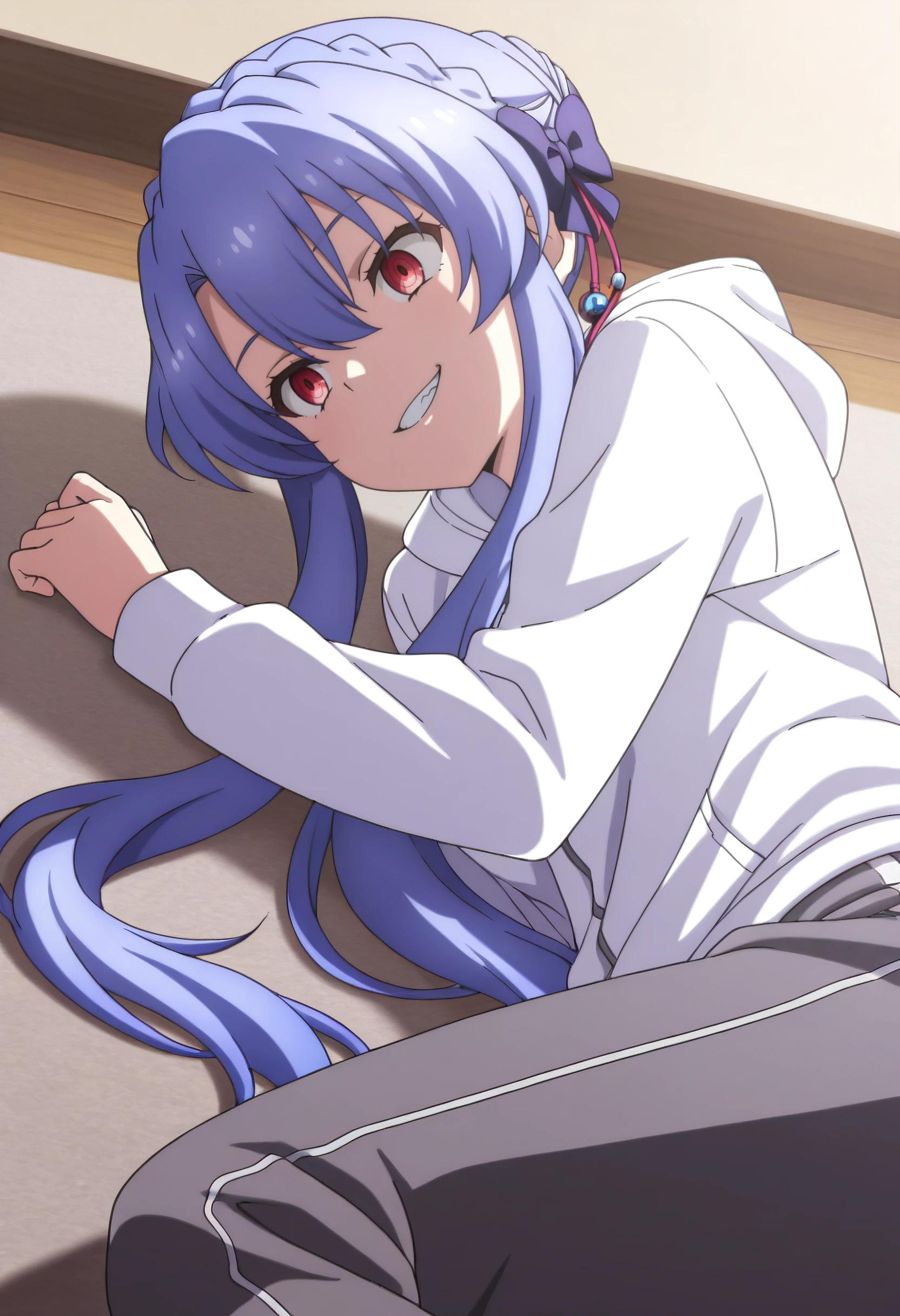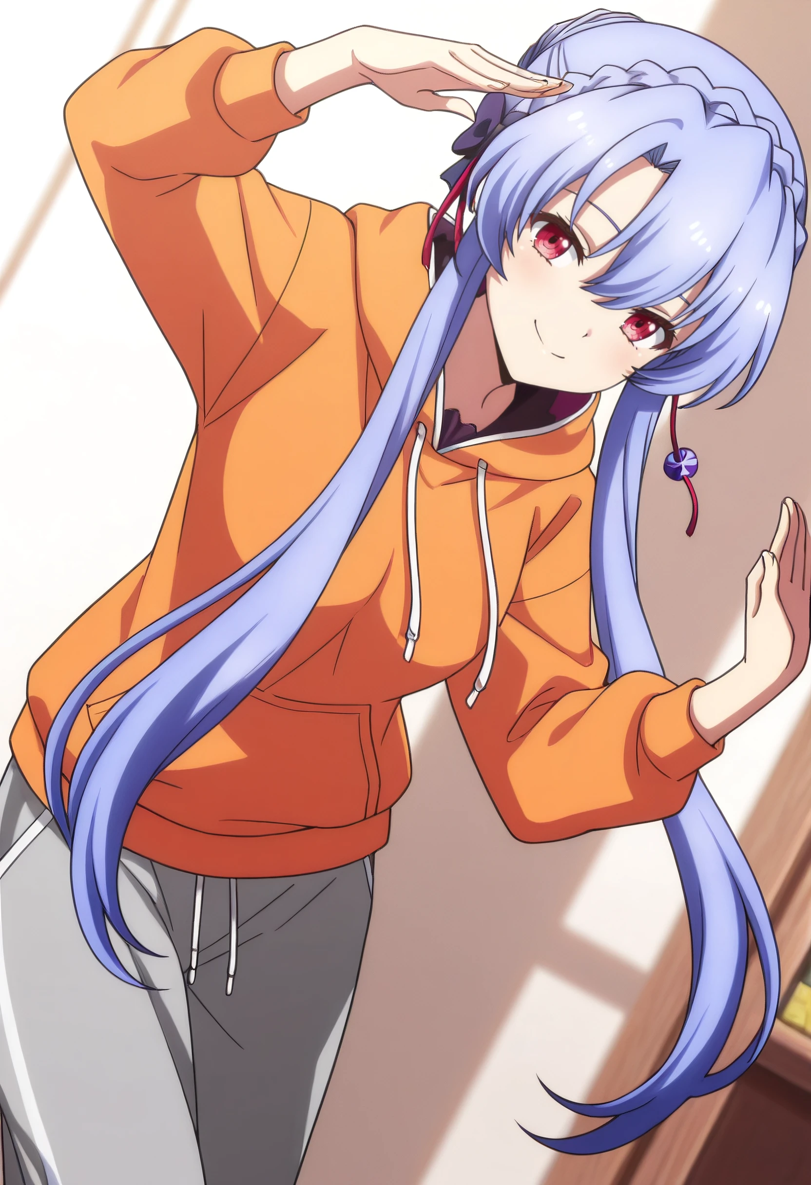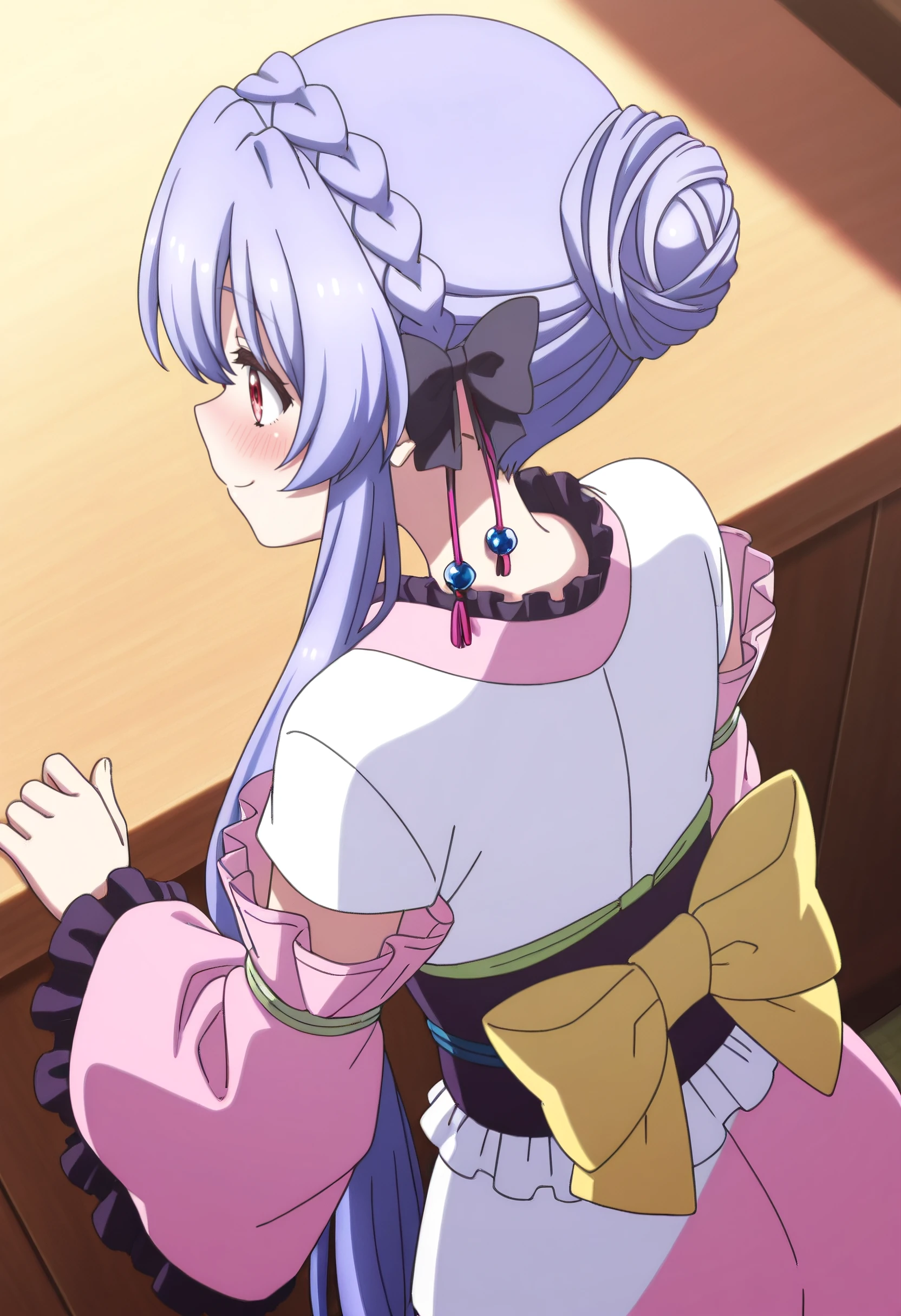 SPoAo, long hair, sidelocks, blue hair, braid, red eyes, crown braid, hair bun, hair between eyes, hair bow, short hair with long locks, single hair bun, hair ribbon, braided bun,