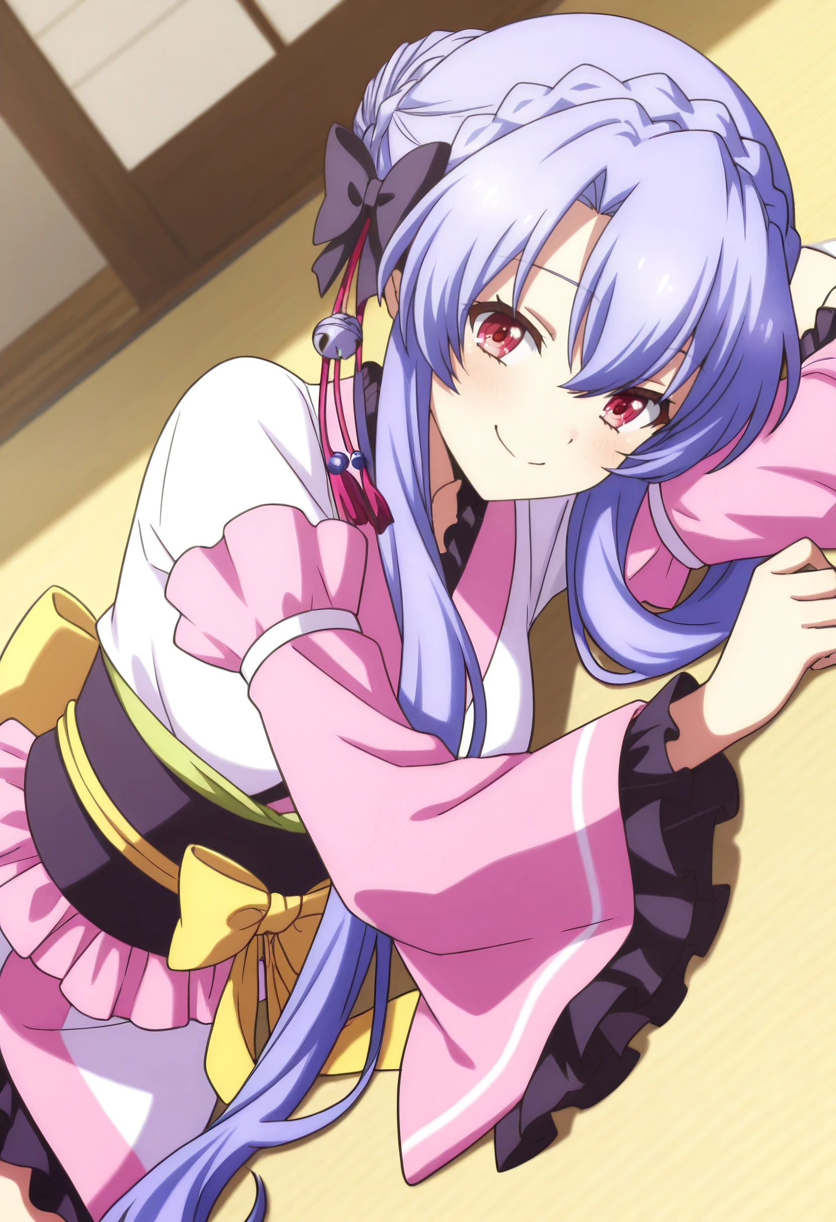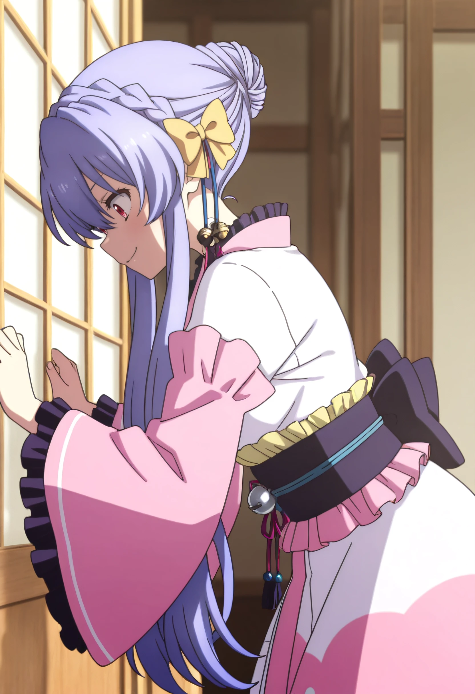 AoKimono, japanese clothes, kimono, detached sleeves, white kimono, bow, wide sleeves, hair ornament, long sleeves, frills, frilled kimono, obi, sash, yellow bow, black bow, hair bell, pink kimono, tassel hair ornament, pink sleeves, two-tone kimono,