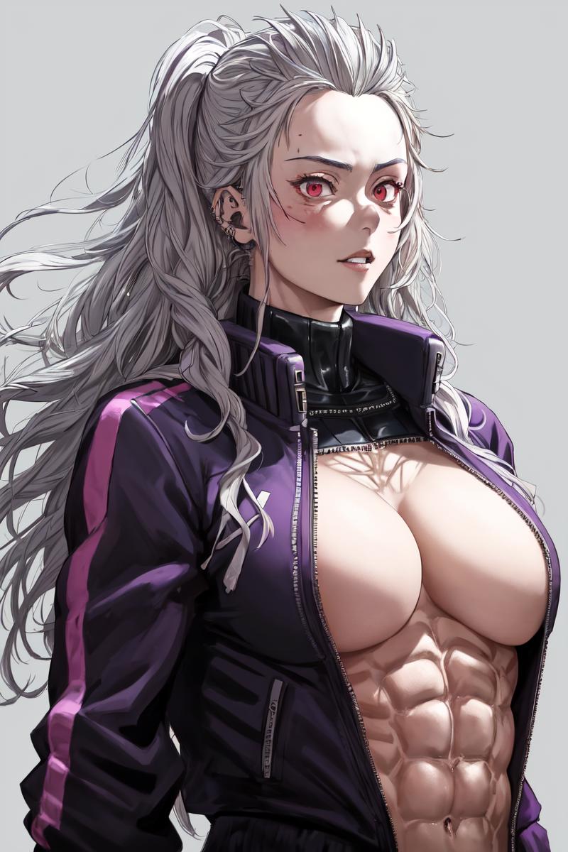 For better appearance add "long hair, muscular, jacket, purple track suit"