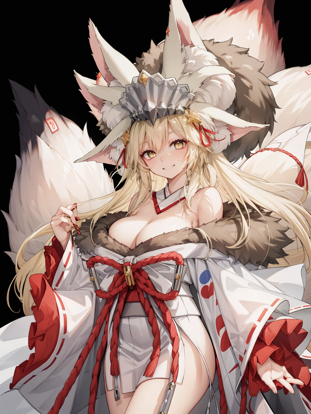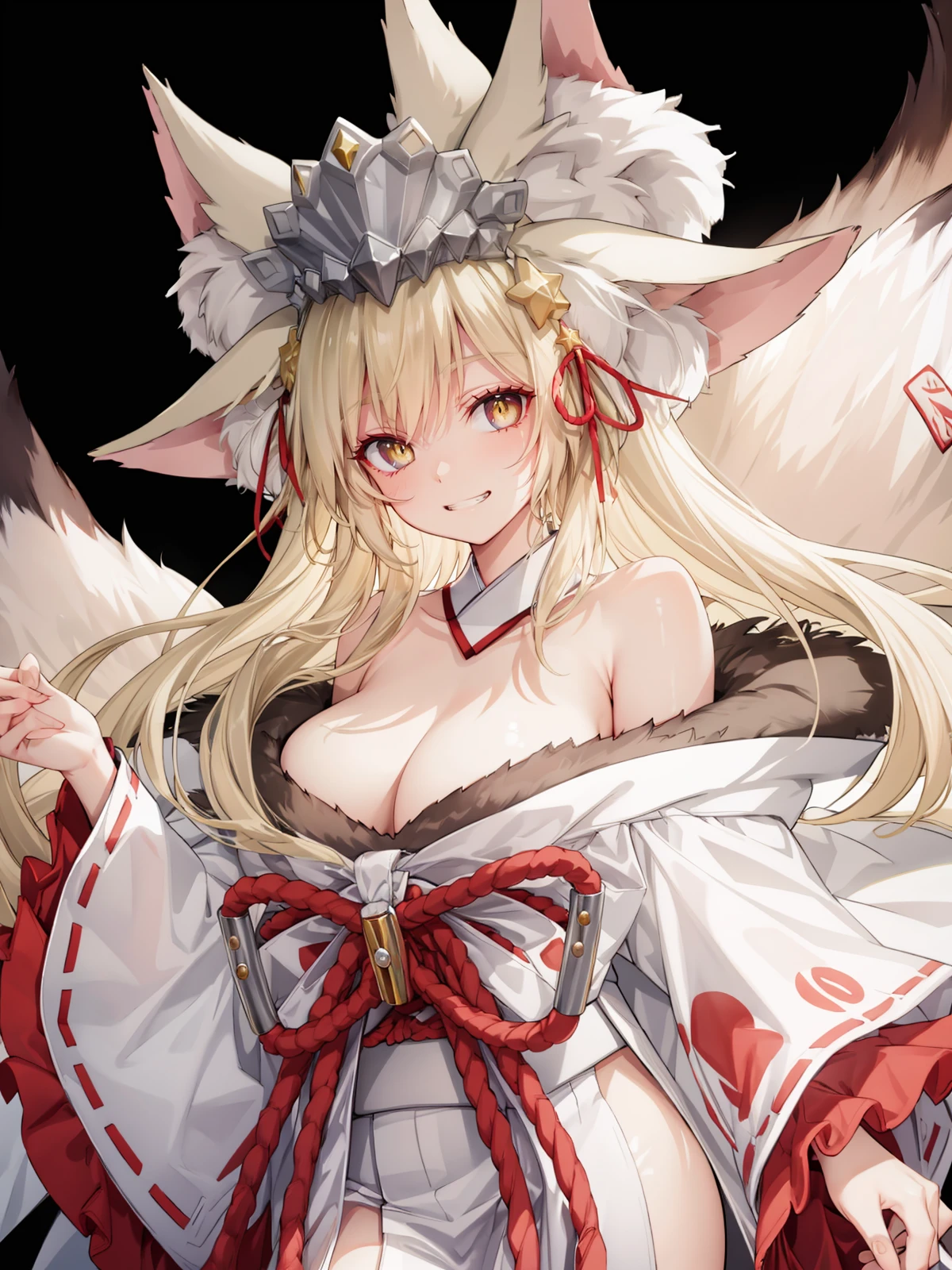 long hair, fox ears, animal ear fluff, fox girl, yellow eyes, fox tail, japanese clothes, white kimono, fur-trimmed kimono, rope, cleavage, wide sleeves, off shoulder, barefoot, detached collar, talisman