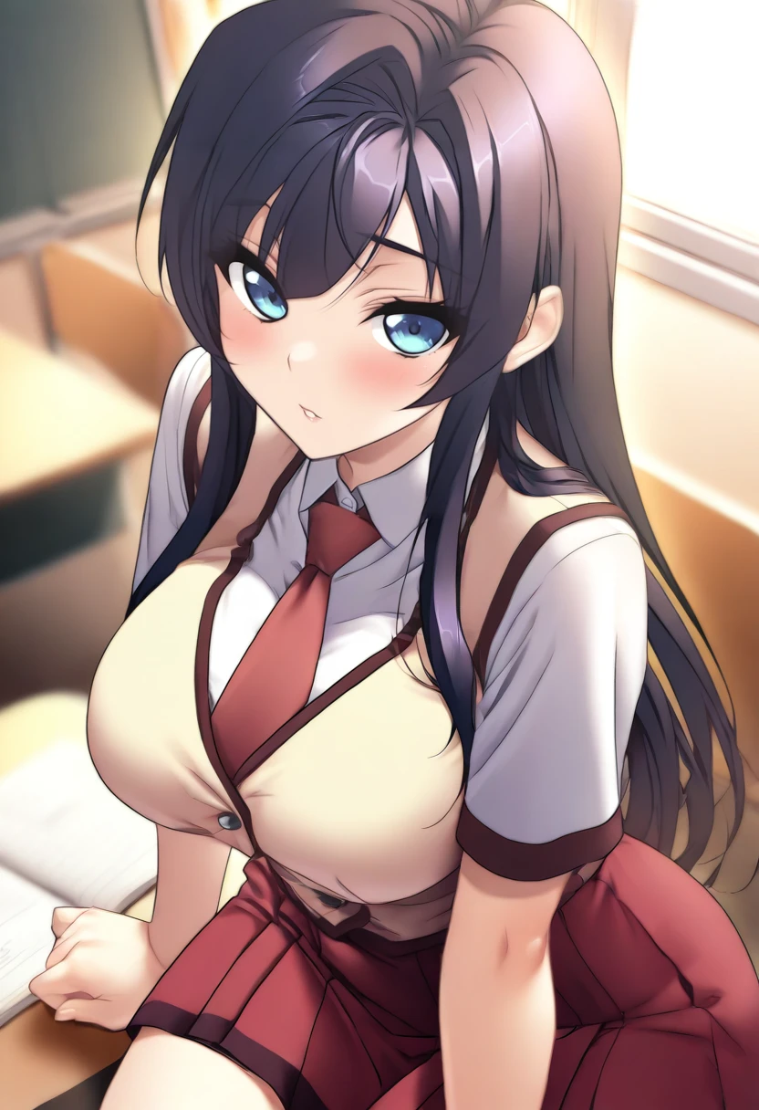 Default Outfit: "school uniform, red skirt, necktie, kneehighs, black socks, loafers"