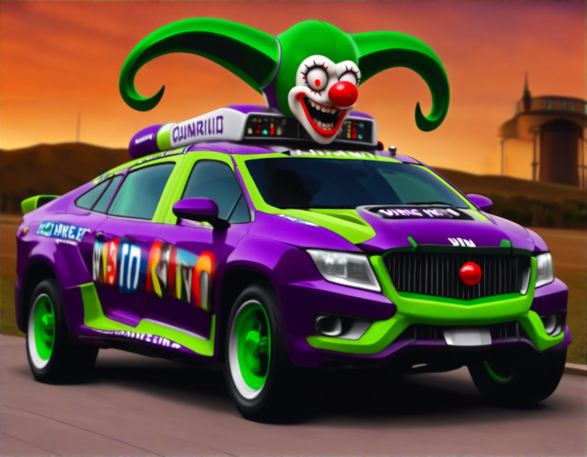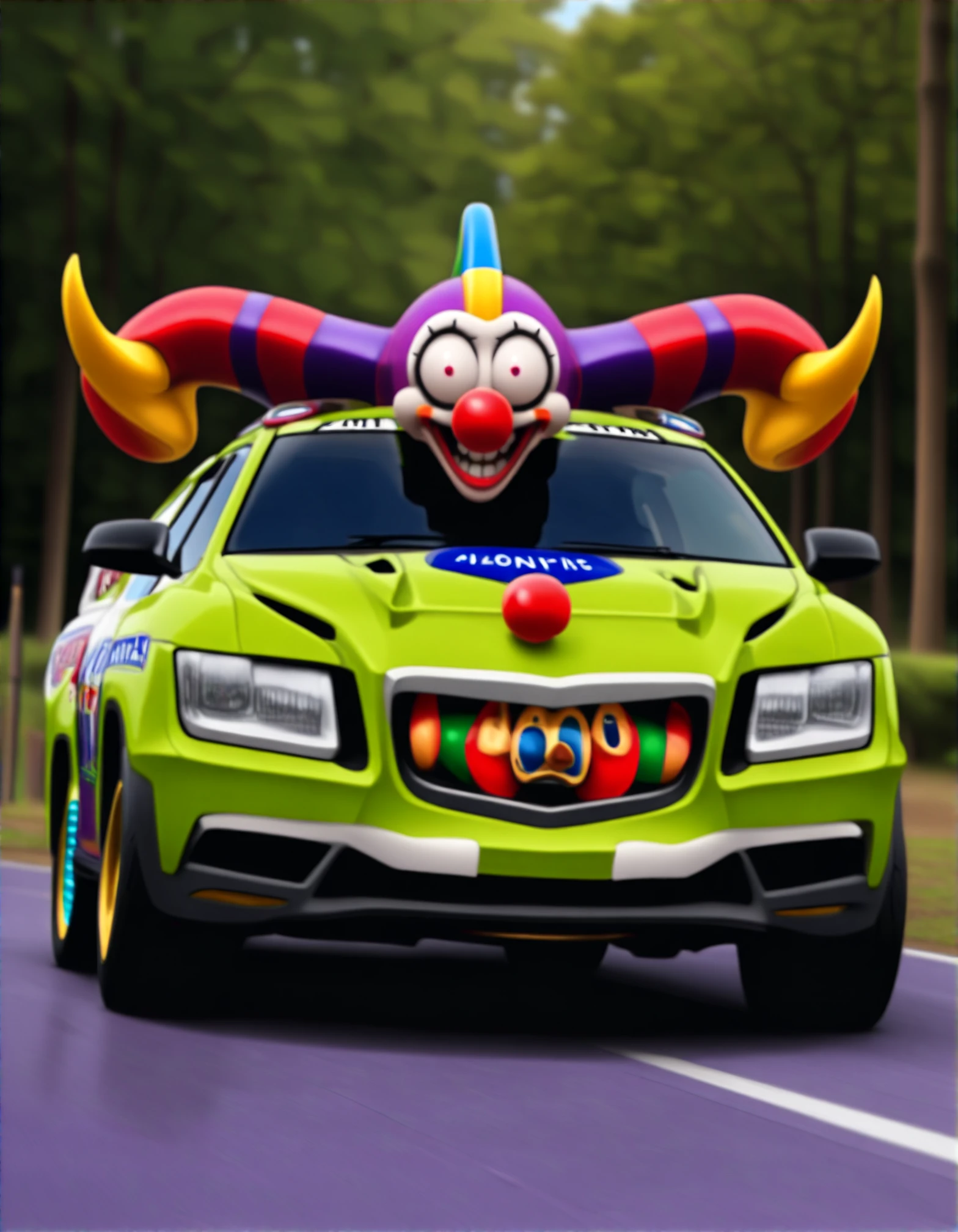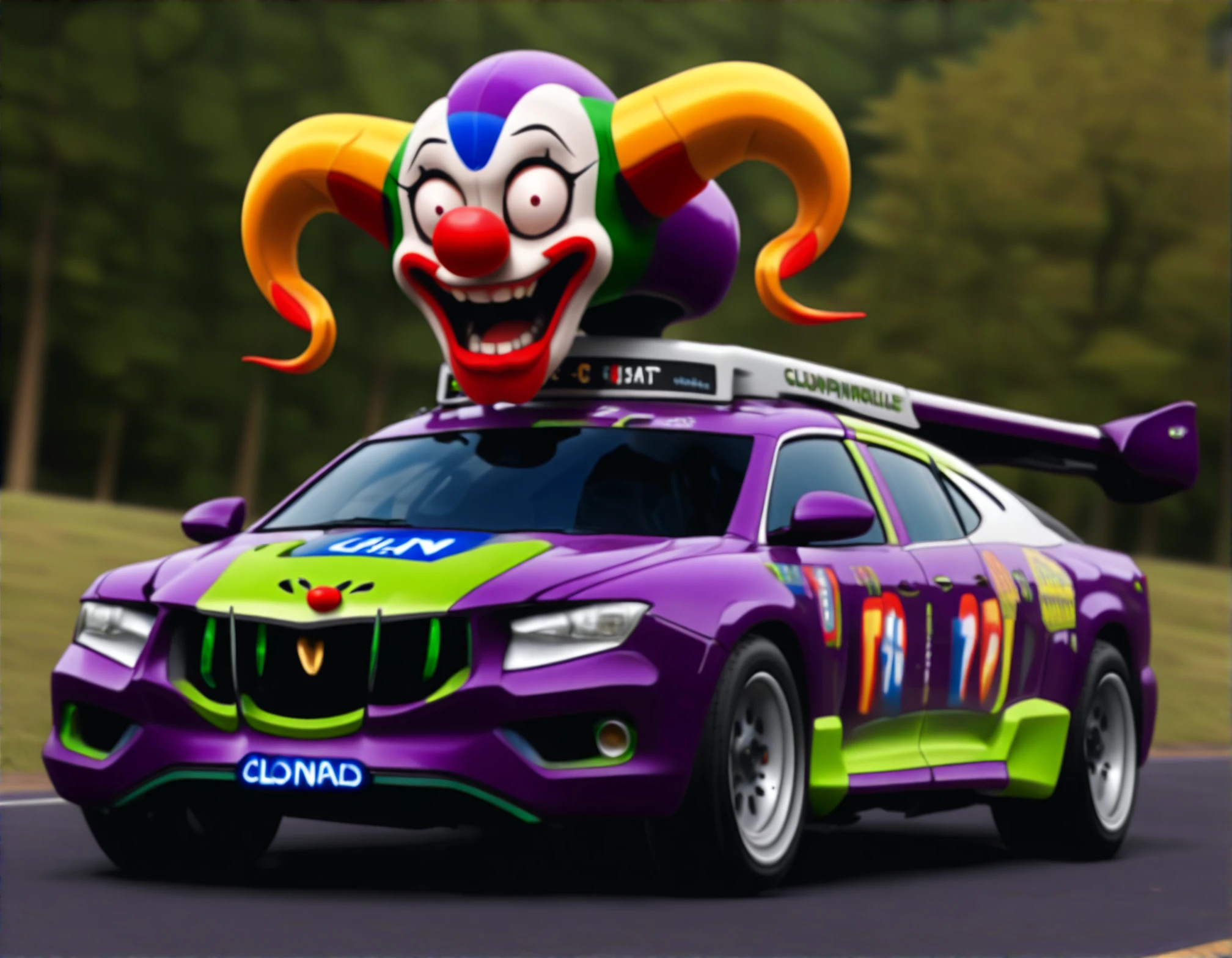 malebogia, jokermobile, clowncar, biblically accurate cybertruck, vehicle focus, motor vehicle, car, no humans, horns, red nose, clown, race vehicle, racecar, spoiler (automobile), teeth, shadow
