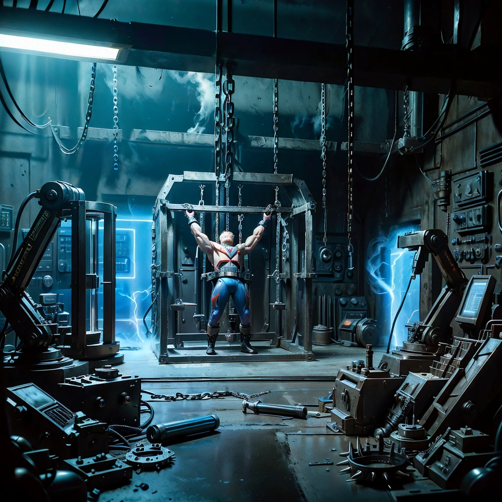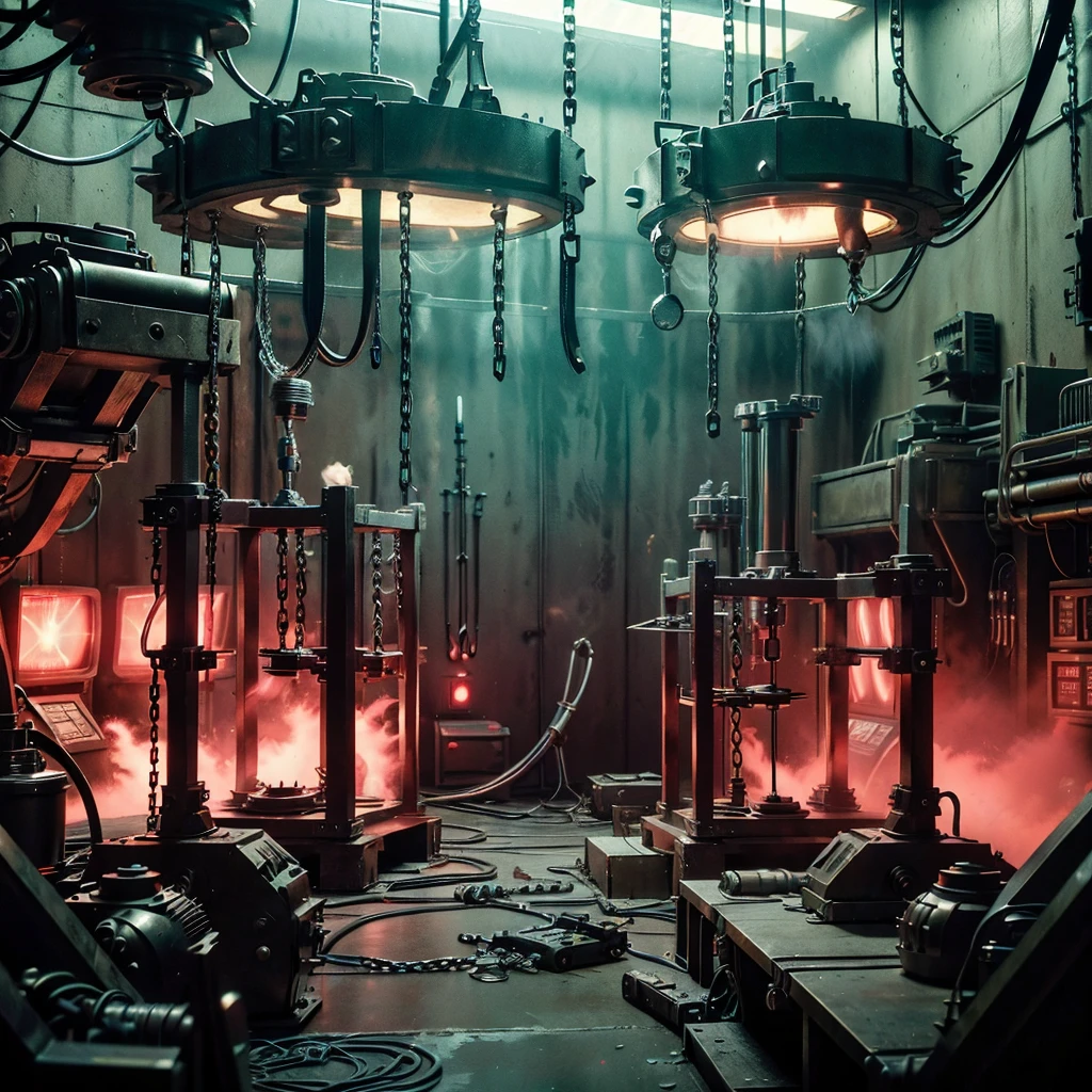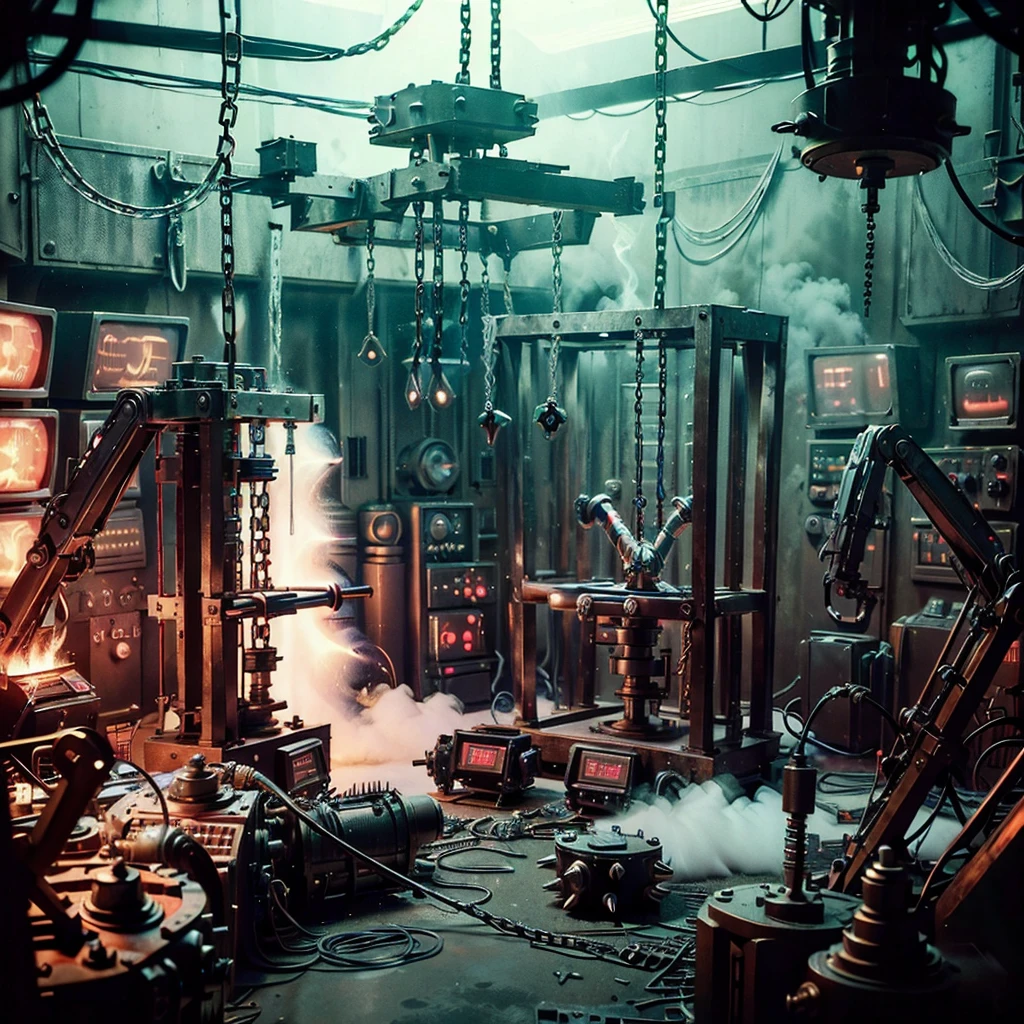 superhero_torture_room, no humans, cable, chain, scenery, science fiction, gears, industrial pipe, multiple boys, smoke, spikes, electricity, machine