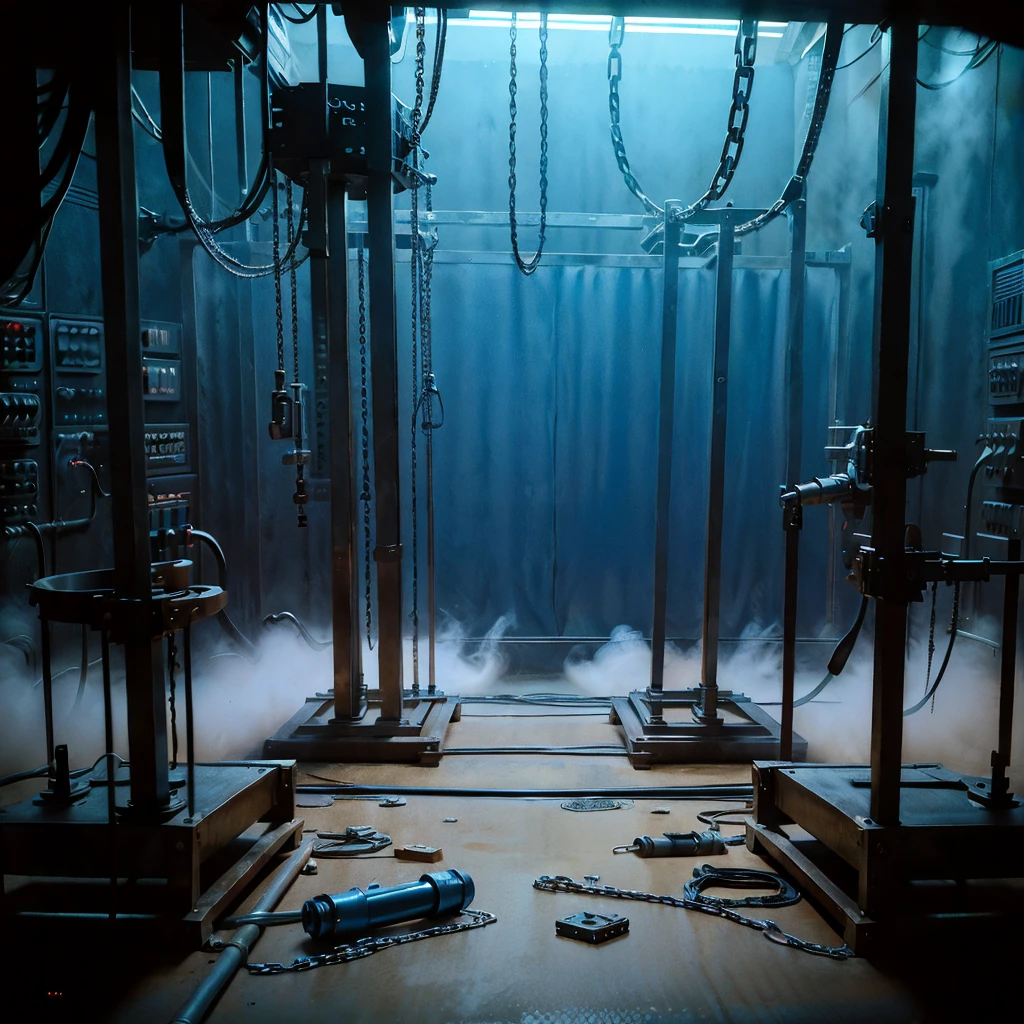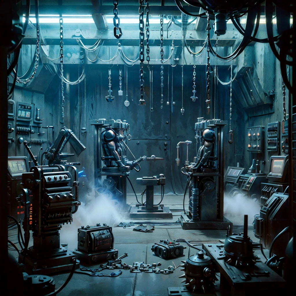 Picture this: massive mechanical racks gleaming under blood-red lights 💡, unbreakable adamantium cuffs and chains dangling everywhere ⛓️, robotic tentacles 🦾, force-field generators ⚡, cryogenic pods ❄️, electrified prods, neural disruptors, and spinning blades – all crammed into a foggy, industrial cyberpunk dungeon with gears, steam, and glowing control panels. 🏭🌫️