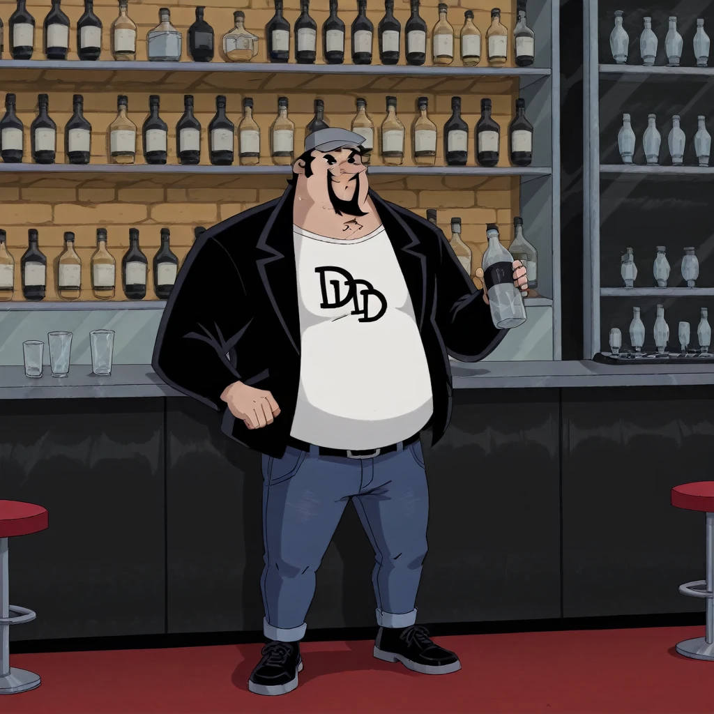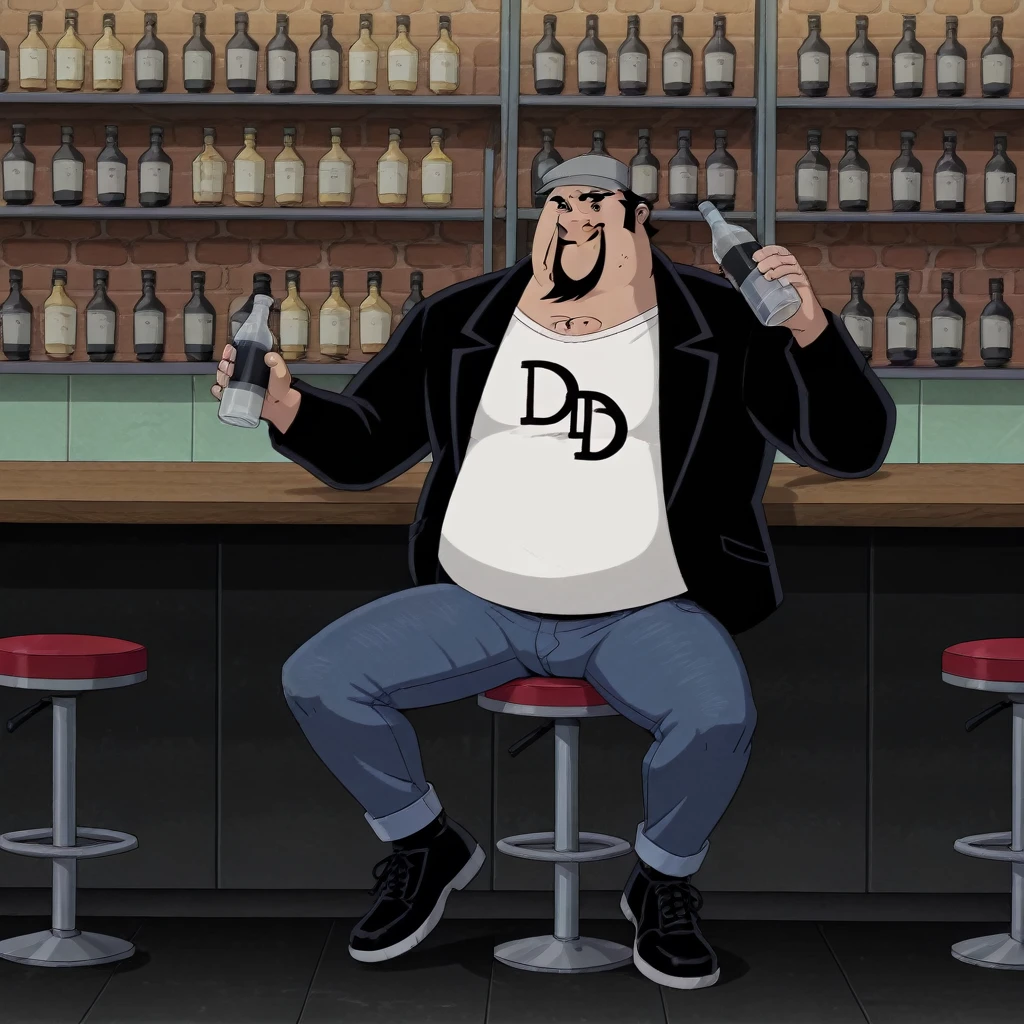 DING_DONG_DADDY, toony, mature male, human, caucasian, black hair, goatee, white eyes, black sclera, colored sclera, fat, overweight, gray cap, black jacket, white shirt, jeans pants, black shoes,