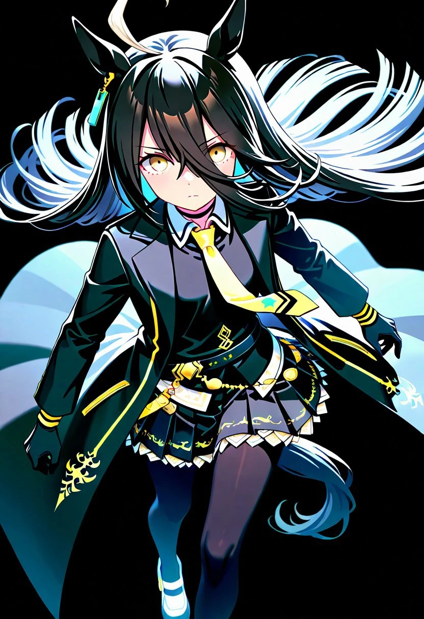 black choker,black gloves,long sleeves,collared shirt,yellow necktie,black vest,black coat,belt,black skirt,pleated skirt,black pantyhose,shoes,white footwear
