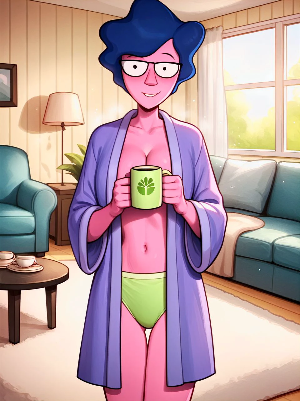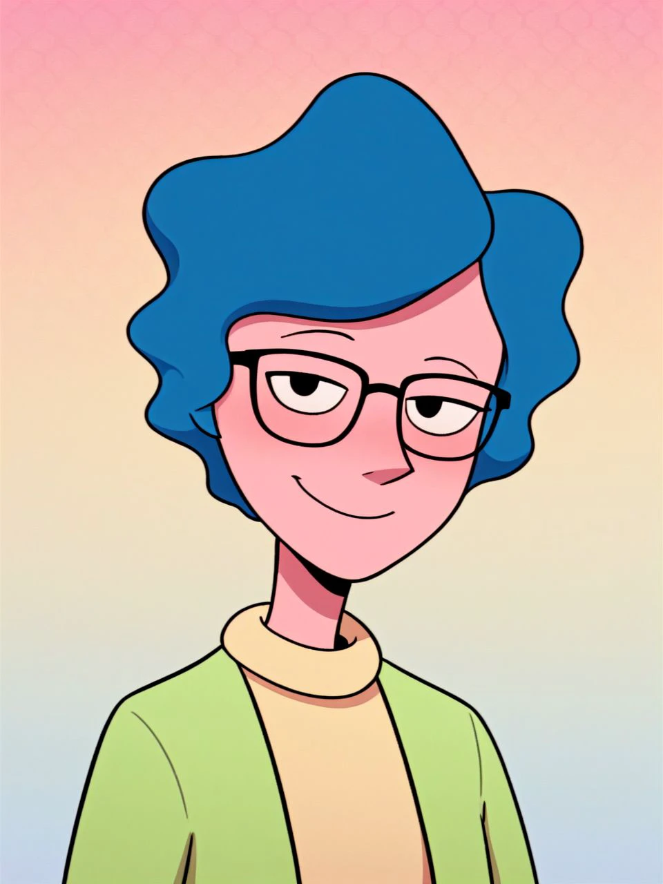 helper tags: pink skin, wavy perm, blue hair, dot eyes, black eyes, semi-circular eyewear