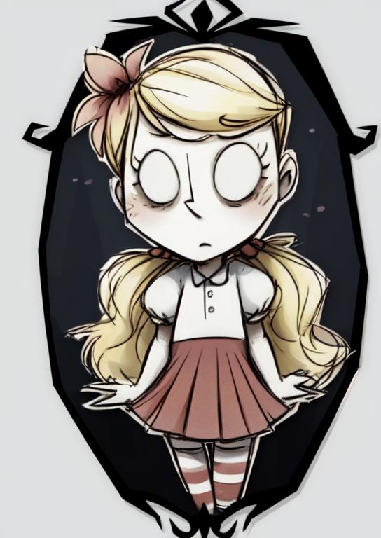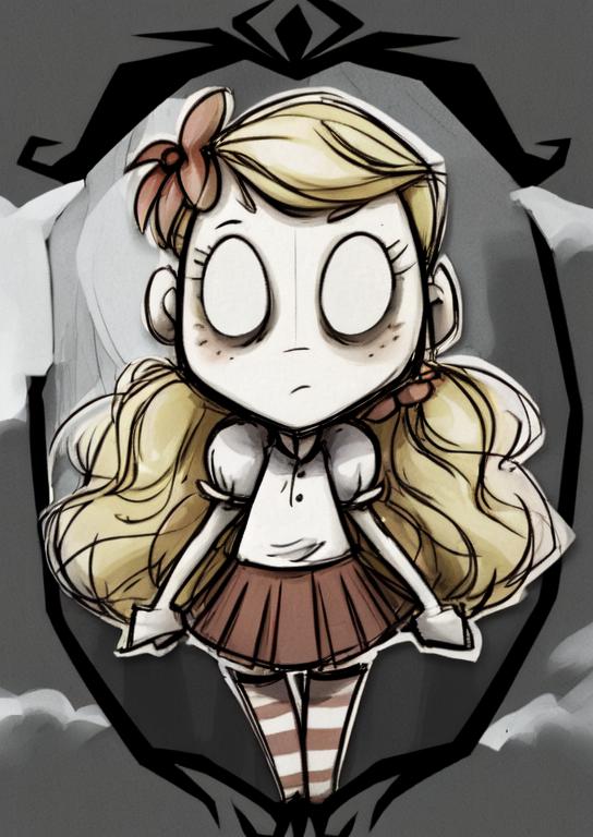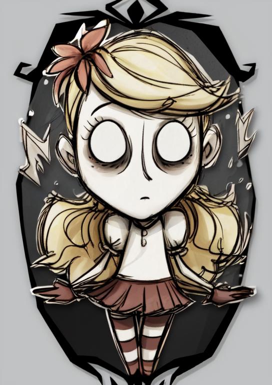 For this one, minimum strength is 0.8. Any lower will give her pupils and lose her likeness too much. Since I still don't know if getting the style with it is possible, I recommend using 1to3fall5's Style Lora for Don't Starve! Using it with a weight of around 0.5 would give a nice approximation of the game's style while still letting you play around a little bit however you please!