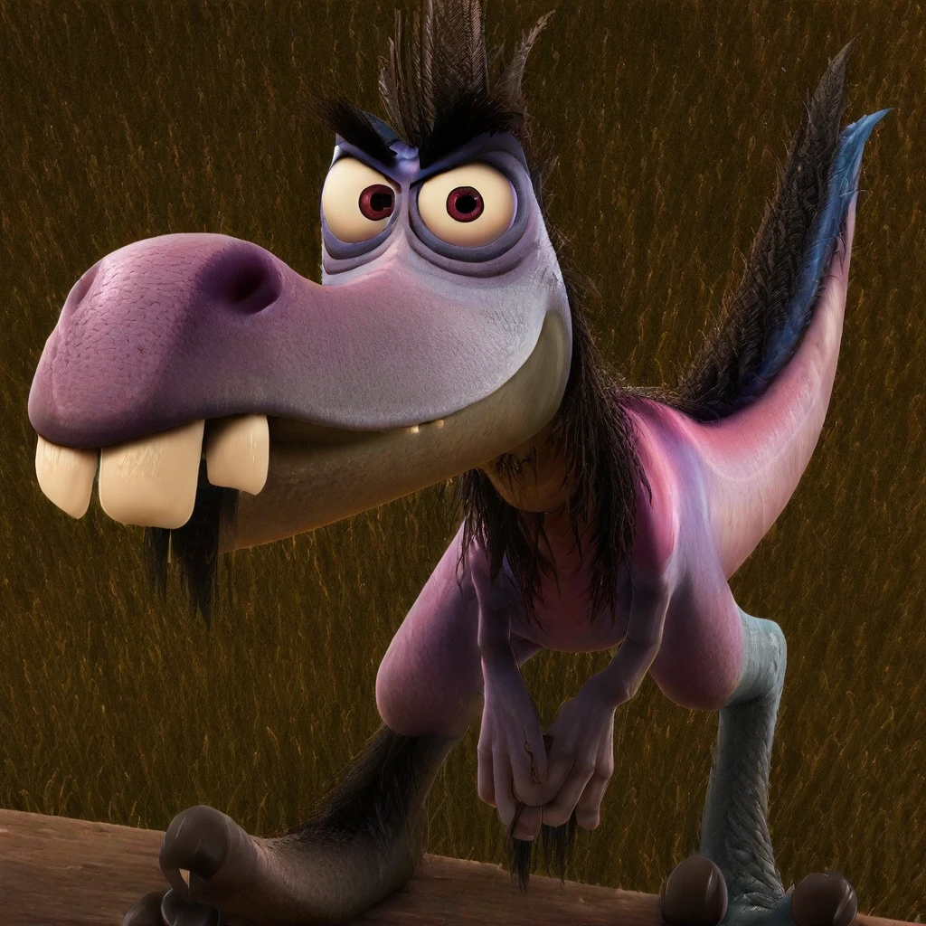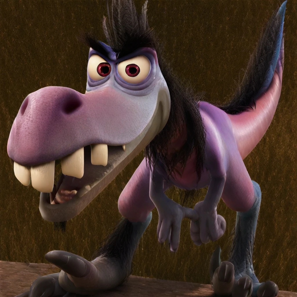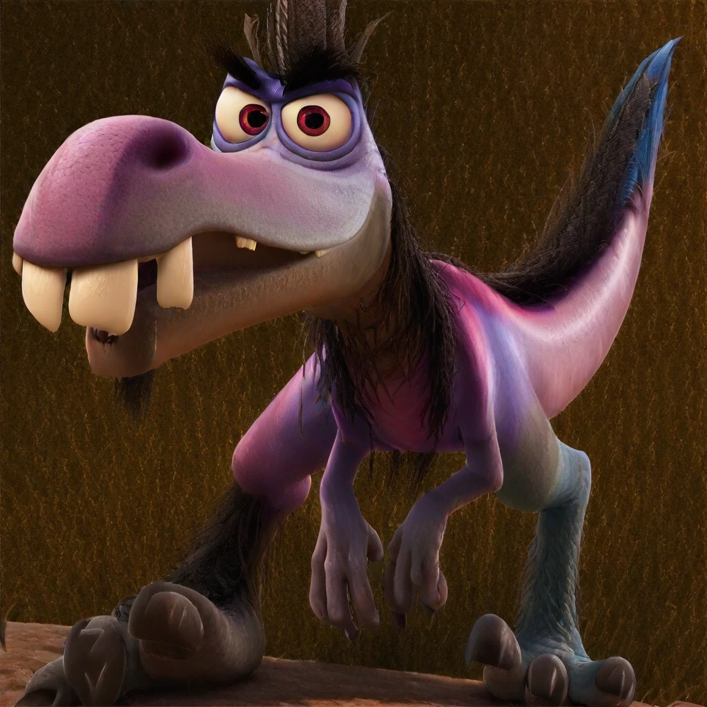 pixar 3D, velociraptor, identical face, disney, pervis the velociraptor. smile, headshot,