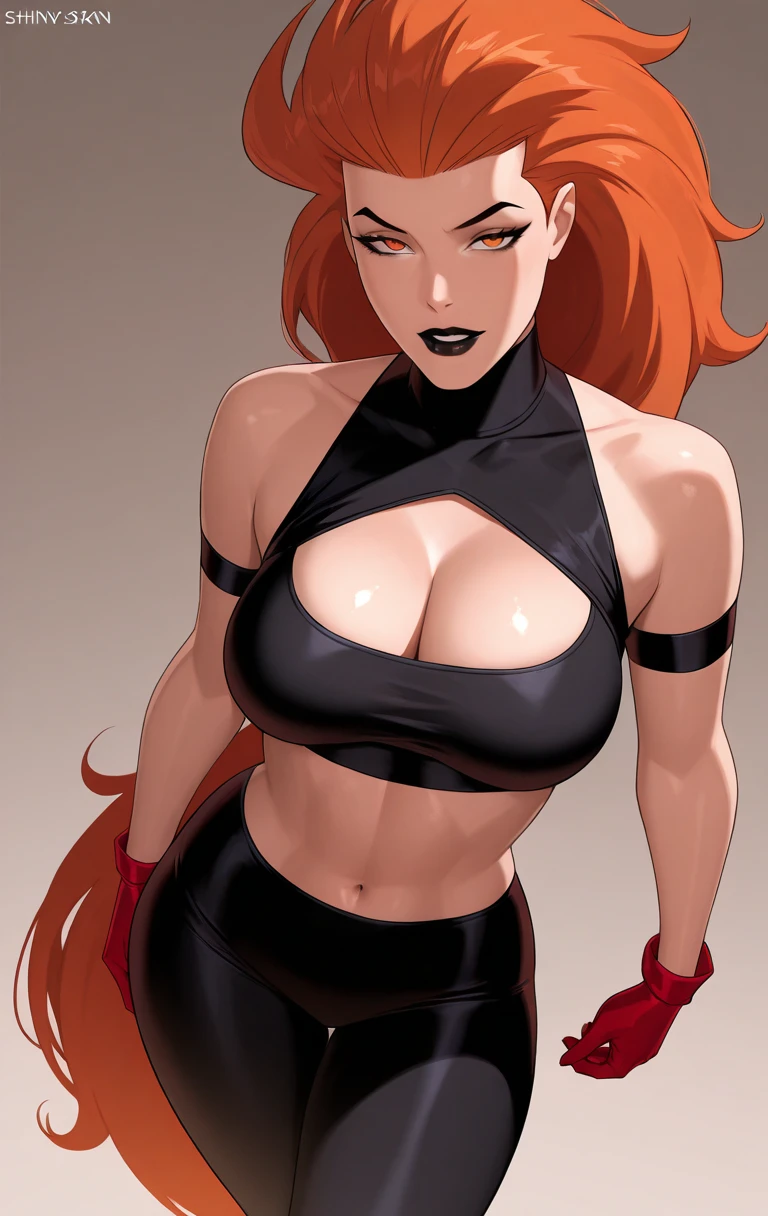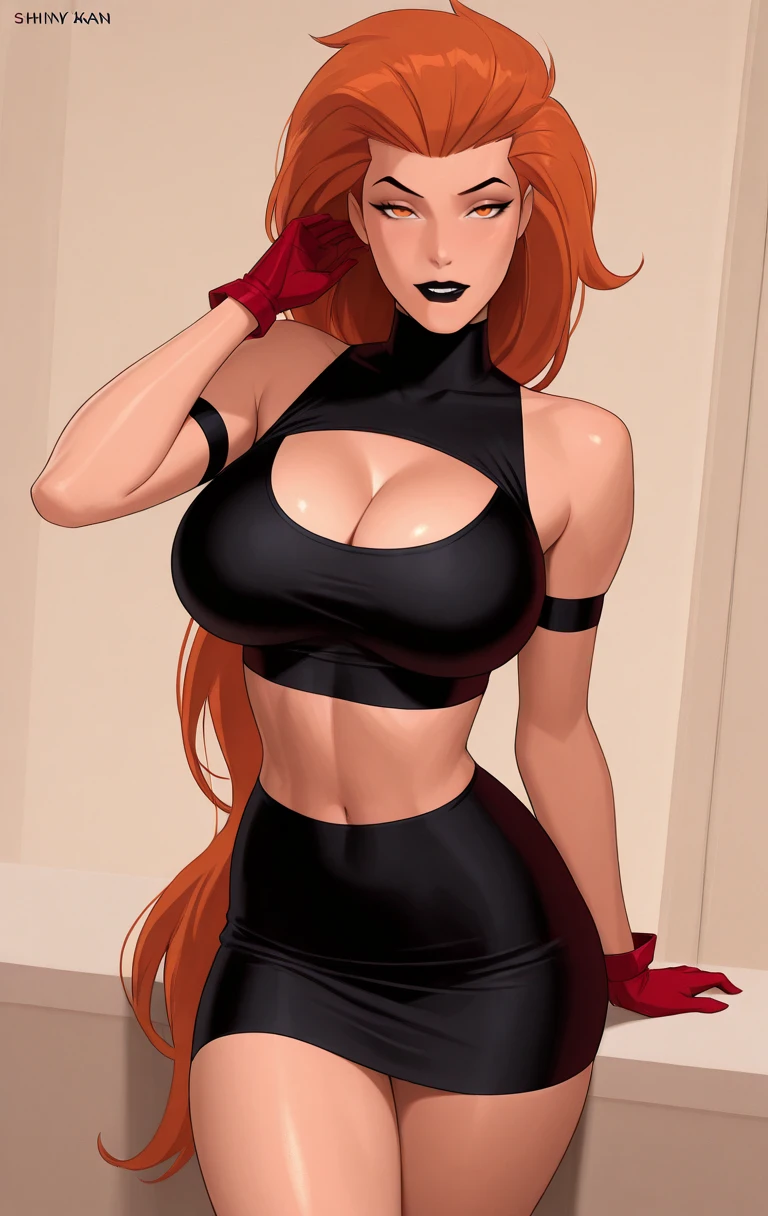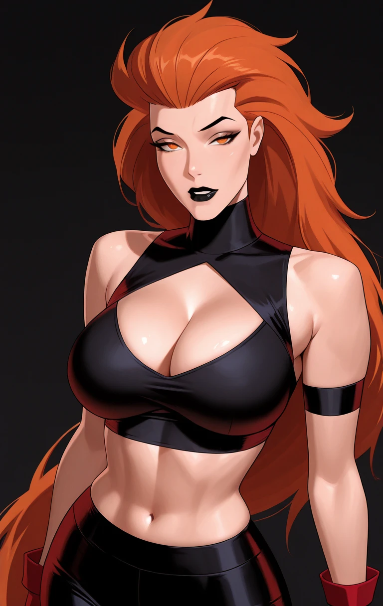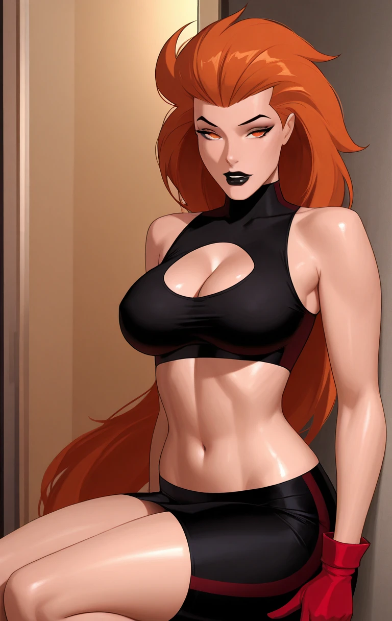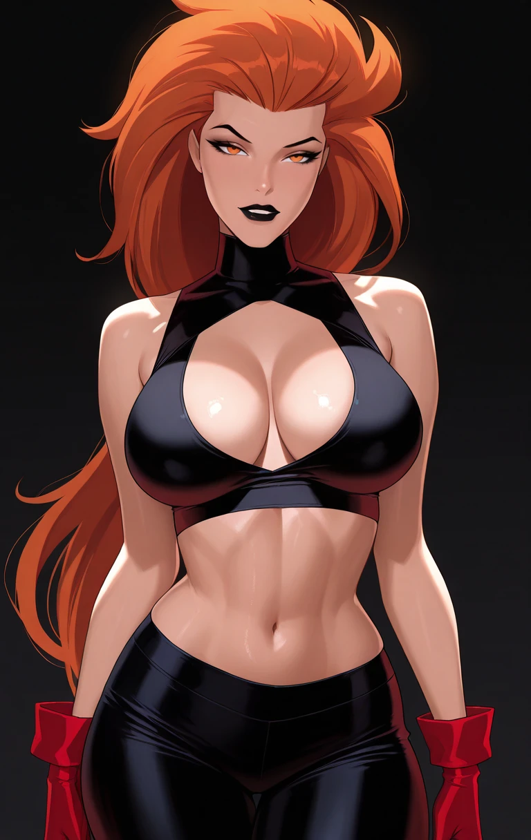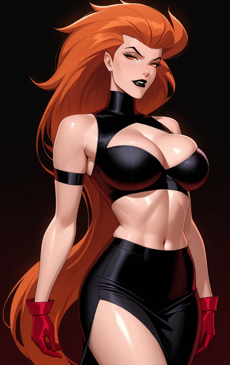 v0lc4n4, 1girl, solo, long hair, breasts, looking at viewer, large breasts, gloves, navel, cleavage, bare shoulders, medium breasts, standing, orange hair, orange eyes, black background, midriff, crop top, lips, turtleneck, black skirt, red gloves, black lips, high-waist skirt, black crop top