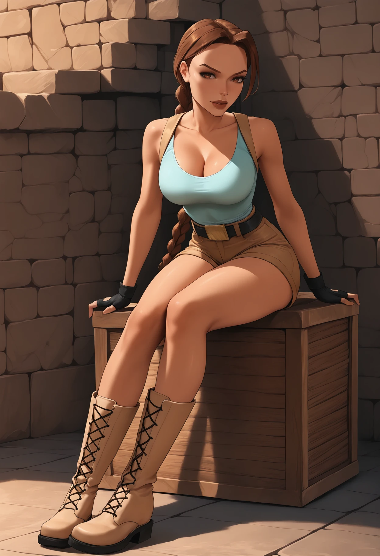 1girl, solo, brown eyes, long hair, brown hair, braid, single braid, breasts, large breasts, lips, bare shoulders, collarbone, taut clothes, blue shirt, taut shirt, shirt, tank top, cleavage, gloves, fingerless gloves, black gloves, belt, shorts, brown shorts, short shorts, holster, thigh holster, backpack, bag, boots, brown footwear,