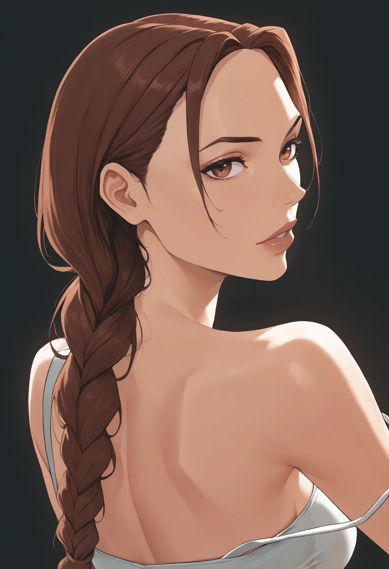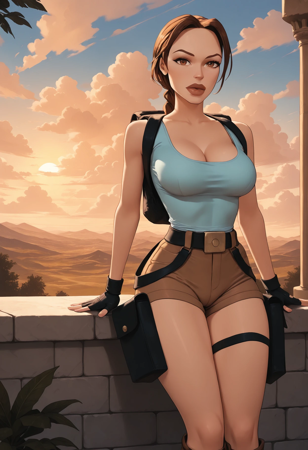 main tags: 1girl, solo, brown eyes, long hair, brown hair, braid, single braid, breasts, large breasts, lips, bare shoulders, collarbone, taut clothes, blue shirt, taut shirt, shirt, tank top, cleavage, gloves, fingerless gloves, black gloves, belt, shorts, brown shorts, short shorts, holster, thigh holster, backpack, bag, boots, brown footwear,