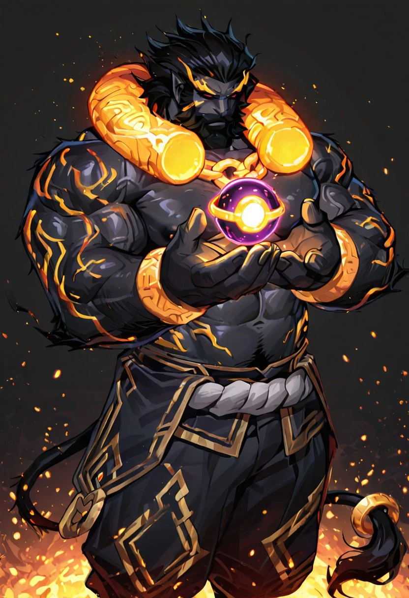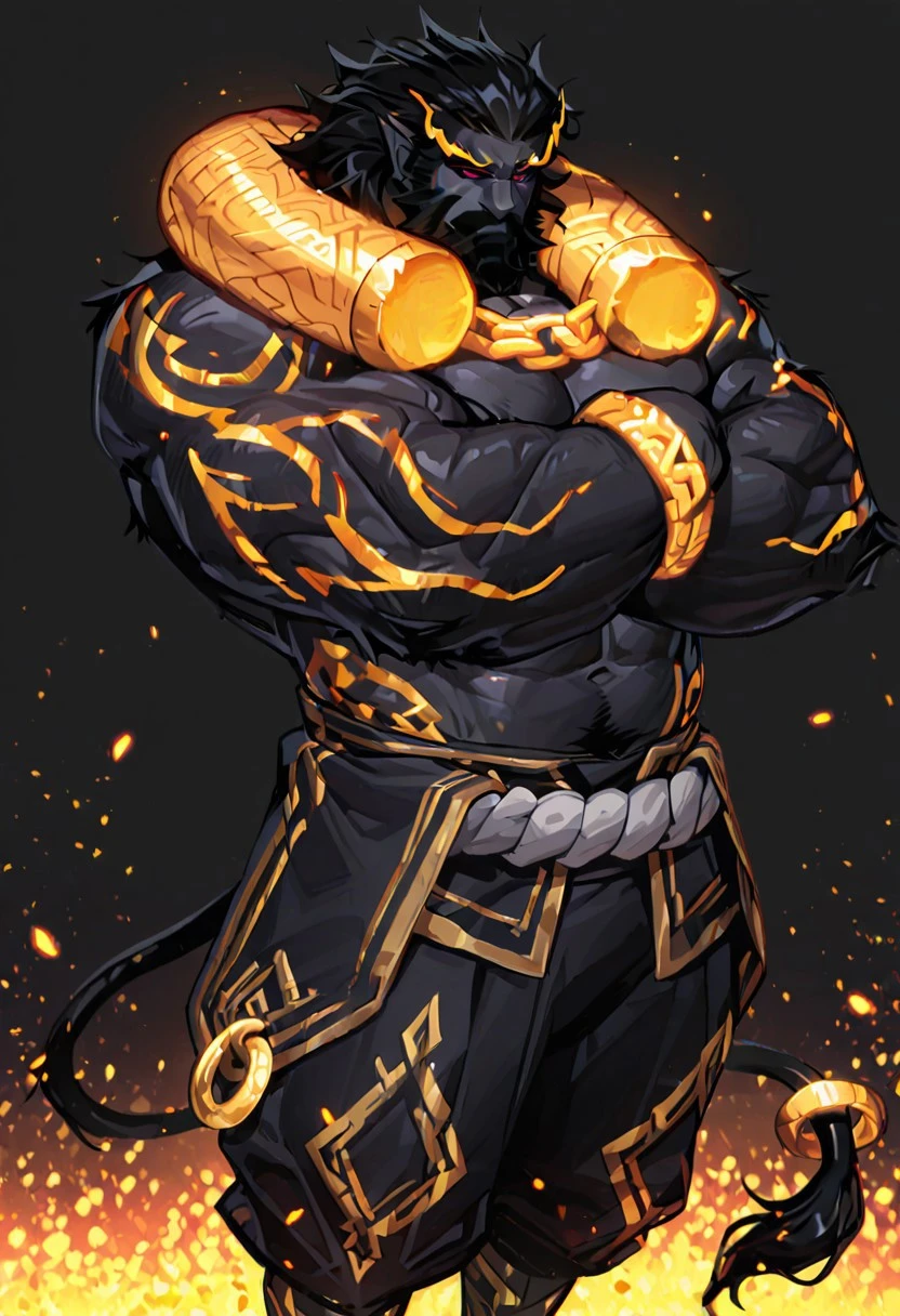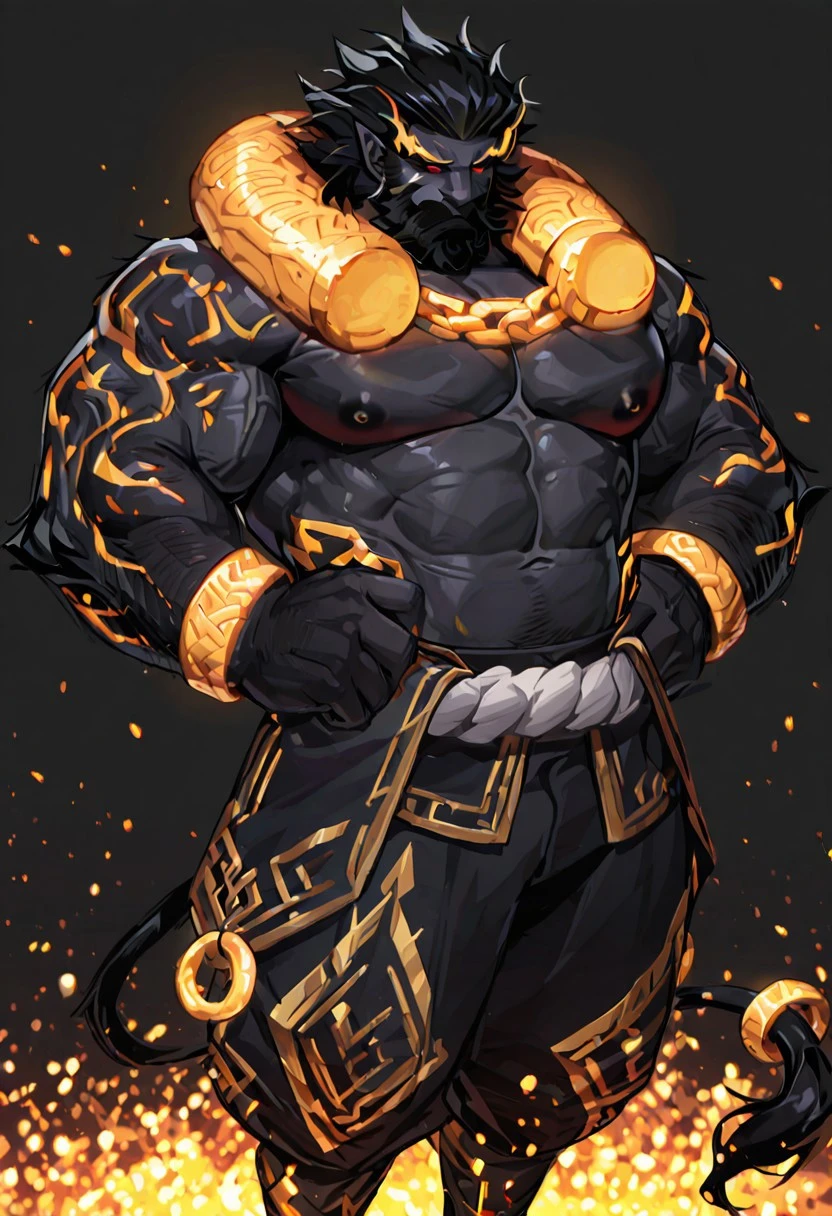 Prompt:hyunmoo, Golden eyebrows, red eyes, no pupils, black hair, tail, tail ring, male focus, chain, bracelet, Facial scars, muscular, facial hair, hairy, beard, Thick whiskers, Thick beard, Thick sideburn, black pants, muscular, mature male, monster boy, black skin, Elf Ear,