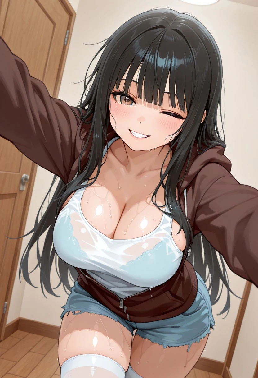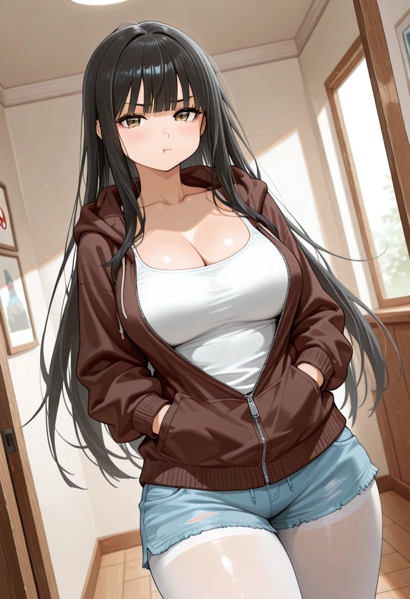 gadboungir ,1girl , black hair , long hair ,very-long hair , fringe bangs , brown eyes , brown hoodie , white top tank , zip-up hoodie , unzipped hoodie , Jean shorts , light-blue shorts , white thighband