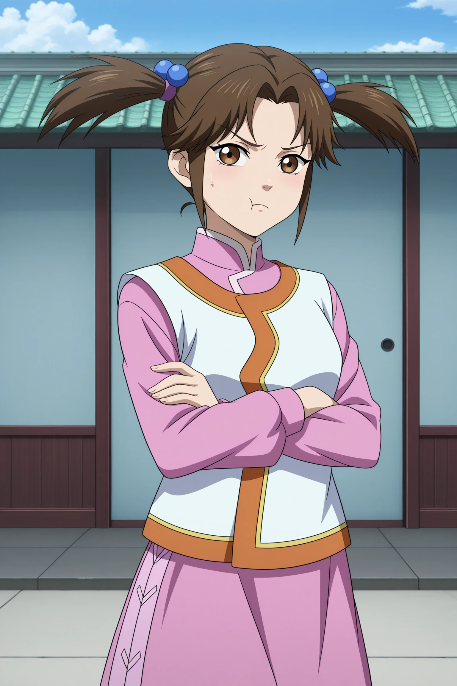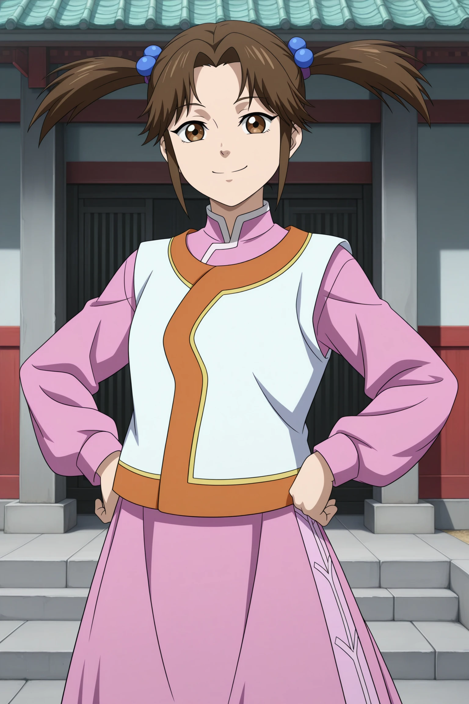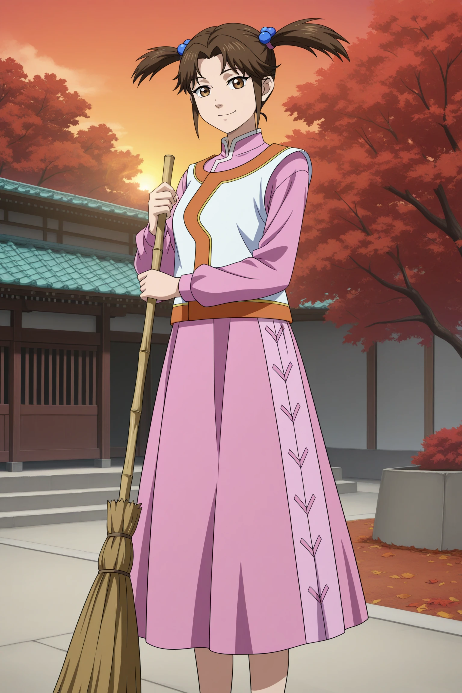 xun fengmei, short hair, brown hair, twintails, hair tie, hair bobbles, sidelocks, curtained hair, brown eyes, long sleeves, pink shirt, mandarin collar, white vest, pink skirt, long skirt, black footwear