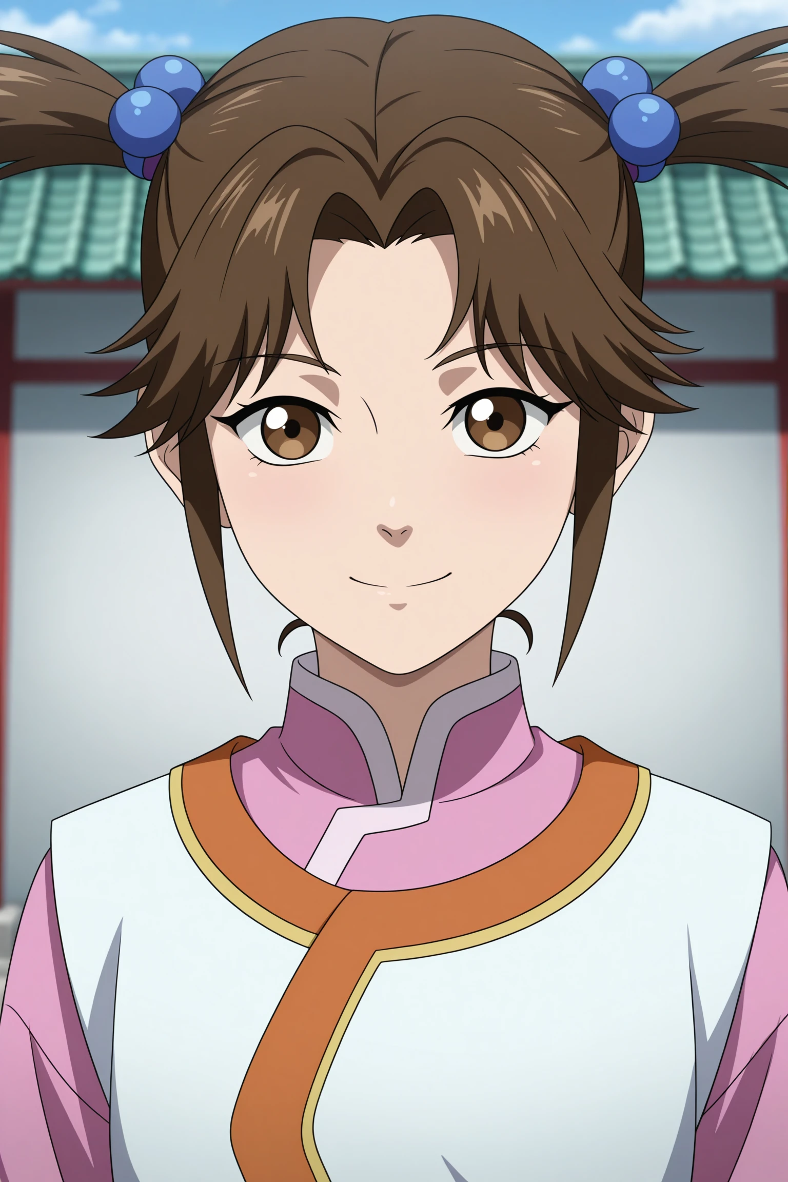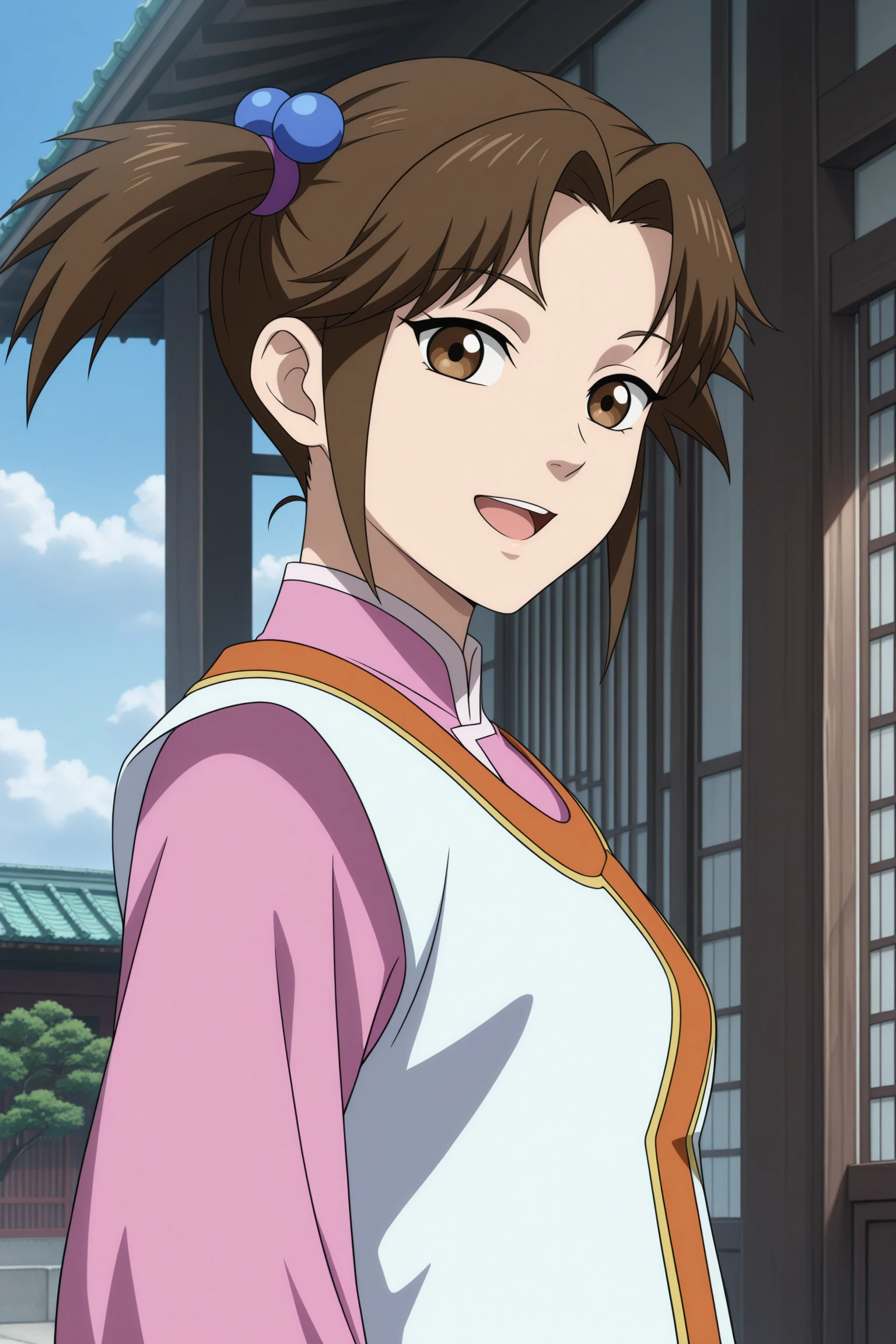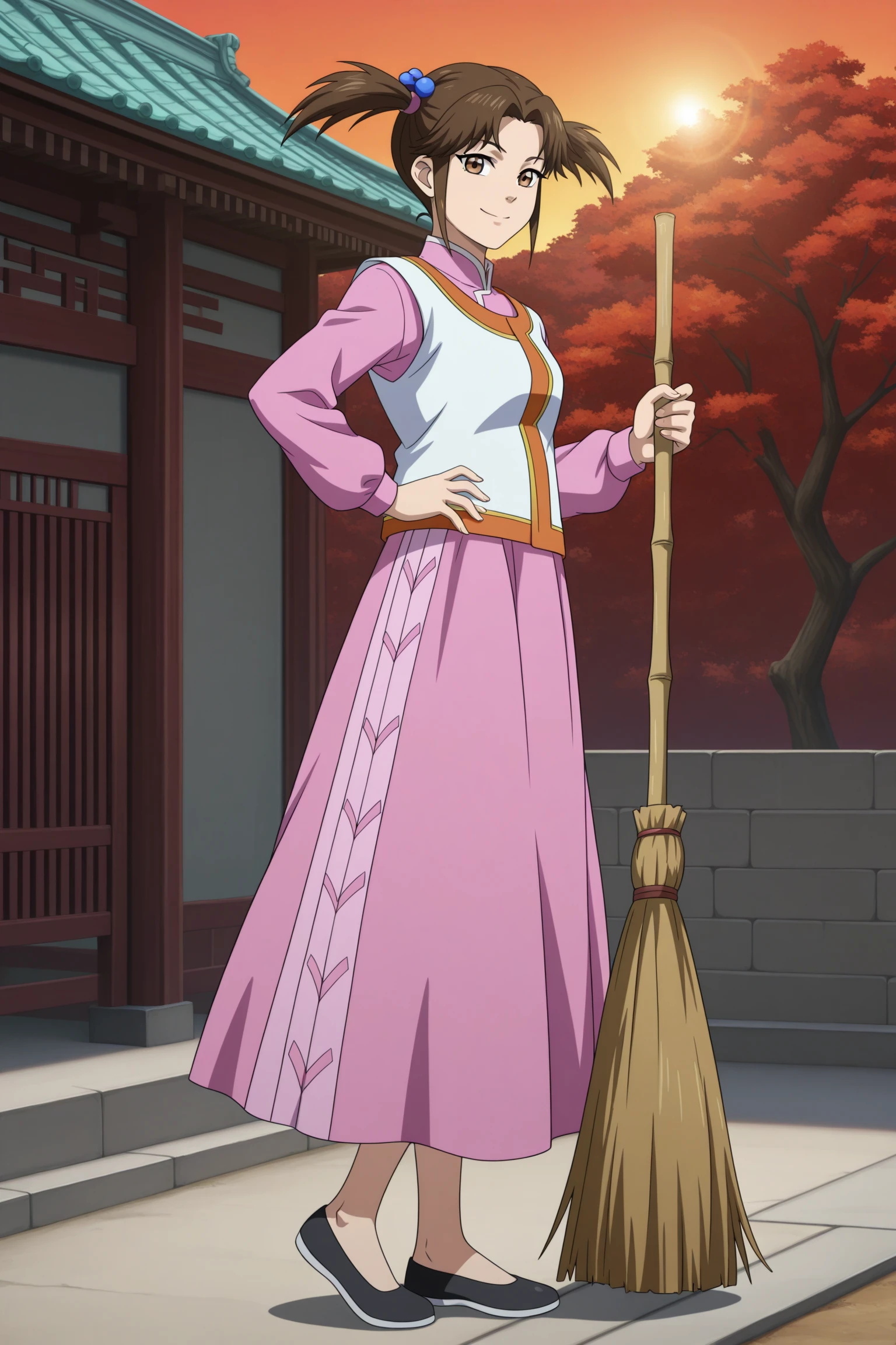 xun fengmei, short hair, brown hair, twintails, hair tie, hair bobbles, sidelocks, curtained hair, brown eyes, long sleeves, pink shirt, mandarin collar, white vest, pink skirt, long skirt, black footwear