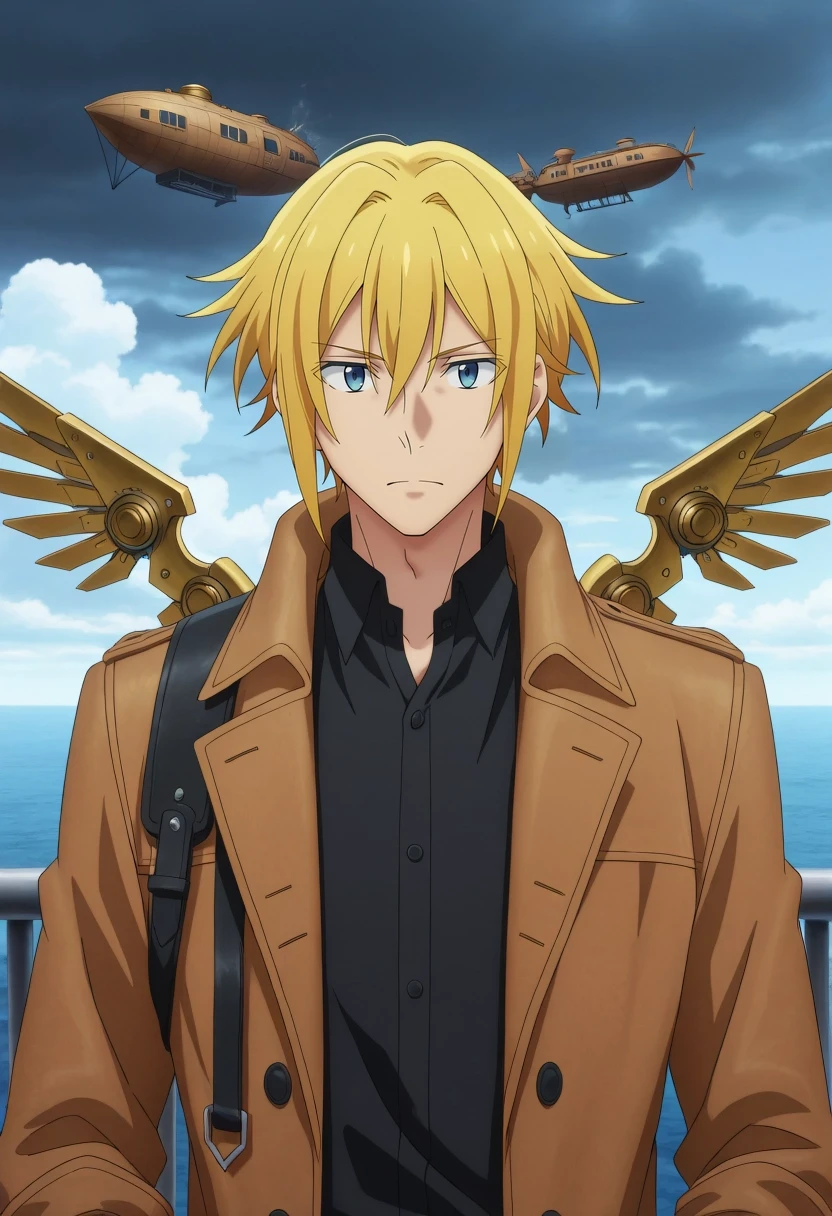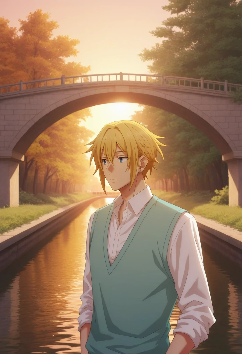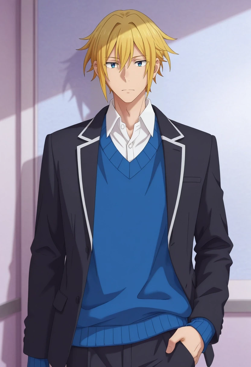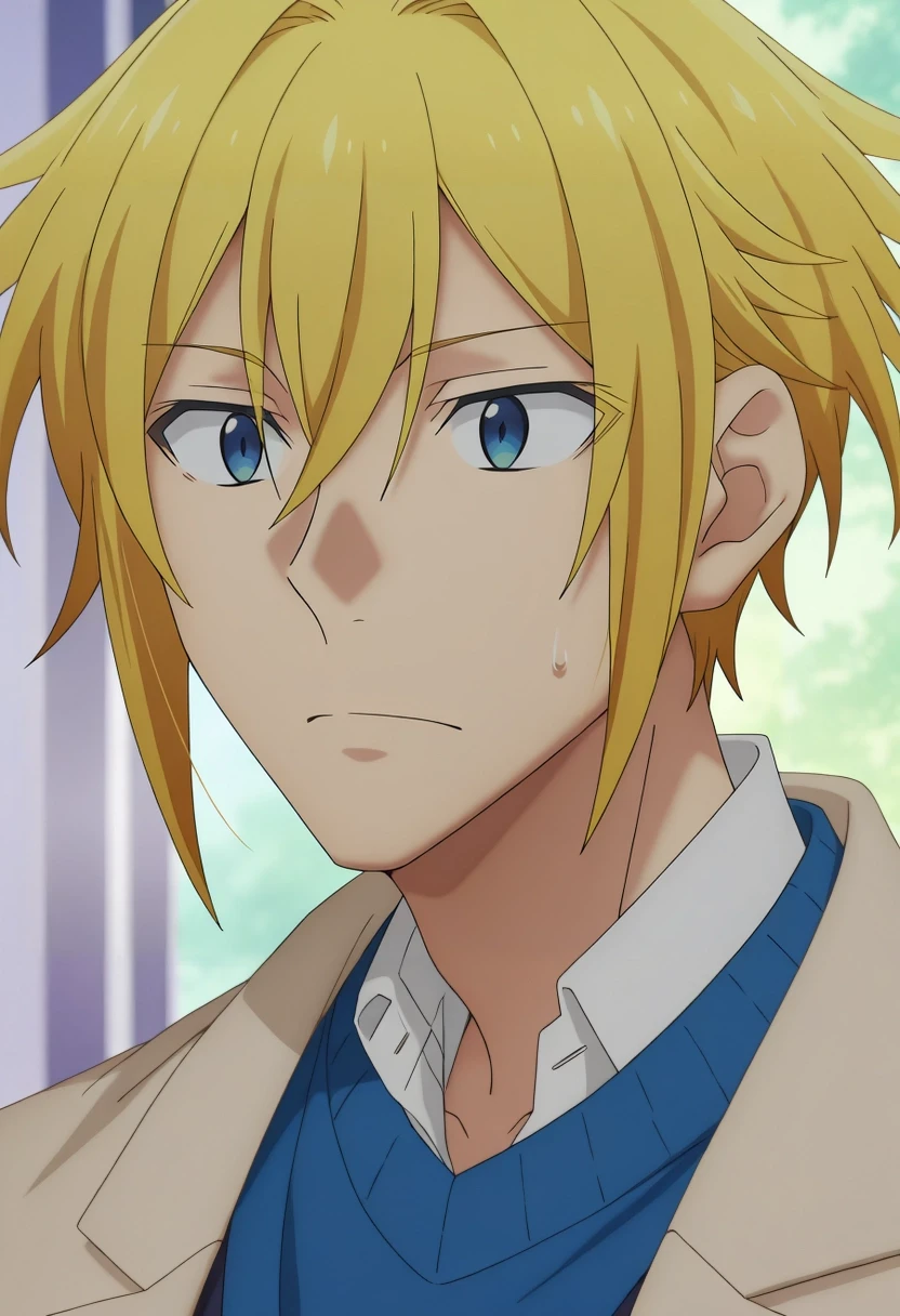 taiga_hirano, blonde hair, blue eyes, short hair, hair between eyes, {white shirt, collared shirt, {green vest|{black jacket|yellow jacket}, blue sweater|}||}