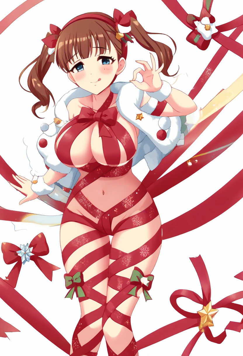 <lora:ctur_tinmehas_hio_uekifdgdfg24:0.8>, red ribbon, ribbon, bow,red bow, ctur_tinmeas_hio_uekdfg66, fur trim, star (symbol), ctur_tnmeas_hio_uekgdfg44, snowflake print, navel,cleavage,