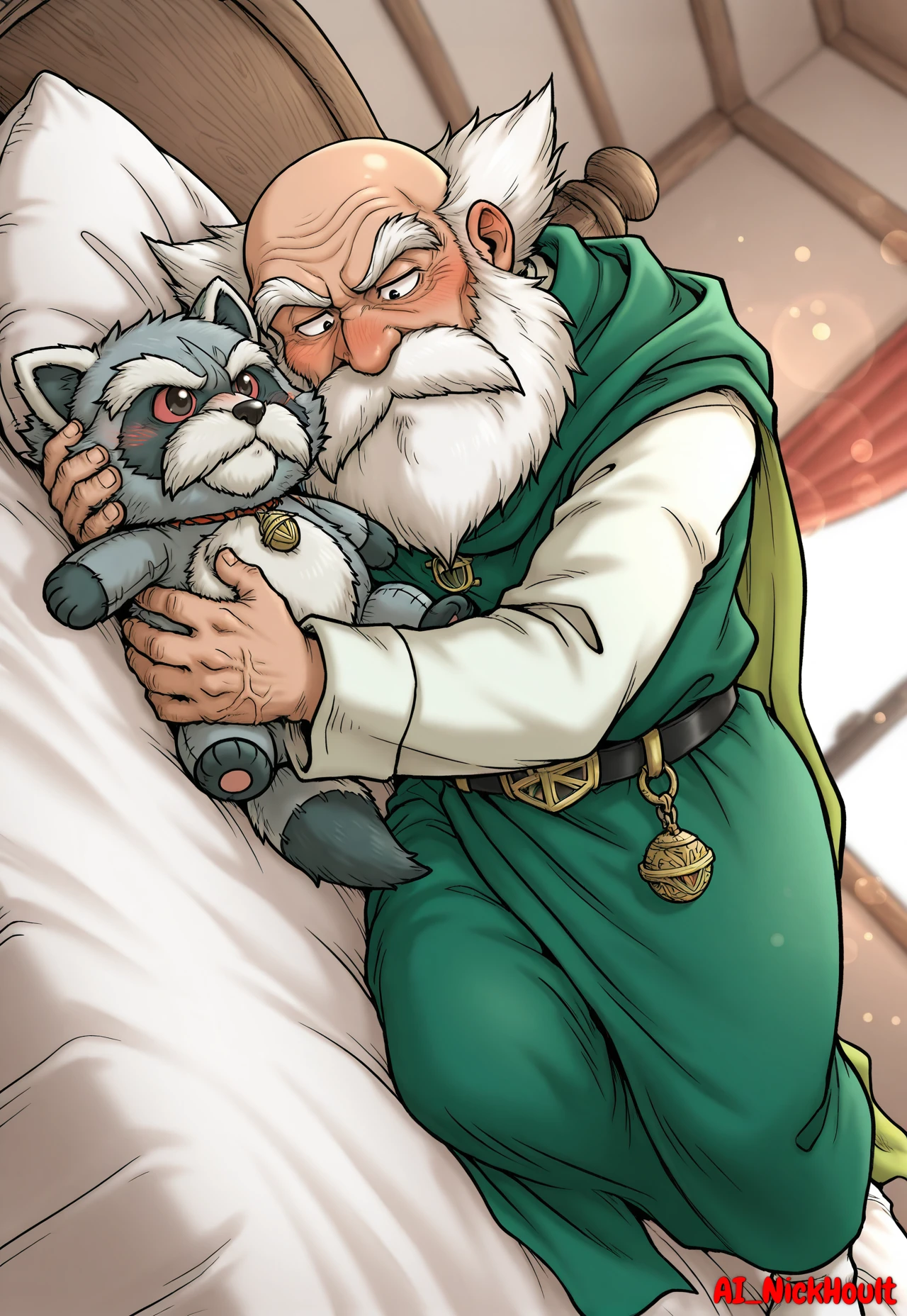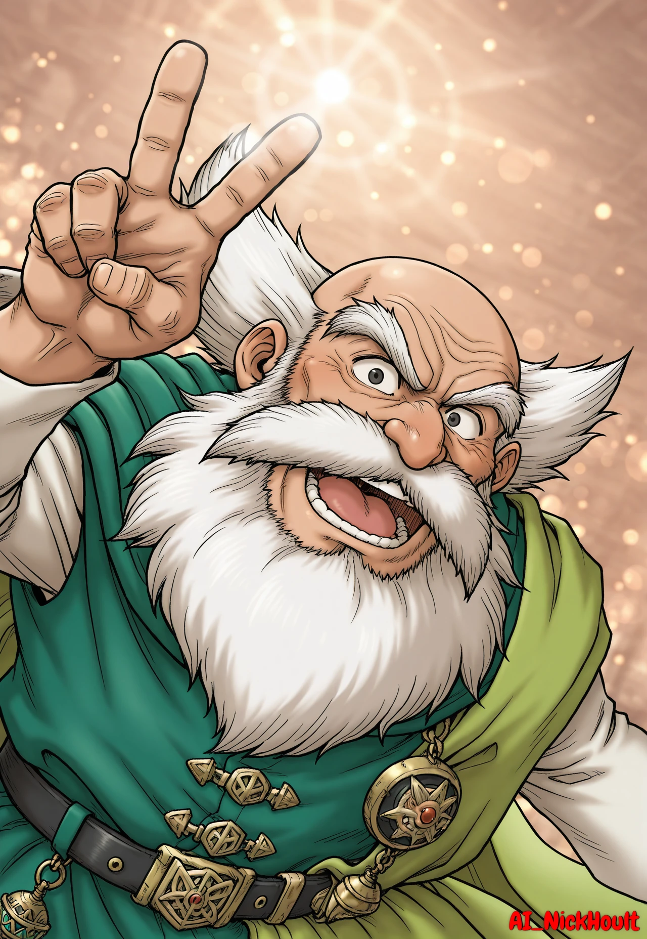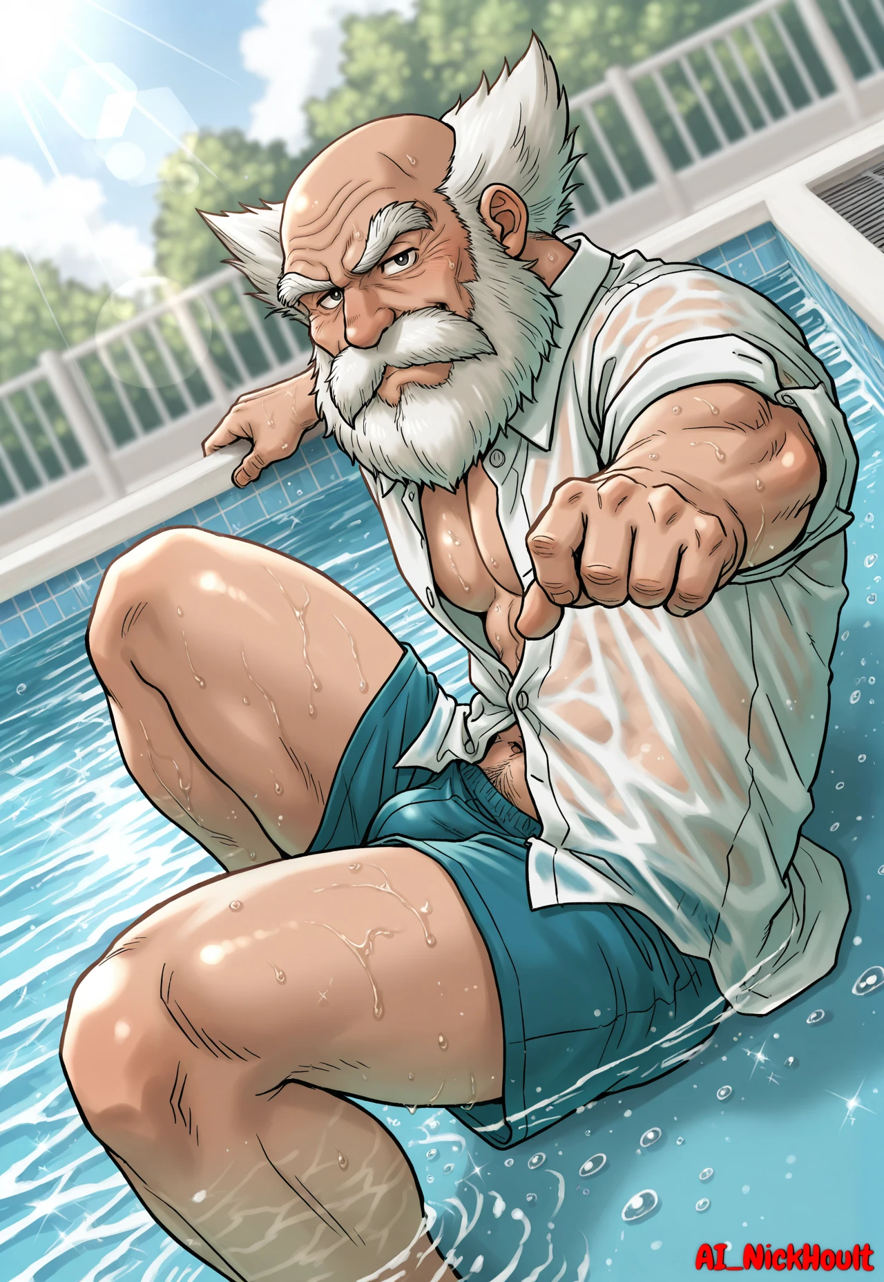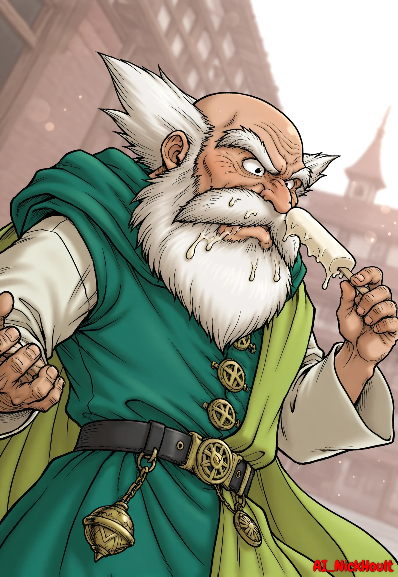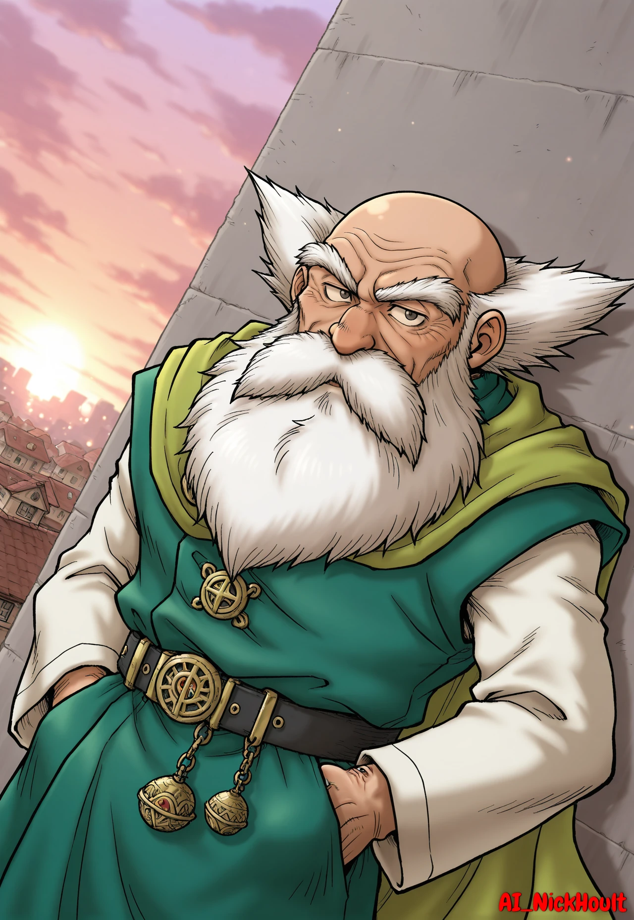 Borya, old man, bald head, short white hair, large bushy mustache, bushy eyebrows, long bushy beard, black eyes,