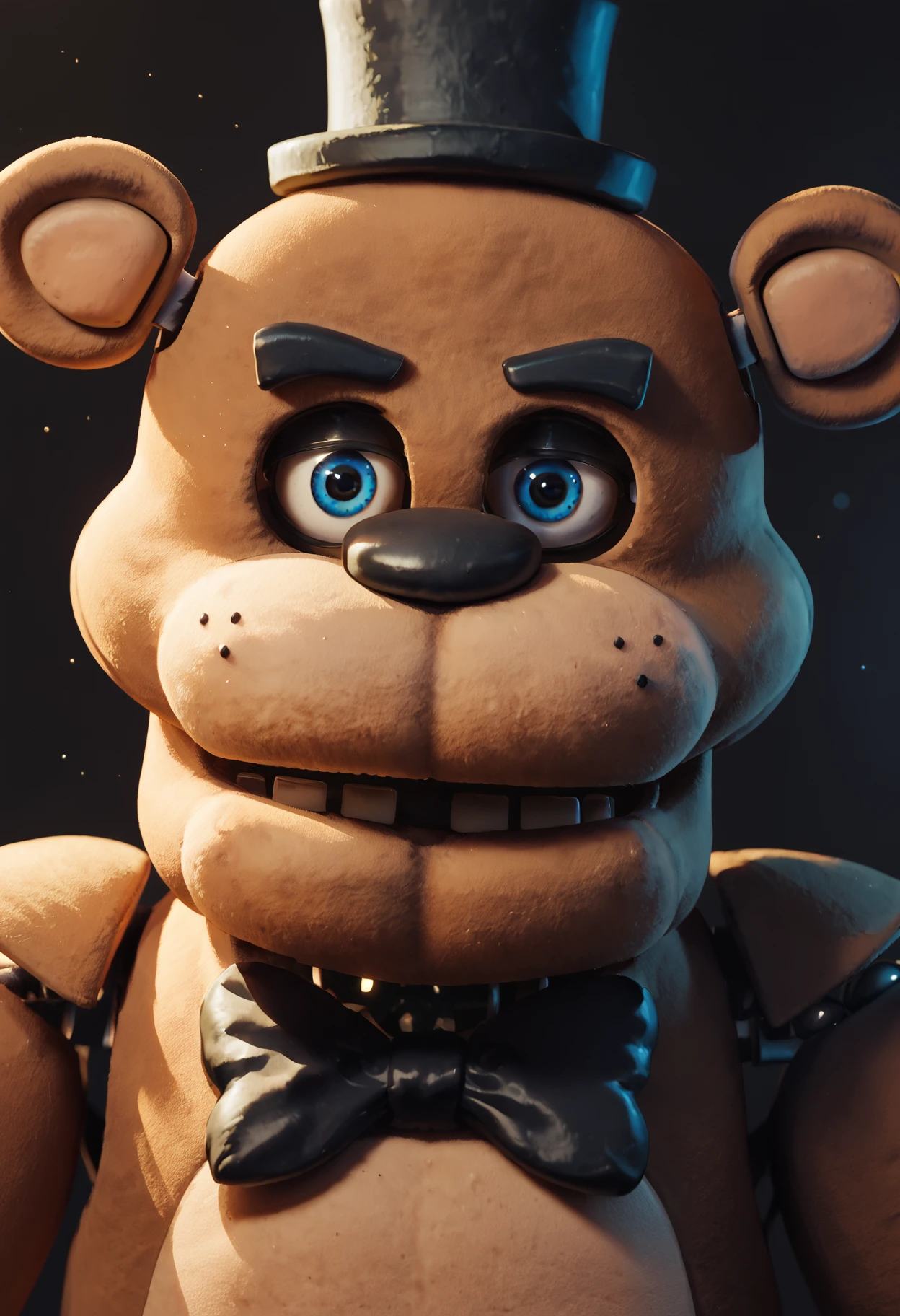 freddyfazbear, animatronic, brown fur, blue eyes, black bowtie, black top hatGolden Freddy
