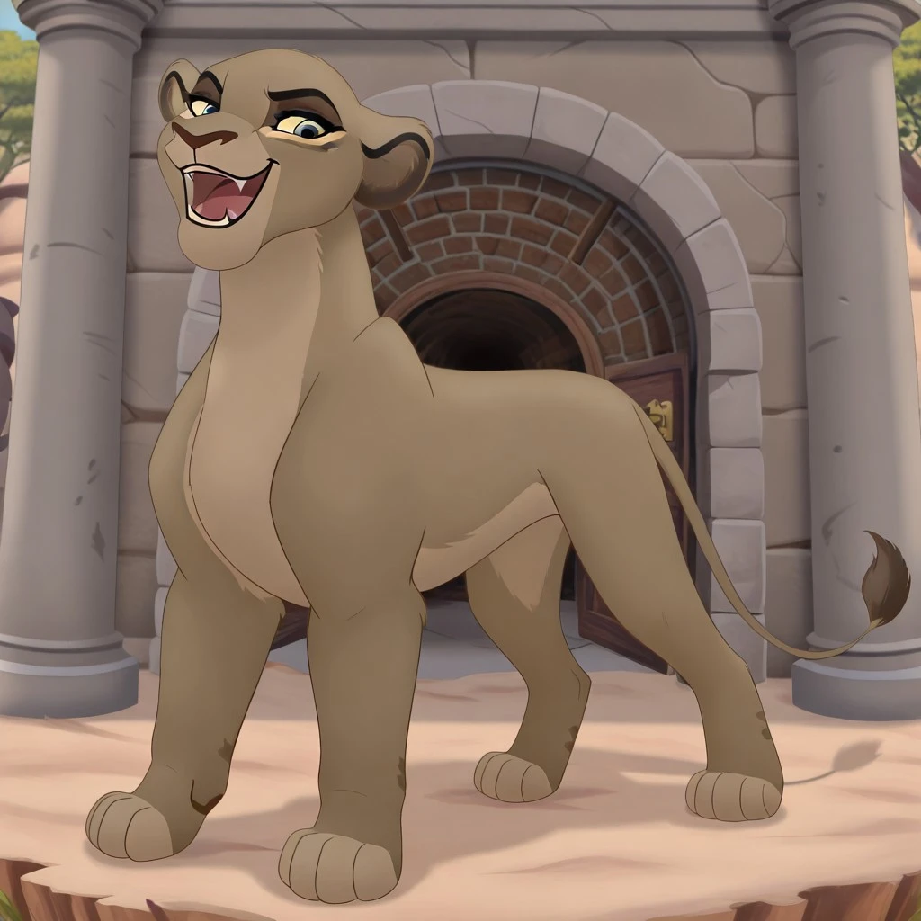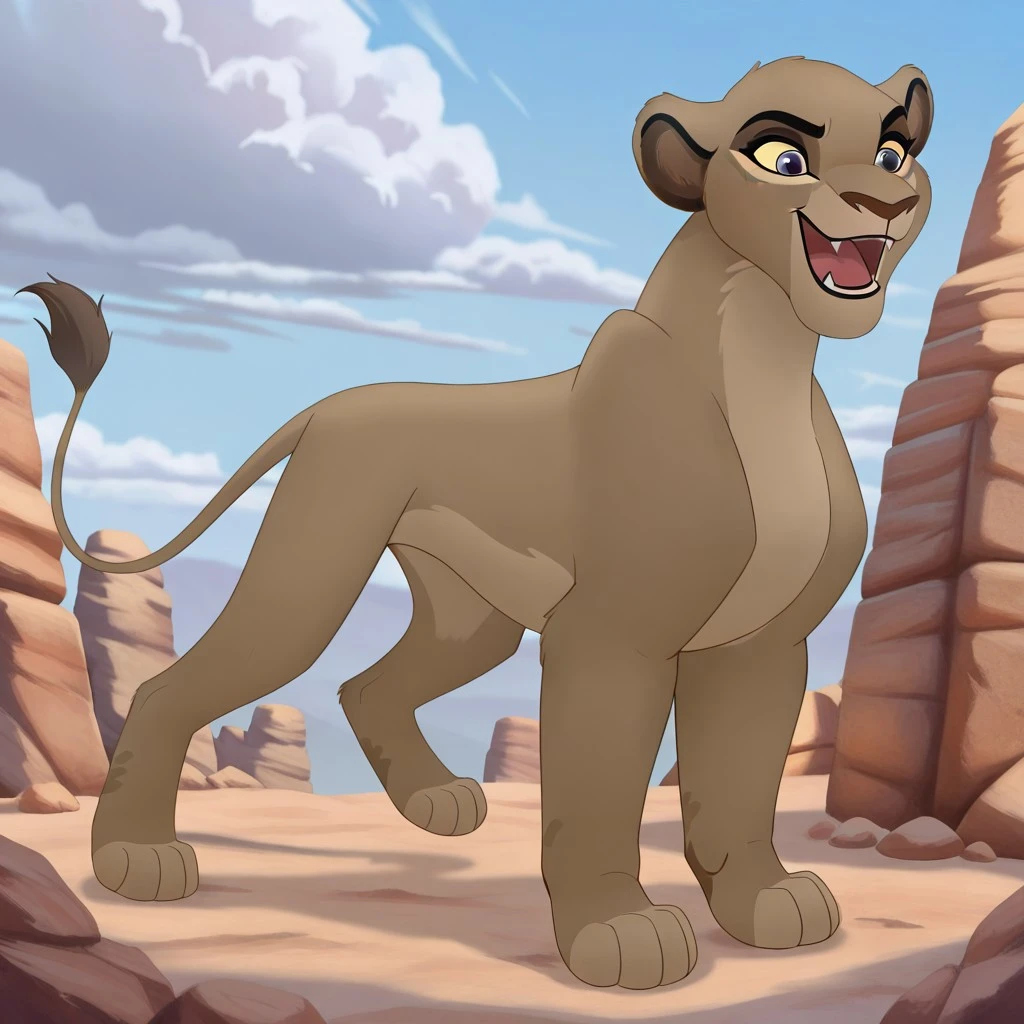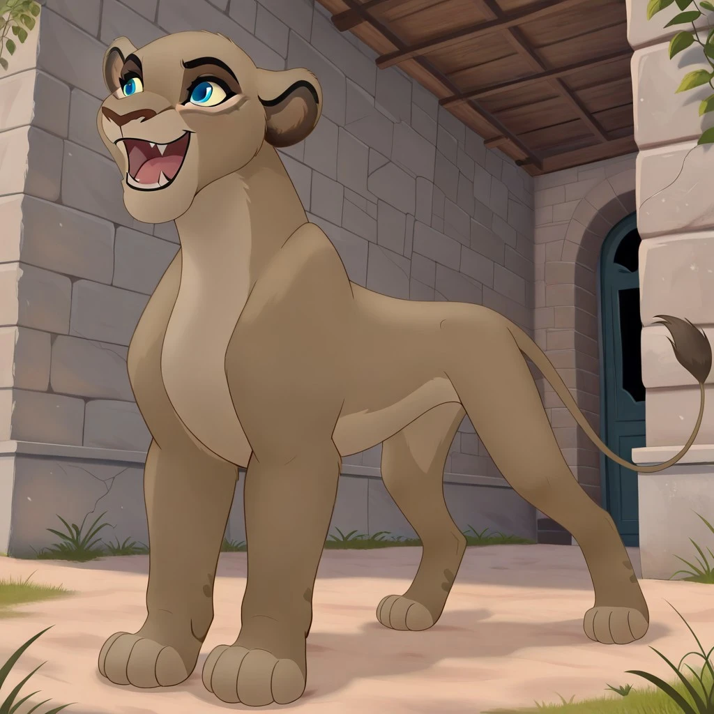 imara, female, feral, lioness, brown-gray fur, dark ear rims, dark blue eyes, leg markings, lion tail, muscular build
