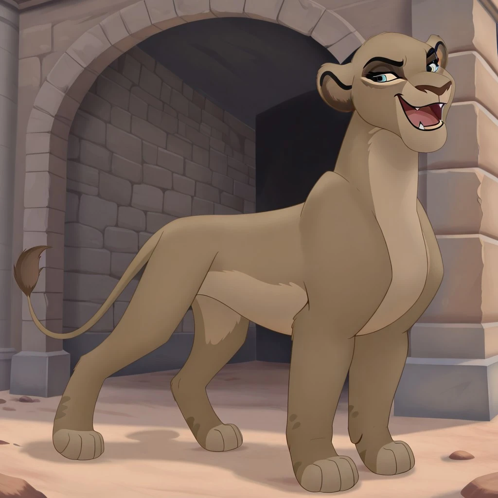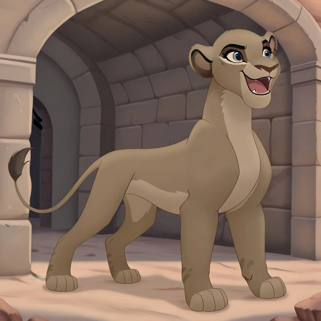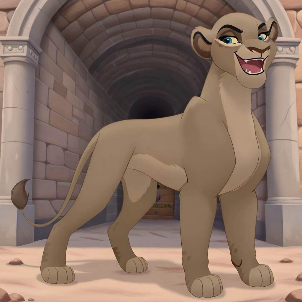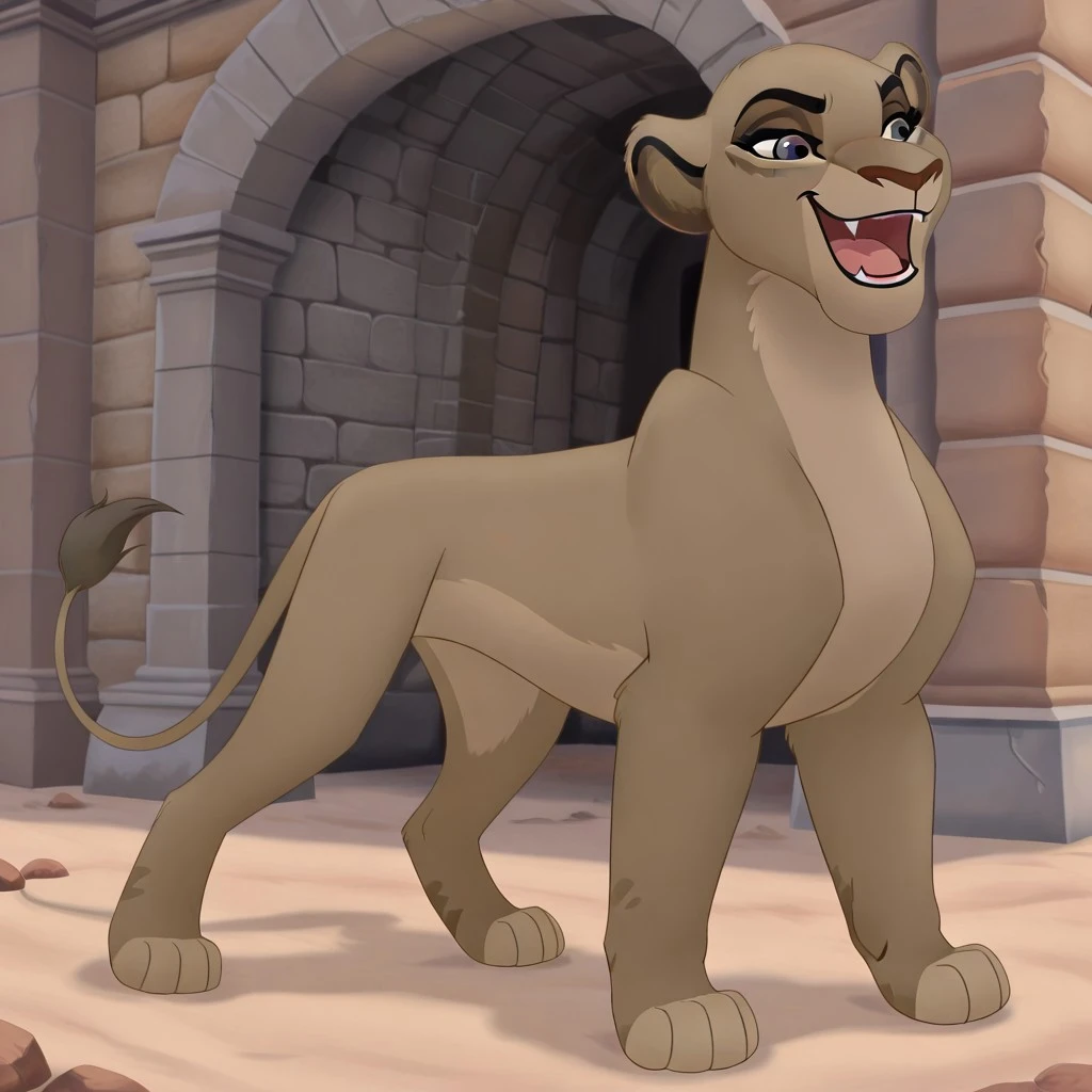 imara, female, feral, lioness, brown-gray fur, dark ear rims, dark blue eyes, leg markings, lion tail, muscular build