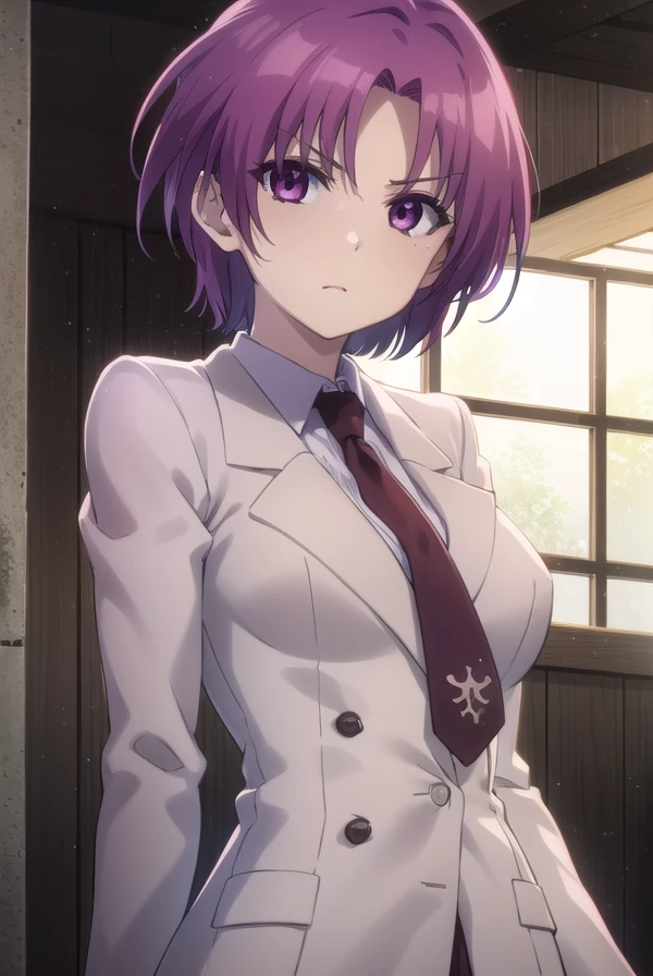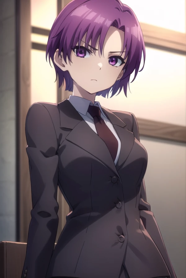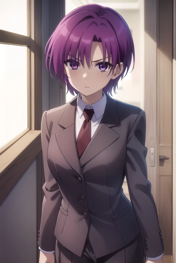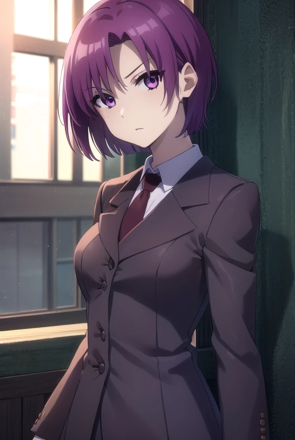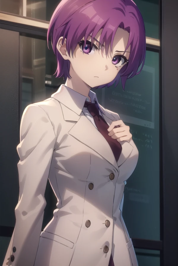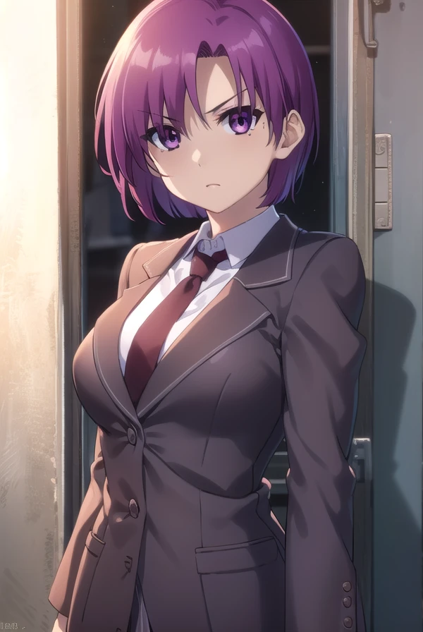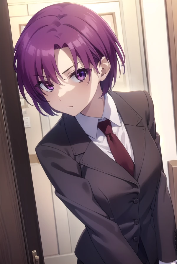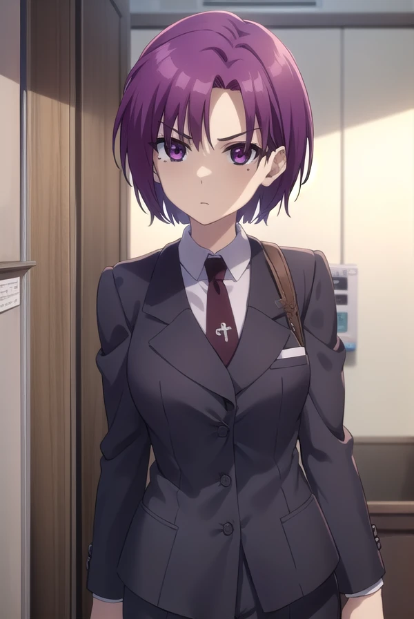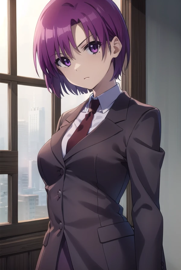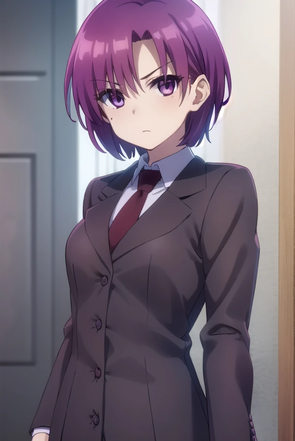 bazett fraga mcremitz, short hair, (purple eyes:1.1), purple hair, mole, mole under eye,