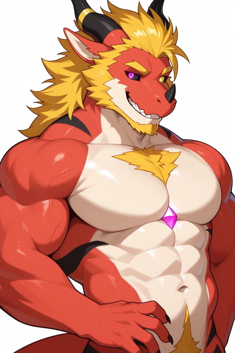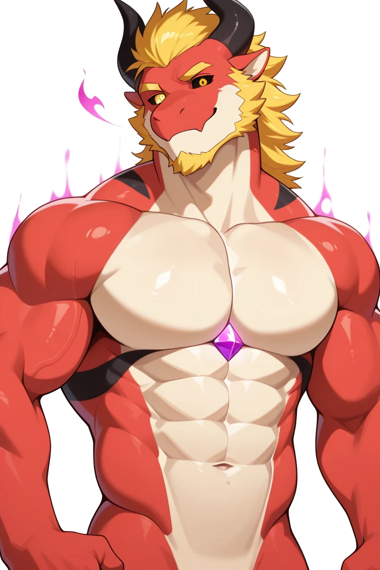 masterpiece, best quality, very awa, newest, absurdres, score_9, score_8_up, score_8, hi res, detailed hands, detailed face, detailed eyes, detailed skin, detailed background, detailed foreground, best quality, amazing quality, very aesthetic, high resolution, ultra-detailed, absurdres, highest detailed, explicit, handsome, naughty, high res, best quality, perfect body, perfect anatomy, correct anatomy, perfect proportions, perfect anatomy, golden ratio, athletic, confident, enjoy, naughty, 8k, anime coloring, digital art, highly detailed, sharp focus, incredibly beautiful background, Natural muscular male enhancer, countershading, athletic, bulky pec, confident, manly, natural muscular body building, macho, Winston Khalem, 1boy, solo, furry, male focus, handsome, mature male, anthro dragon, red skin, light underbelly, black horns, black sclera, heterochromia eyes, magenta eyes, yellow eyes, yellow mane, yellow hair, yellow eyebrows, ghost body, unstable body, jewel chest, yellow beard, ghost tail, no legs, no tail, muscular male, handsome, muscular body, natural fitness body building, thick arms, no nipple, bara,