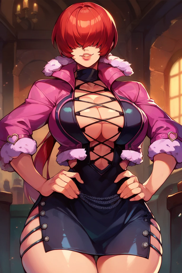 pink jacket, cropped jacket, fur trim, clothing cutout, cleavage cutout, black dress, jewelry, knee boots
