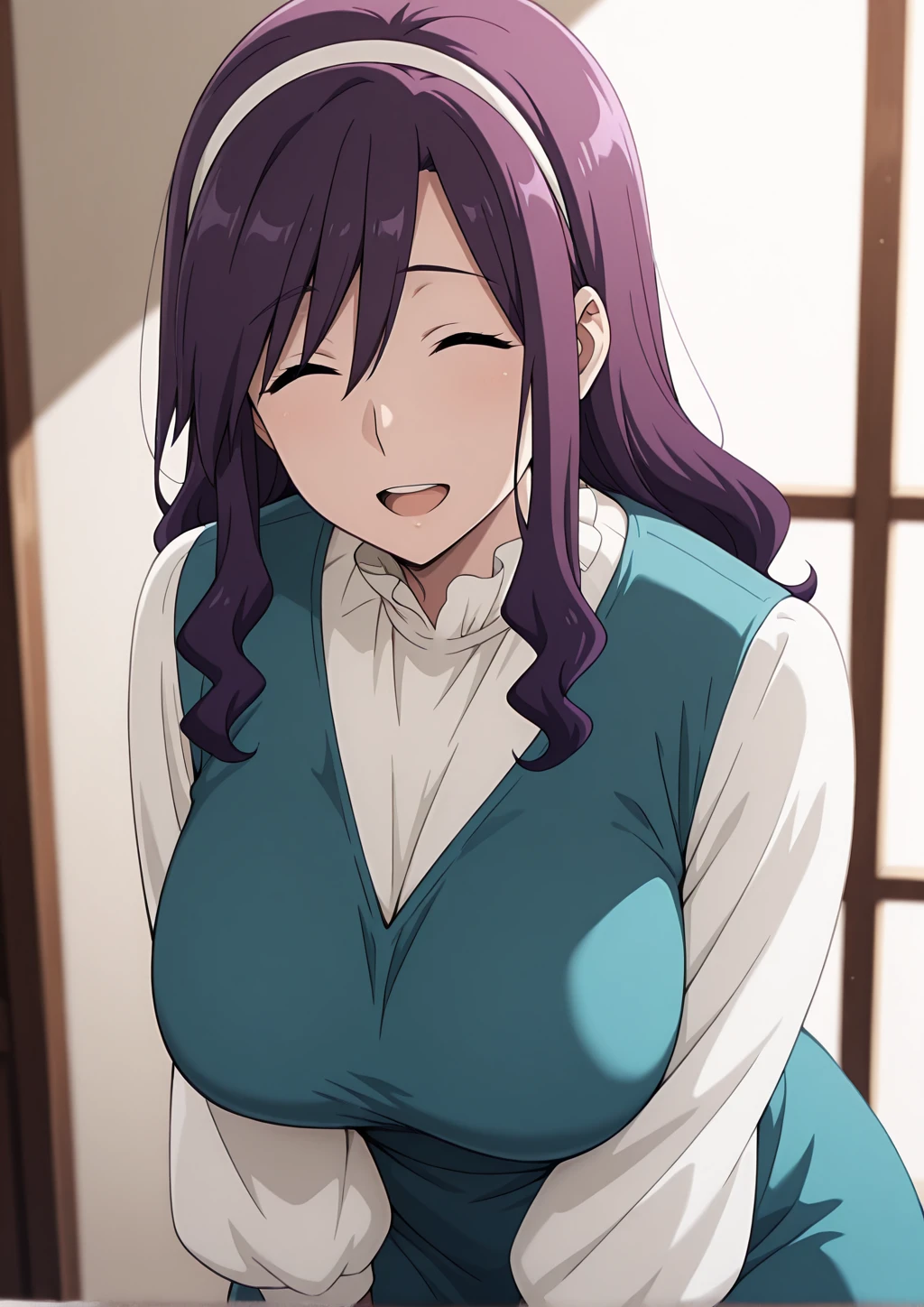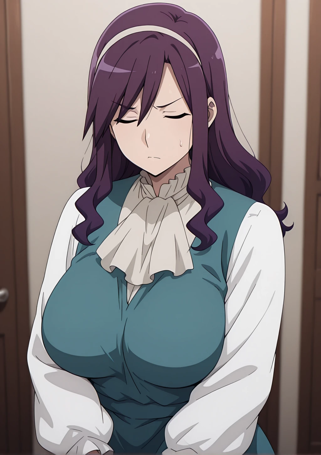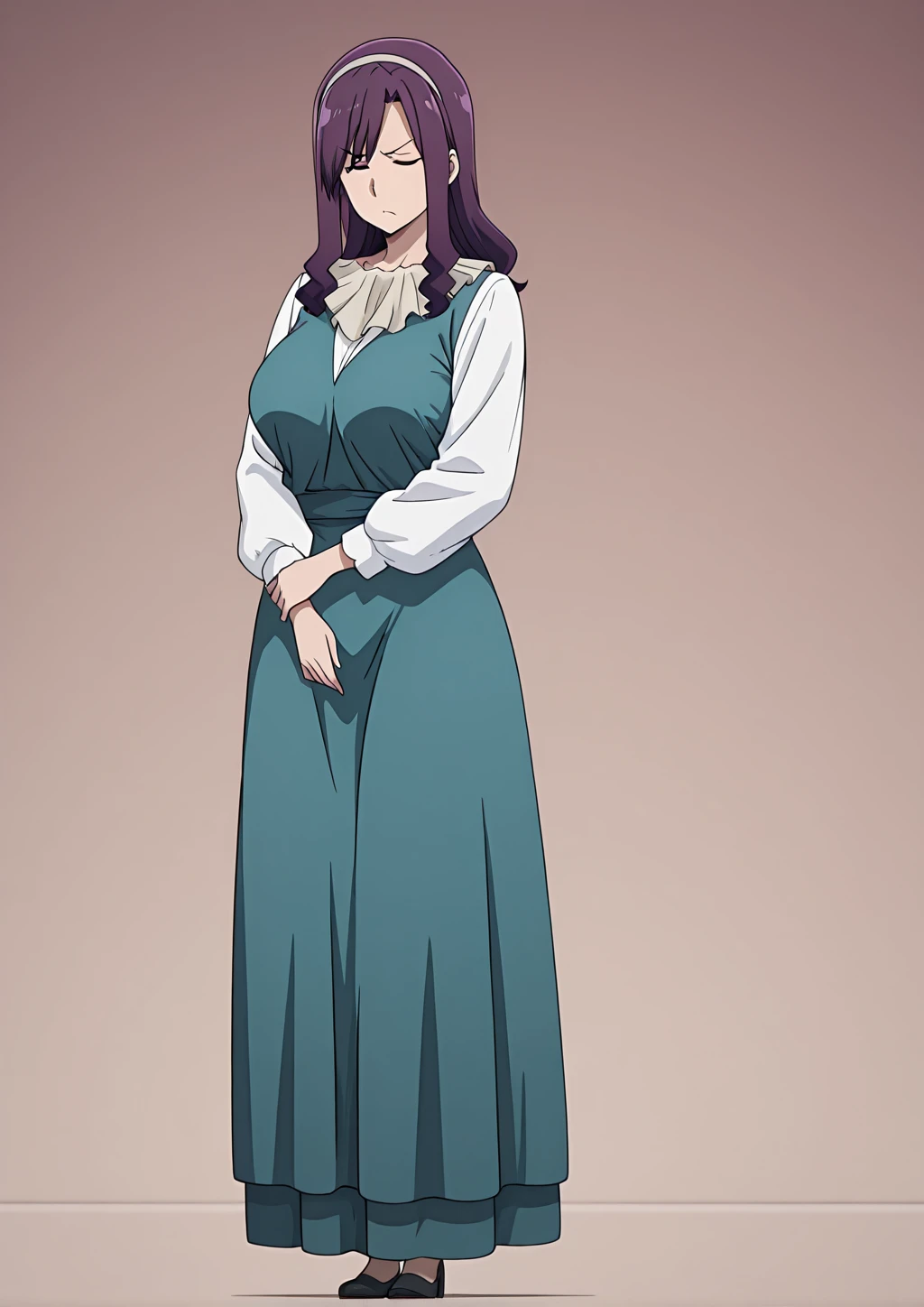 teal dress, white sleeves, neck ruffle, purple hair, long hair, hair band,