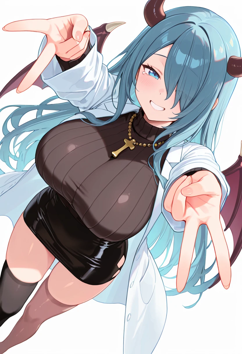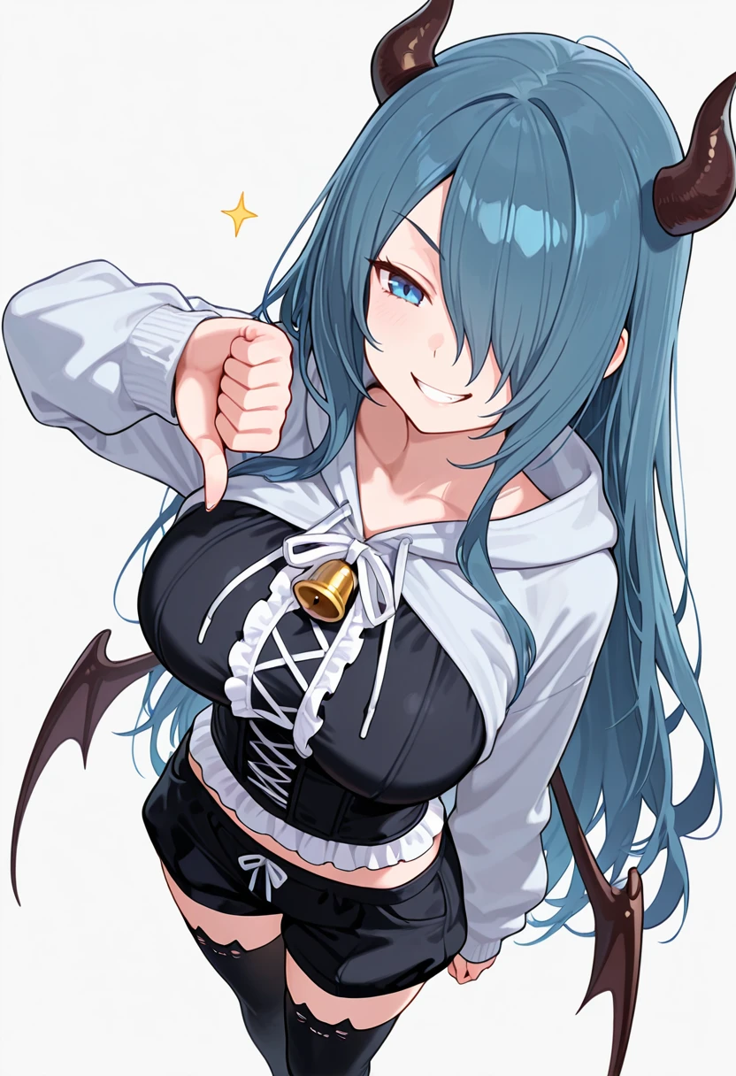 rosary_cnr, 1girl,blue hair, hair over one eye, blue eyes, ?????????????, horns, demon girl,demon wings, very long hair,