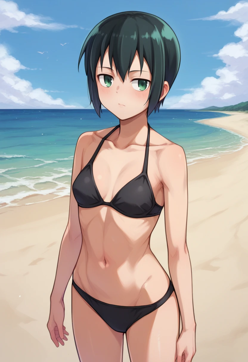 kinoSDXL,1girl,solo,short hair,shirt,black hair,long sleeves,jacket,white shirt,collared shirt,belt,pants,black jacket,gun,black pants,green eyes,pouch,brown belt,holster,belt pouch,tomboy,kino (kino no tabi)