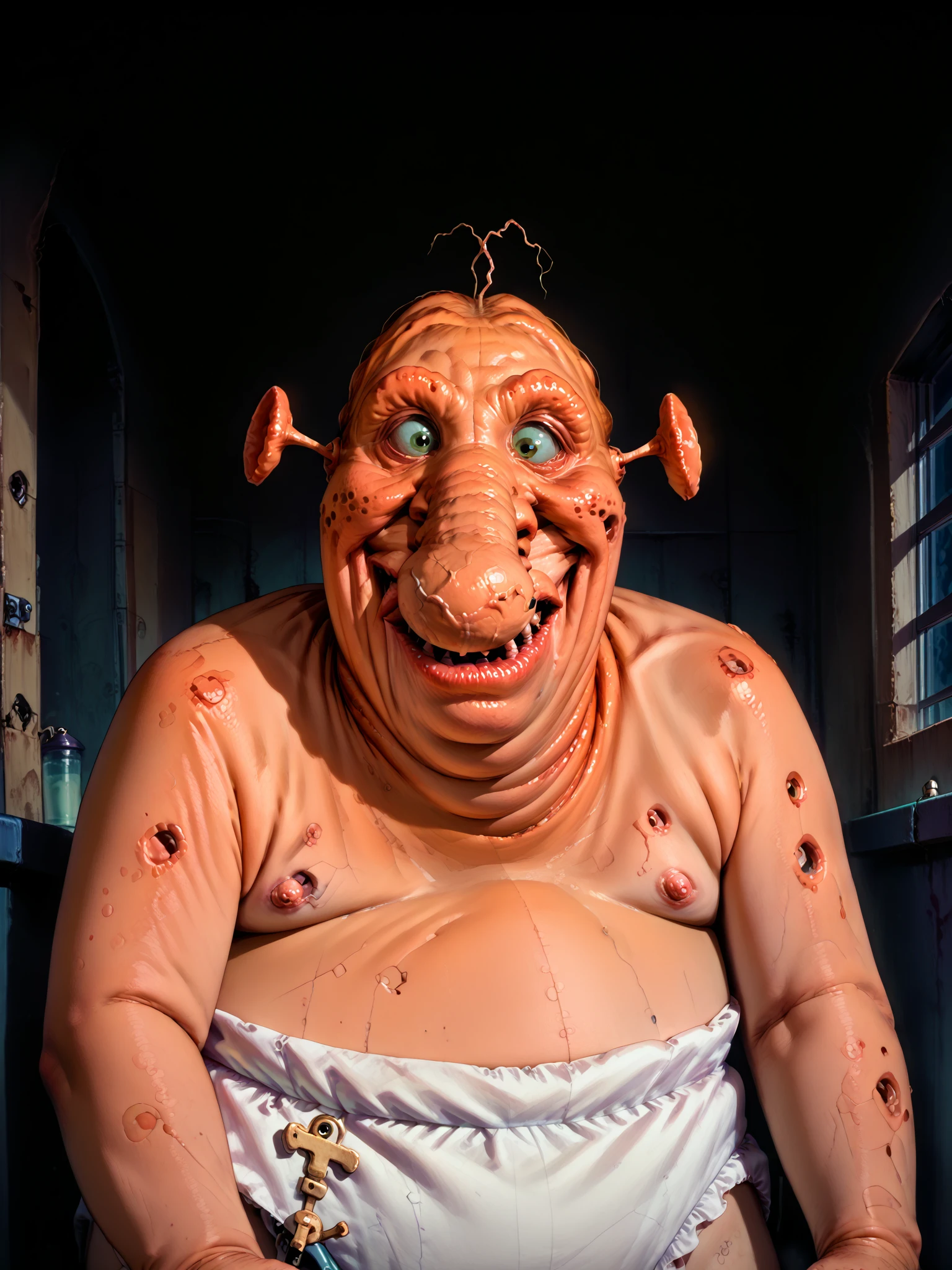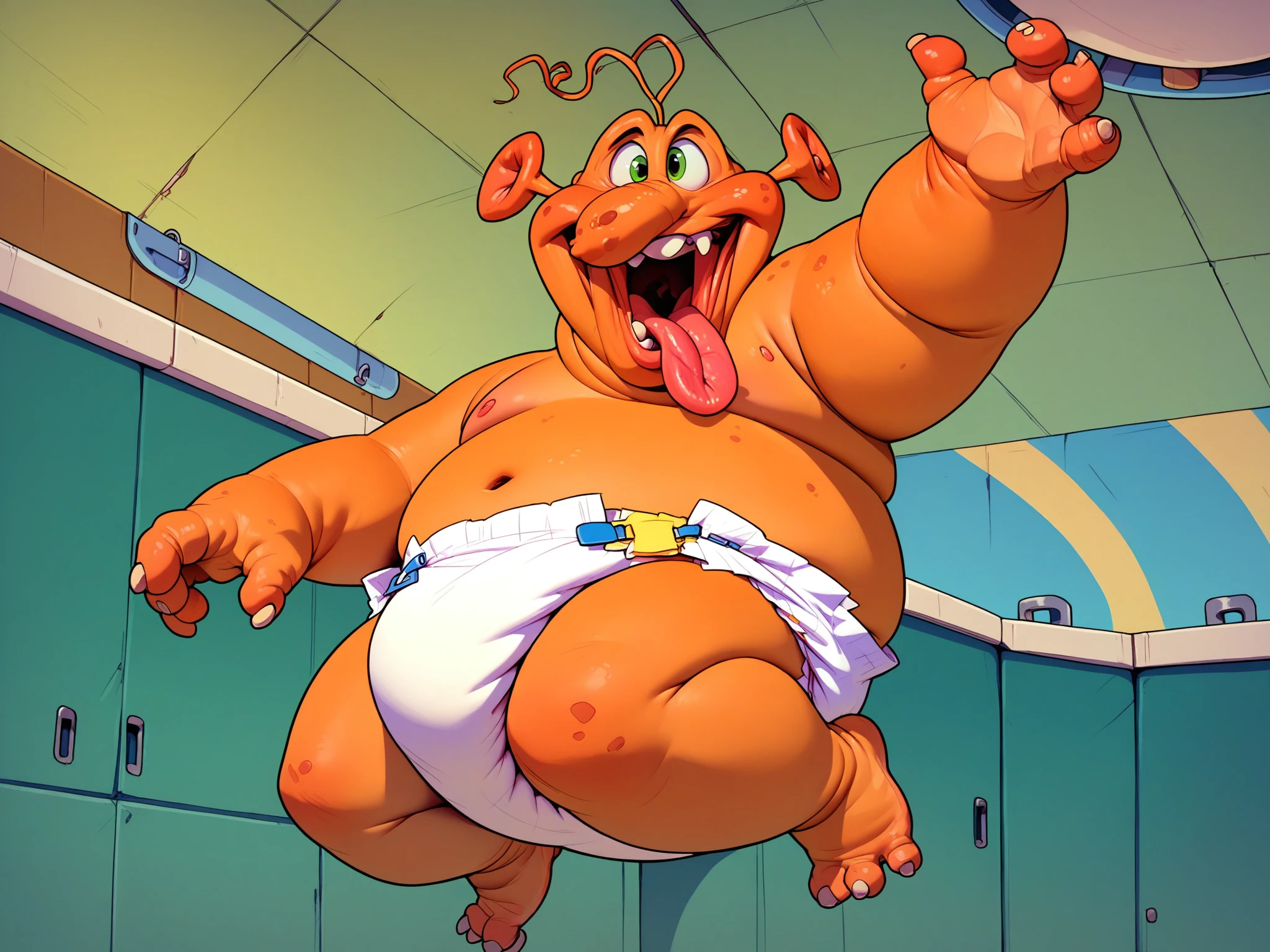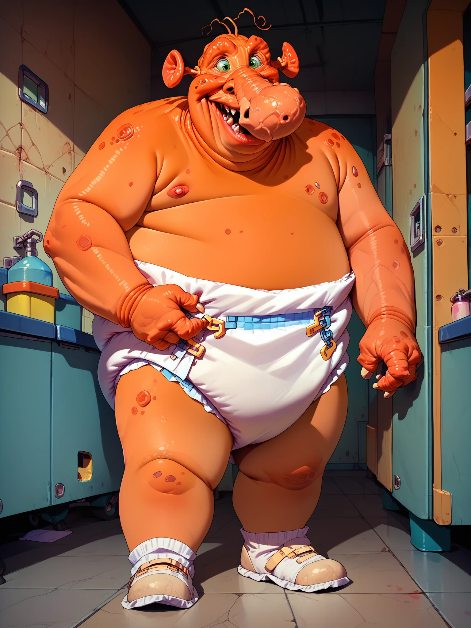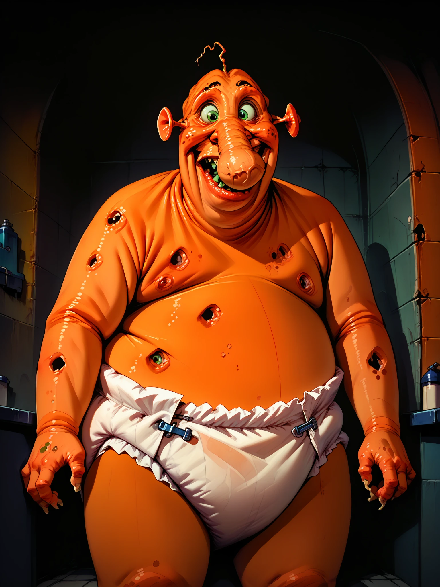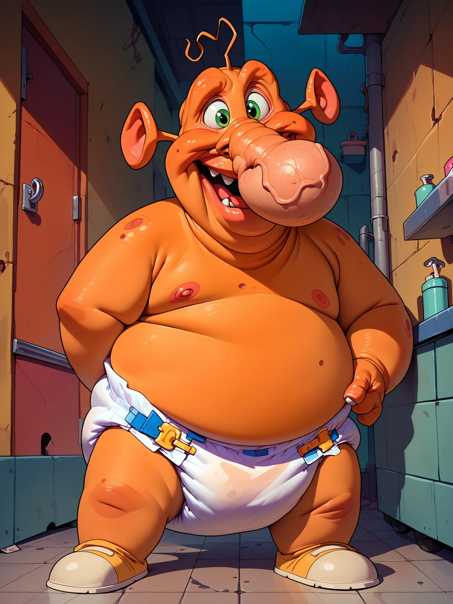 Trigger Tags: zonk, 1boy, solo, ghost, orange skin, ugly, obese, green eyes, warts, large nose, diaper